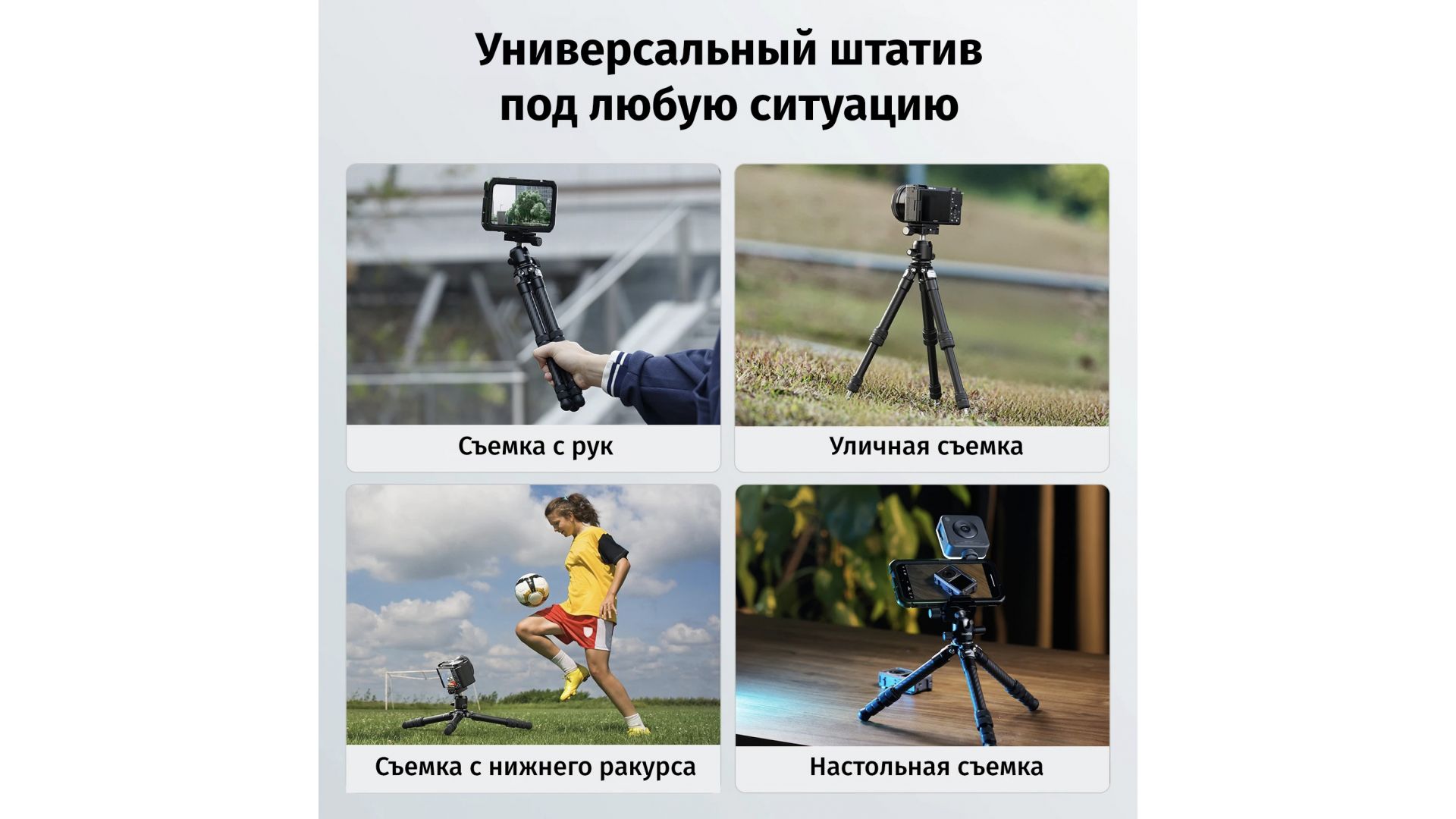 Рабочая высота до 395 мм и универсальное крепление 3/8" обеспечивают гибкость для любых задач: от пейзажей до портретов. Съемный силиконовый колпачок скрывает металлические шипы для надежного сцепления с любыми поверхностями. Это идеальное решение для путешествий и ежедневного использования, где важны каждый грамм и стабильность кадра.