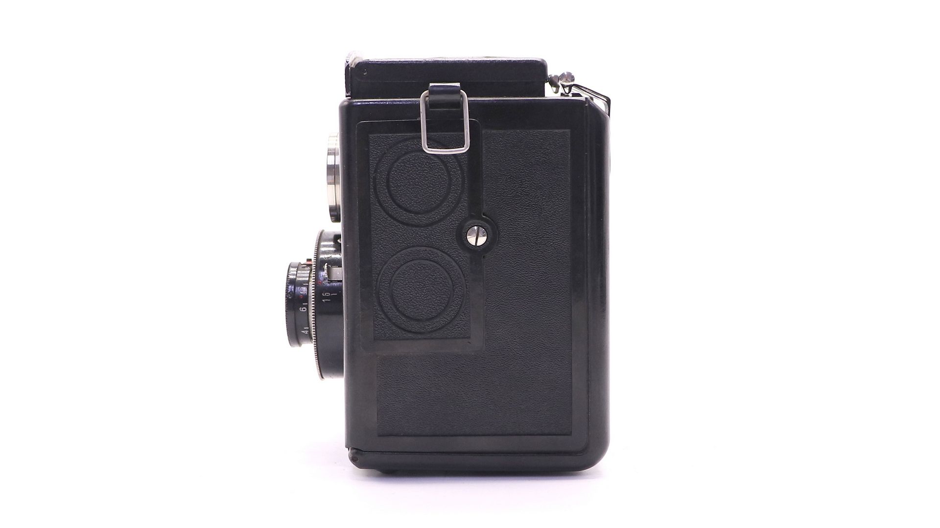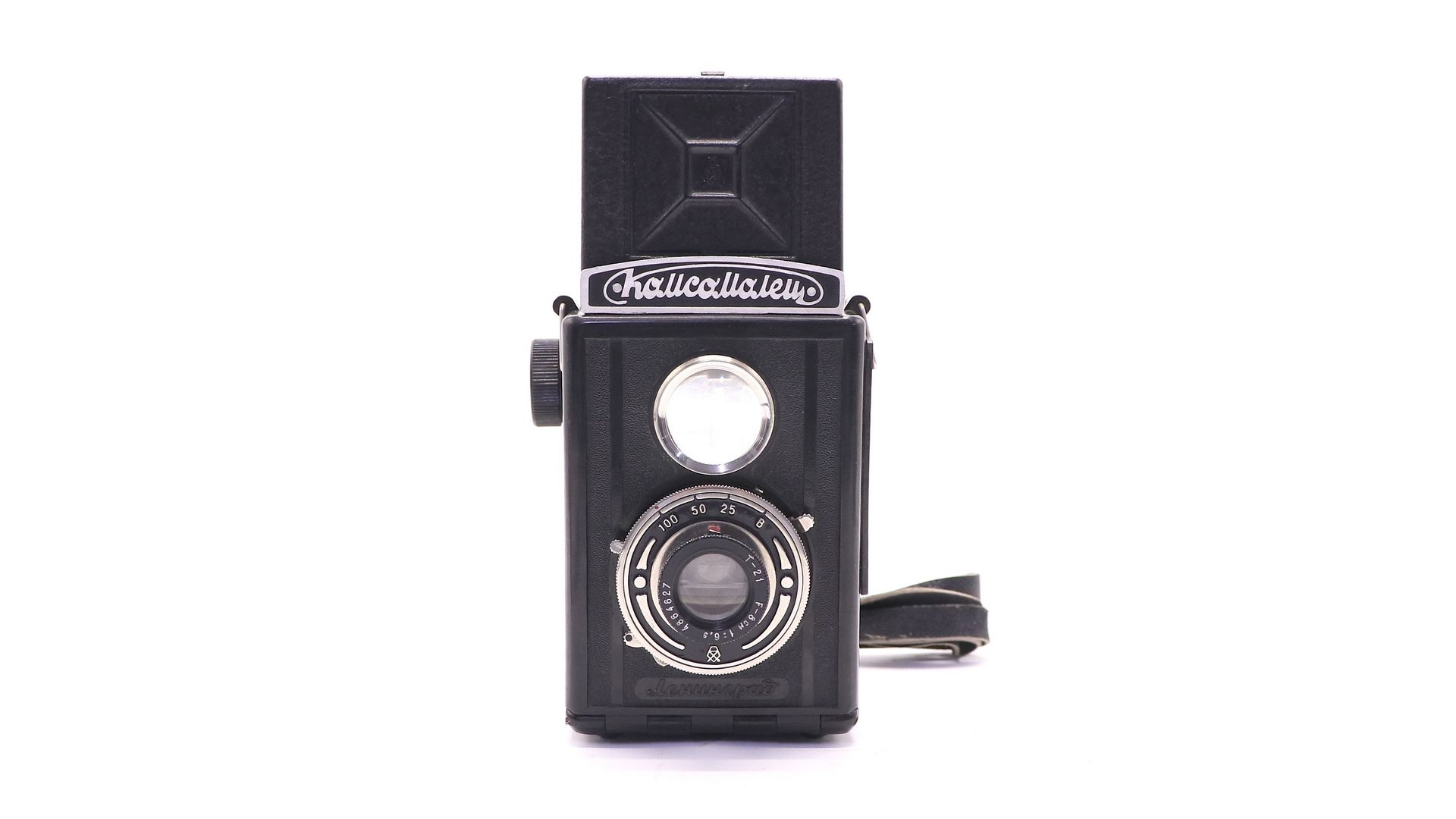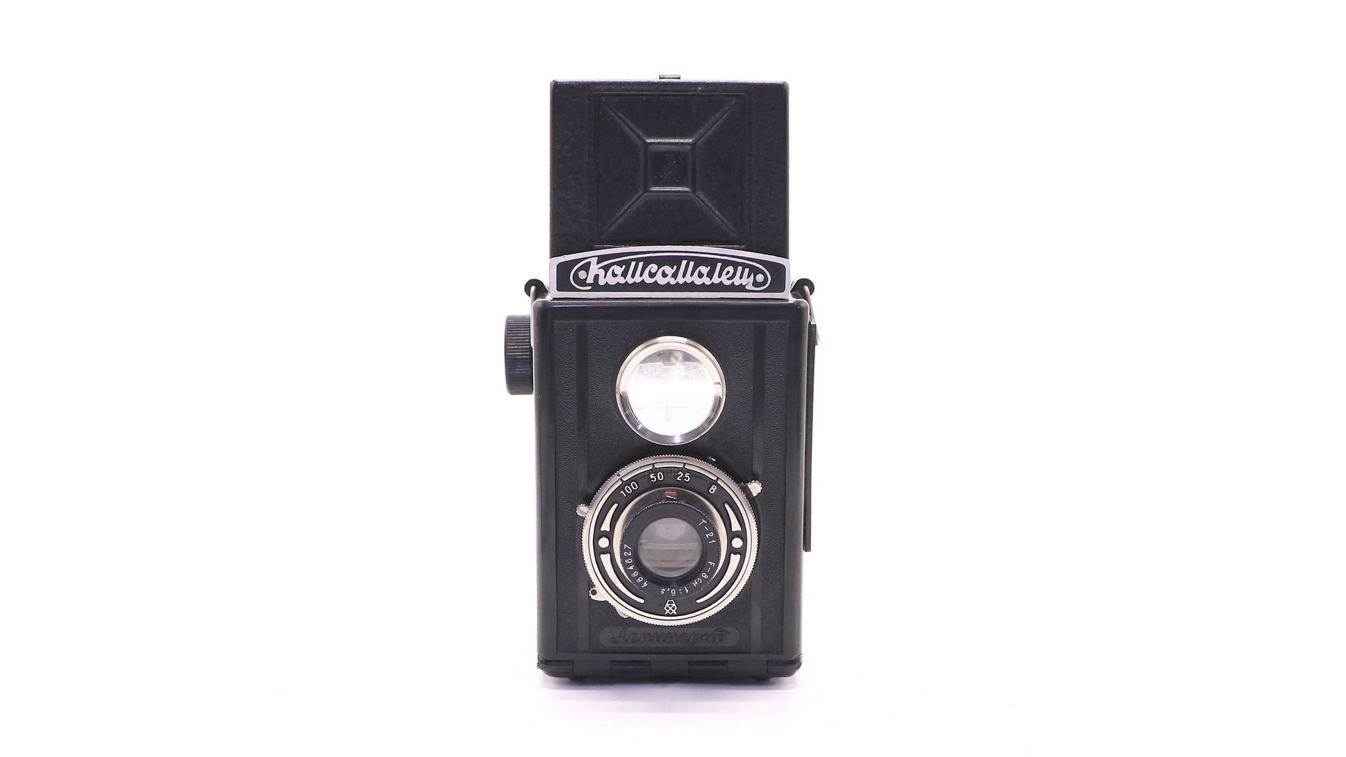Экземпляр оснащен я объективом «Т-21» f 6,3/80 мм. Система наводки камеры на резкость — по шкале расстояний. Пределы фокусировки — от 1,5 м до бесконечности. Затвор камеры — центральный, межлинзовый, с предварительным взводом и выдержками 1/25, 1/50 и 1/100 секунды, а также «B» (затвор открыт при нажатой кнопке спуска). Диапазон диафрагм — от 6,3 до 16 (маркированы значения 6,3, 8, 11 и 16), система диафрагмирования — ирисовая. Фотоматериал фотоплёнка типа 120 с форматом кадра 6×6 см (по 12 кадров на плёнке).