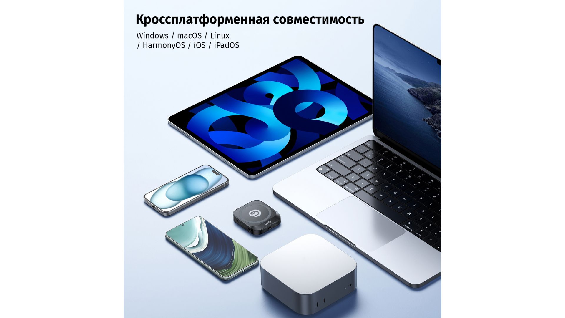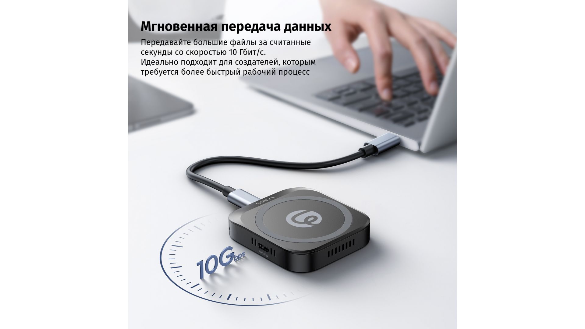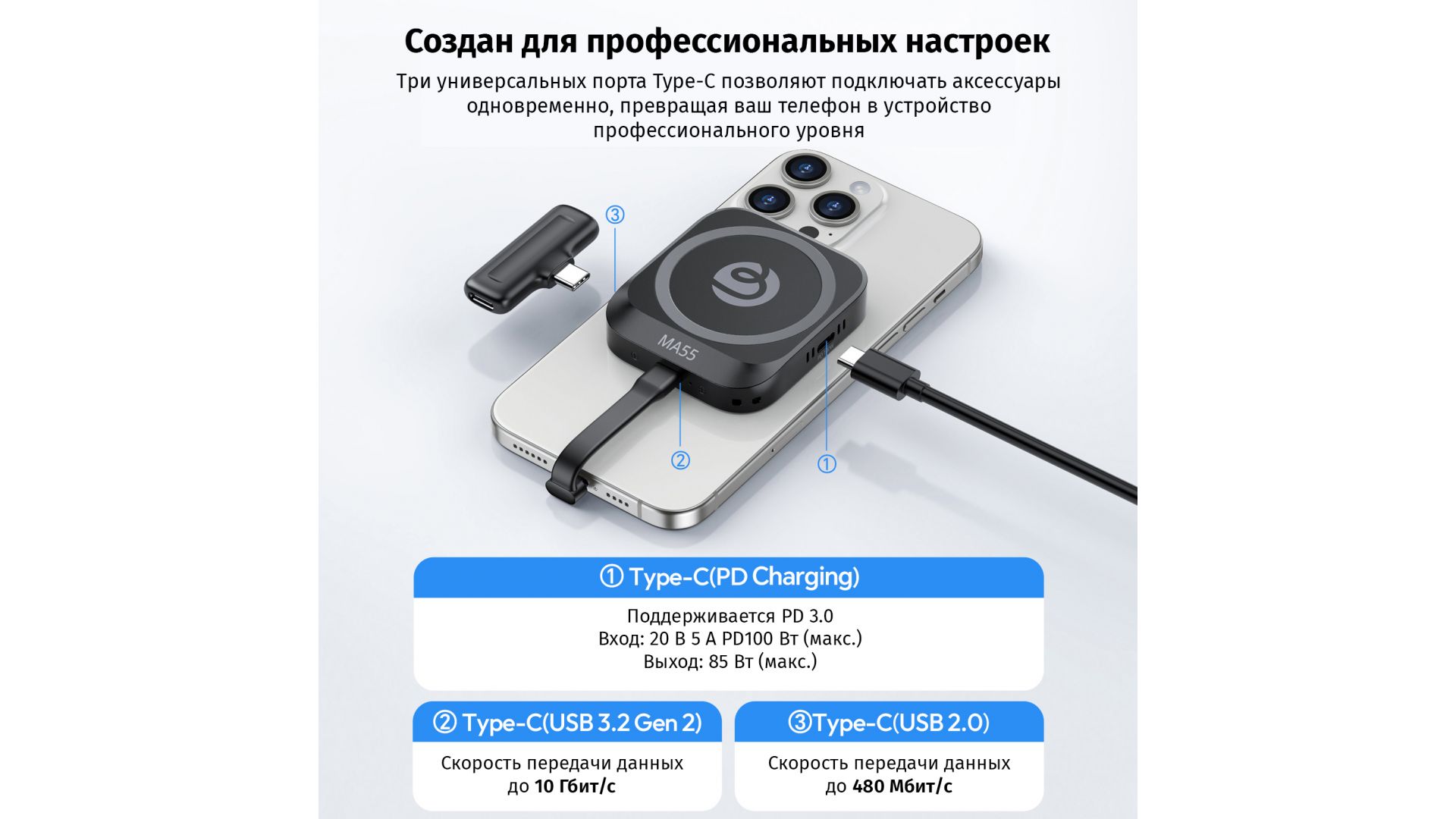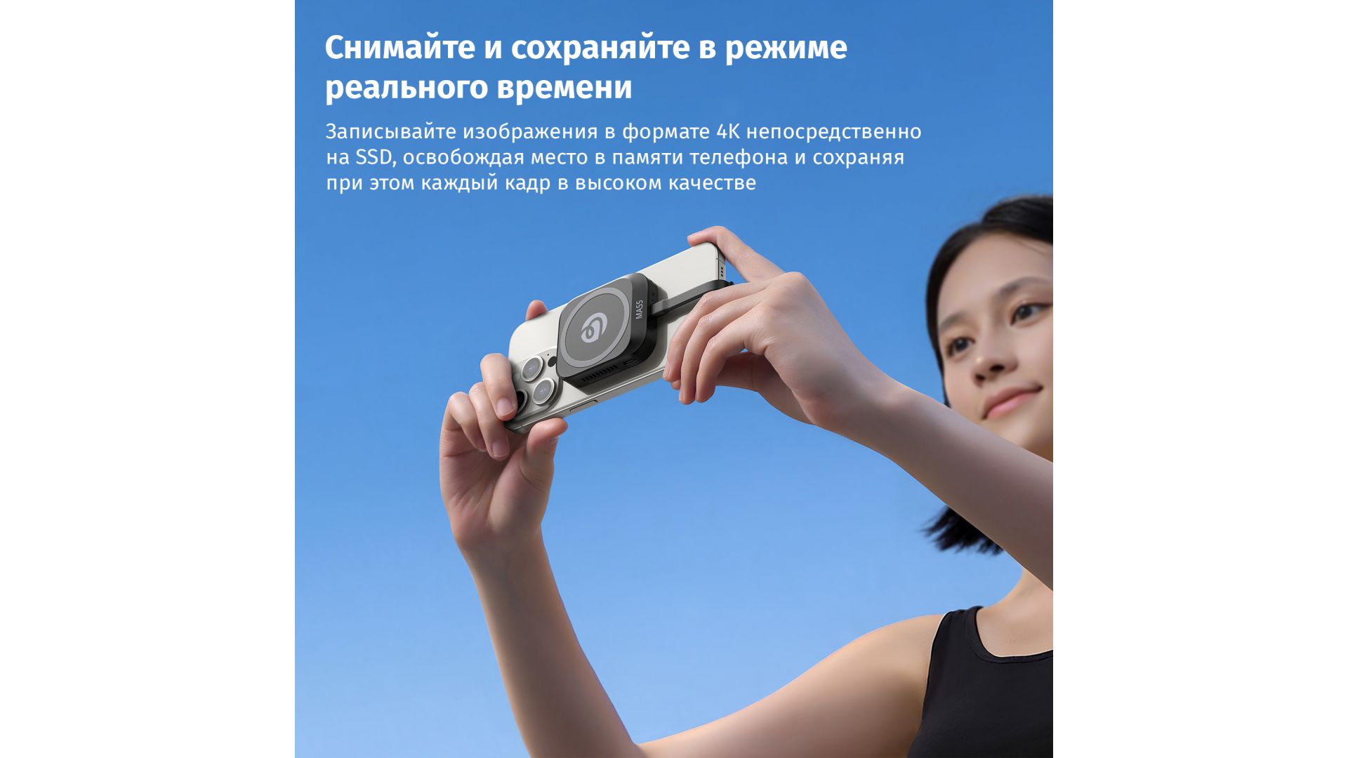Обеспечивает запись видео в формате 4K ProRes прямо на внешний SSD емкостью до 2 ТБ, мгновенно освобождая память телефона. Высокоскоростные порты Type-C (до 10 Гбит/с) позволяют быстро передавать файлы и подключать аксессуары. Совместим с накопителями формата 2230/2242 и всеми популярными ОС.