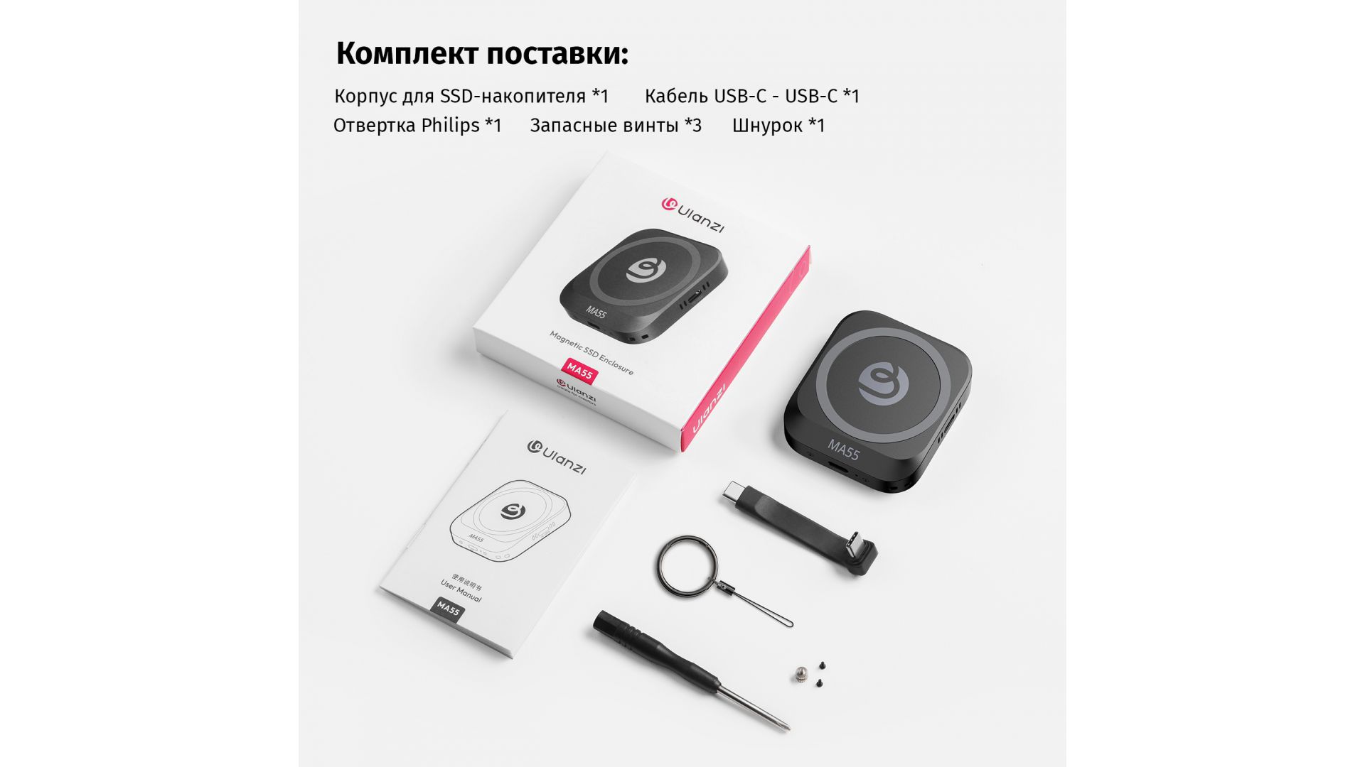 Комплектация:Корпус для SSD-накопителя Ulanzi MA55, кабель USB-C - USB-C, отвертка, резервный винт, шнурок