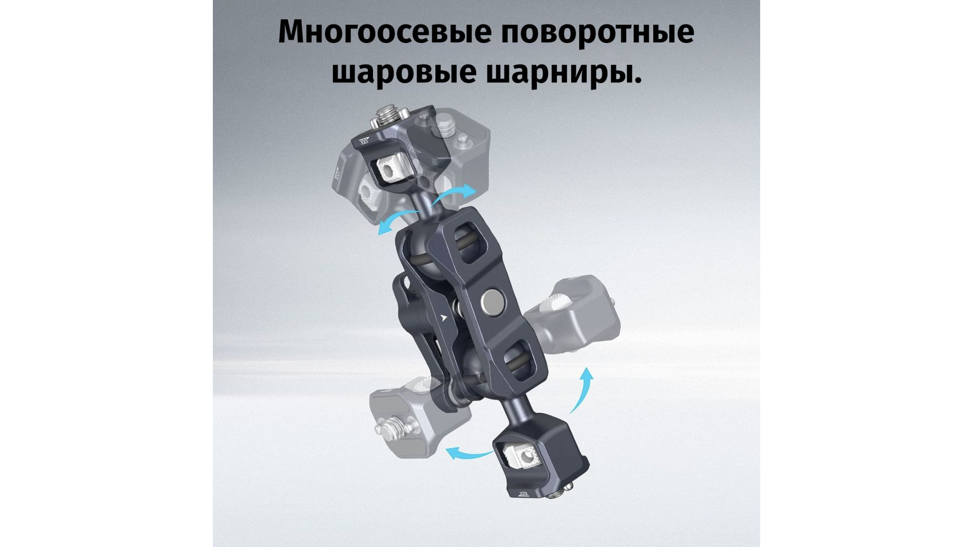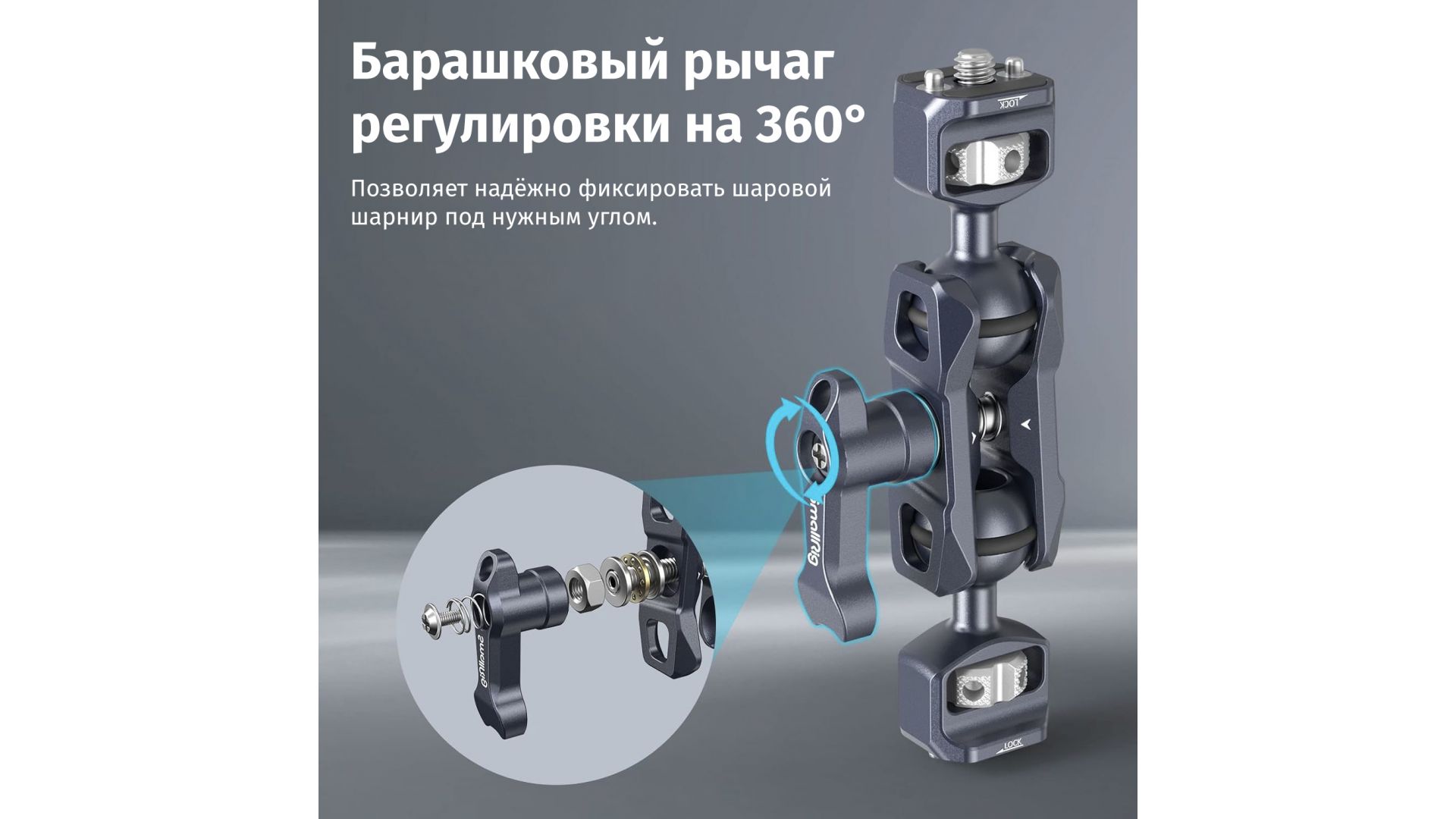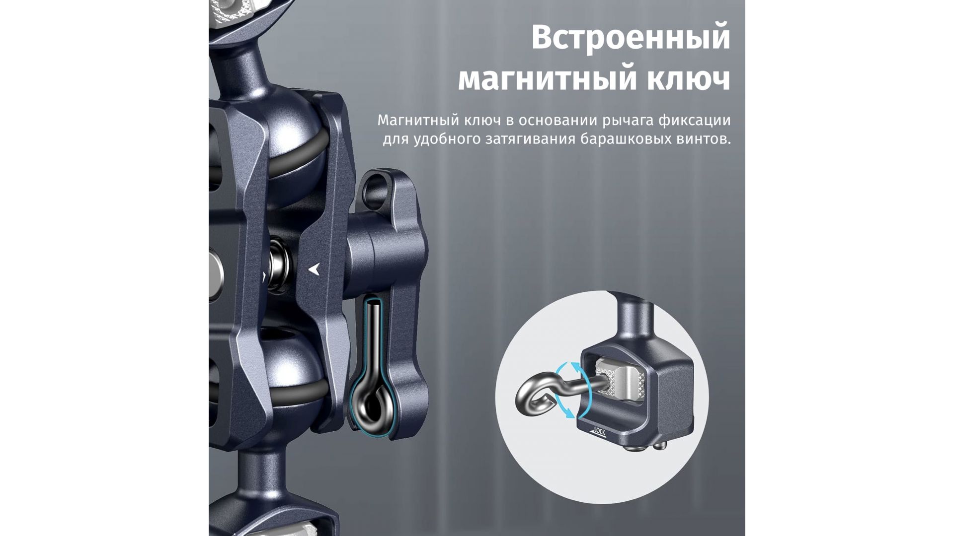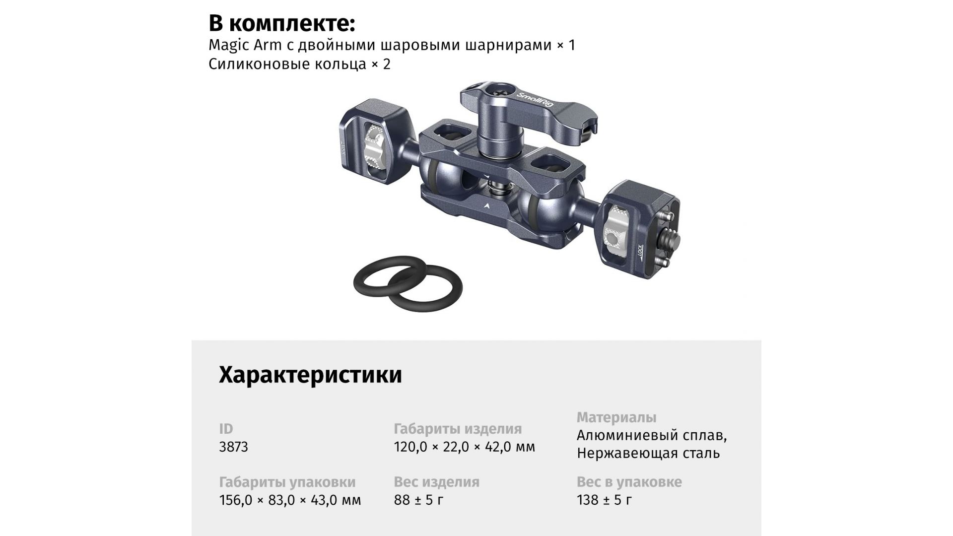 Крепление Magic Arm SmallRig 3873 (1/4”) Каждая шаровая головка диаметром 20 мм оснащена одним винтом 1/4"-20 и растягивающимися штифтами, которые предотвращают скручивание. Регулируемый рычаг для большого пальца помогает зафиксировать шаровую головку под нужным углом и поставляется с небольшим магнитным ключом для затягивания маховиков. На обоих концах зажима для шаровых головок есть выемки, которые оставляют больше места для гибкой регулировки шаровых головок, а также установленных на них аксессуаров.