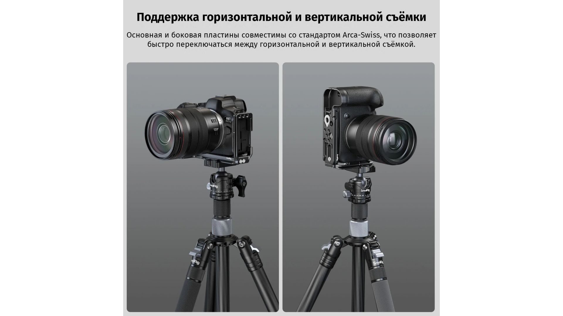 L-площадка SmallRig 4160 для Canon EOS R5/R6/R5 C/R6 Mark II — идеально подходит для удобной и быстрой смены положения камеры между горизонтальным и вертикальным режимами. Она надежно фиксирует камеру с помощью винта 1/4" и двух позиционных штифтов, предотвращая случайное смещение. Площадка оснащена резиновыми подкладками, которые защищают камеру от царапин, и имеет петлю на дверце аккумулятора, точно повторяющую контуры камеры для улучшения сцепления и дополнительной устойчивости. Идеальный аксессуар для стабильной съемки.