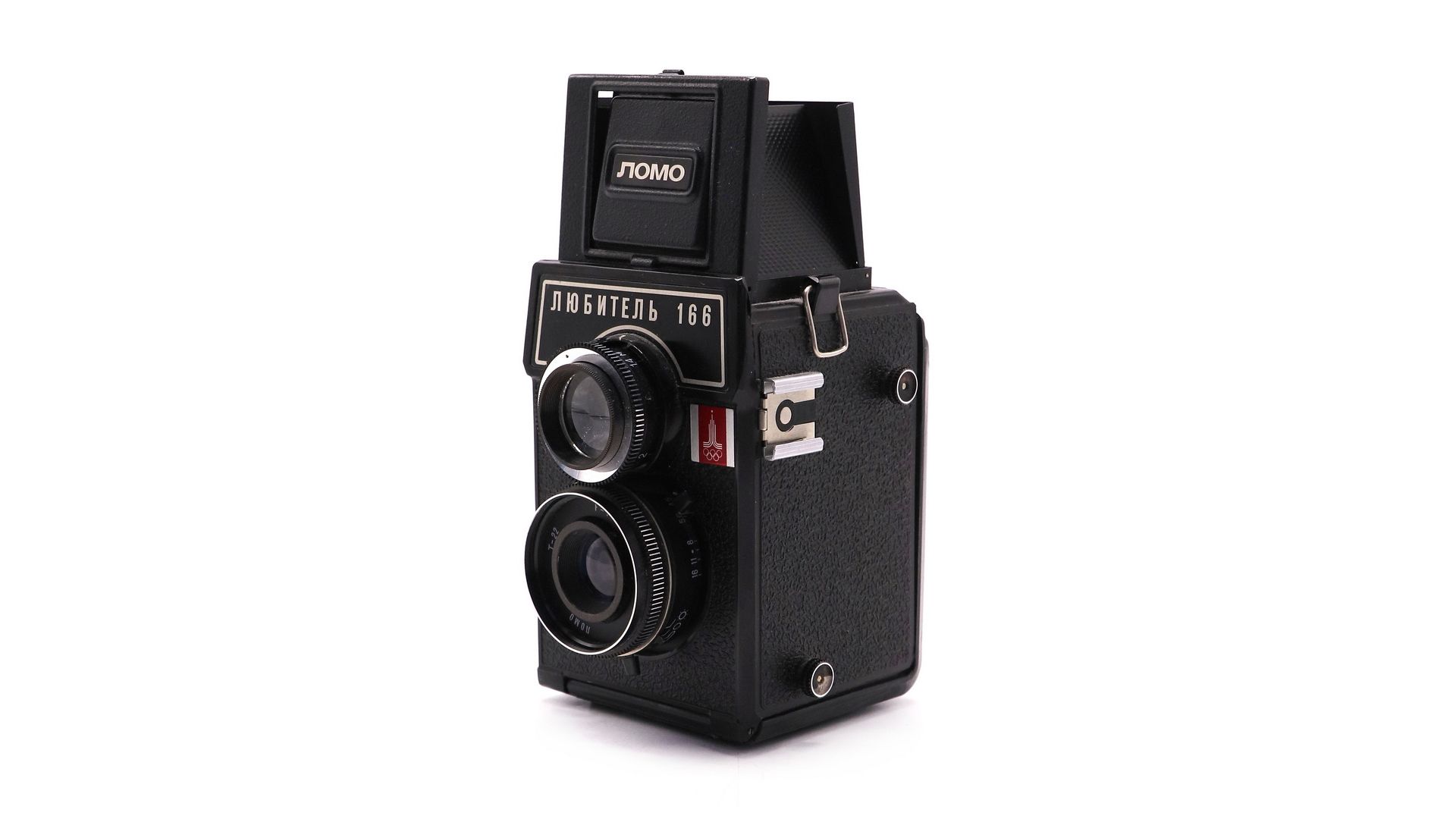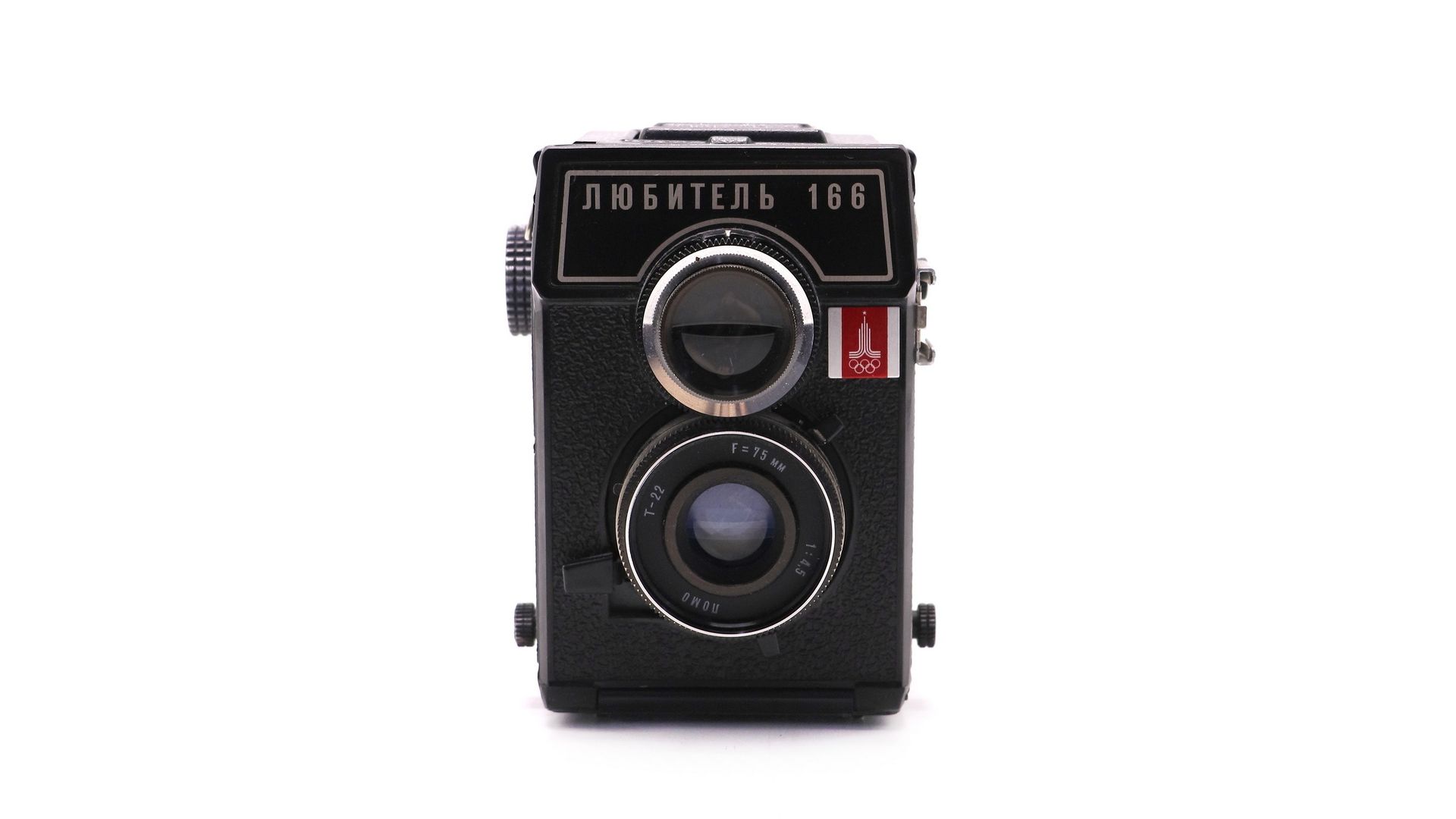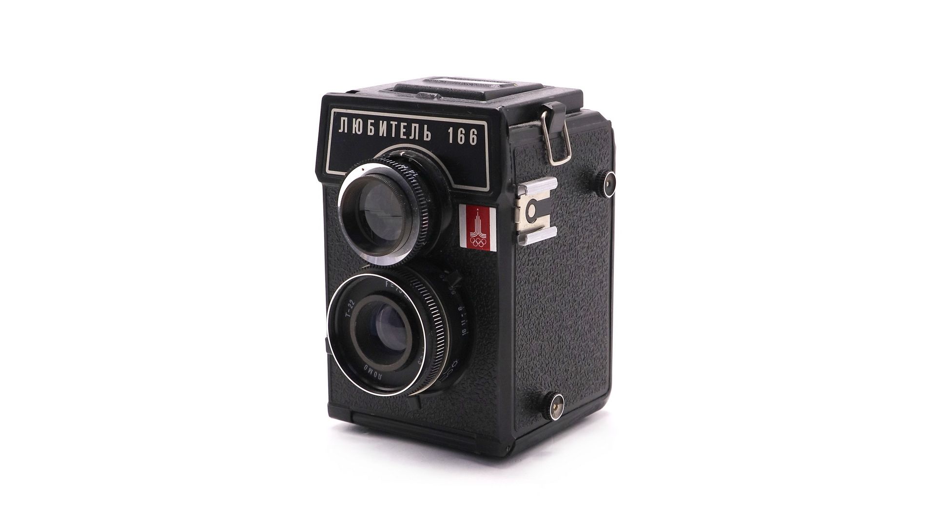 Советский среднеформатный двухобъективный зеркальный фотоаппарат Любитель 166. Выпущен Ленинградским Оптико-механическим Объединением в 1979 году. Специальная олимпийская партия, с эмблемой московской Олимпиады 1980 года.