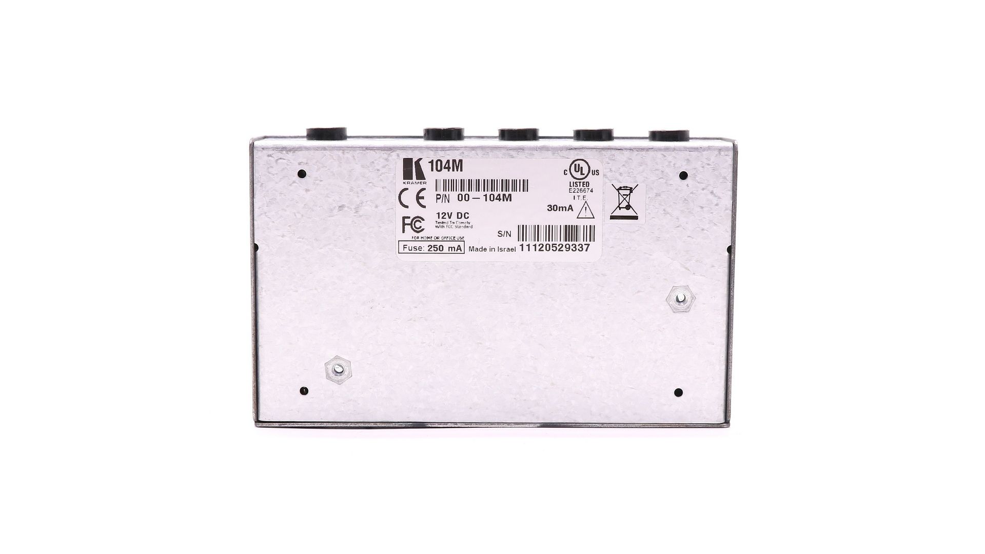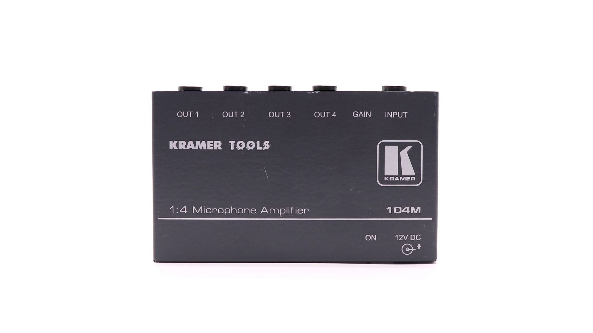 Микрофонный усилитель Kramer 104M распределяет входной сигнал на четыре идентичных выхода (разъемы TRS 6,5 мм) для передачи на приемные устройства. Регулятор на боковой панели позволяет контролировать уровень выходного сигнала. Внутренней перемычкой может быть выбран режим фантомного питания, что позволяет подключать конденсаторные микрофоны.