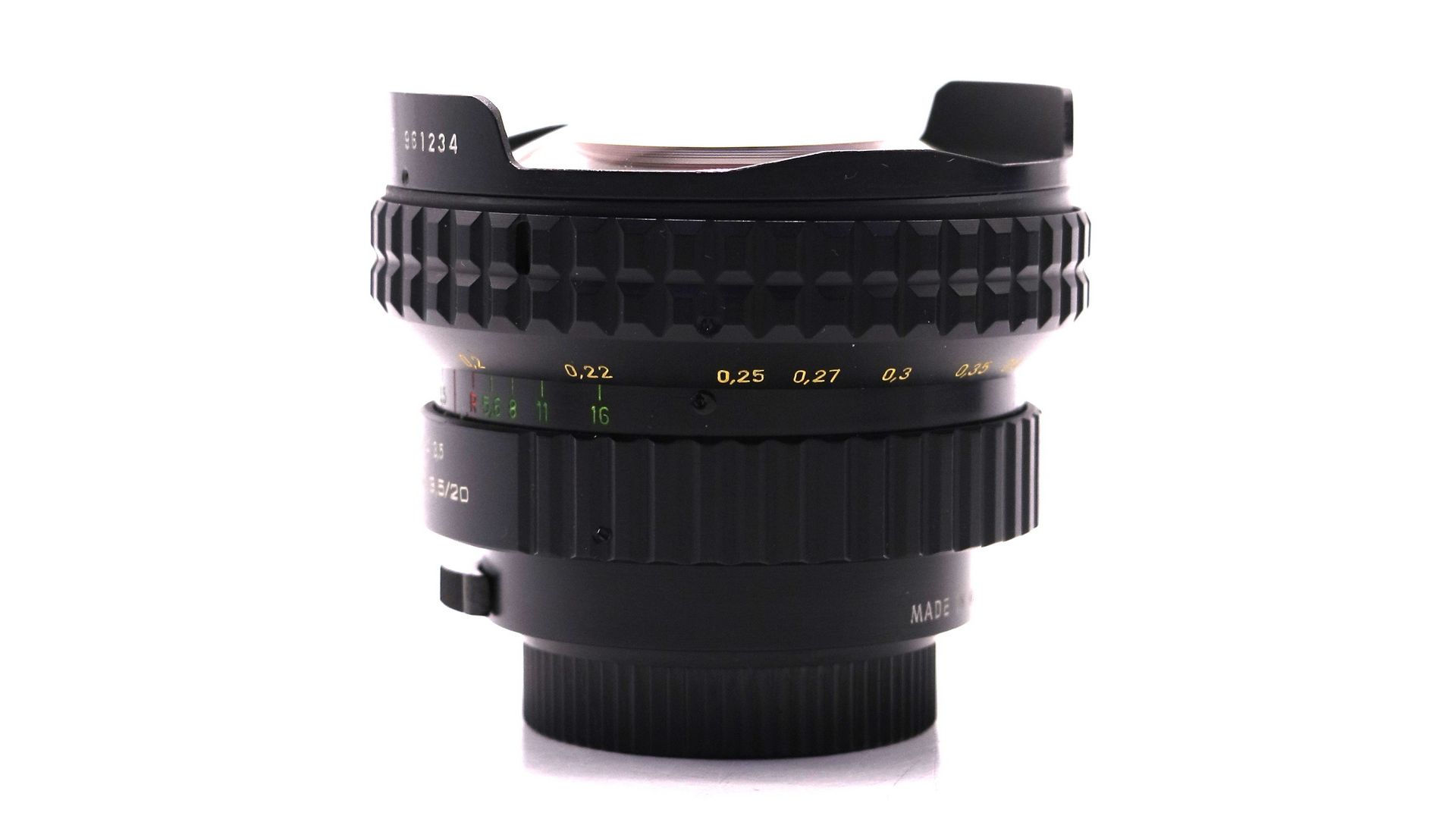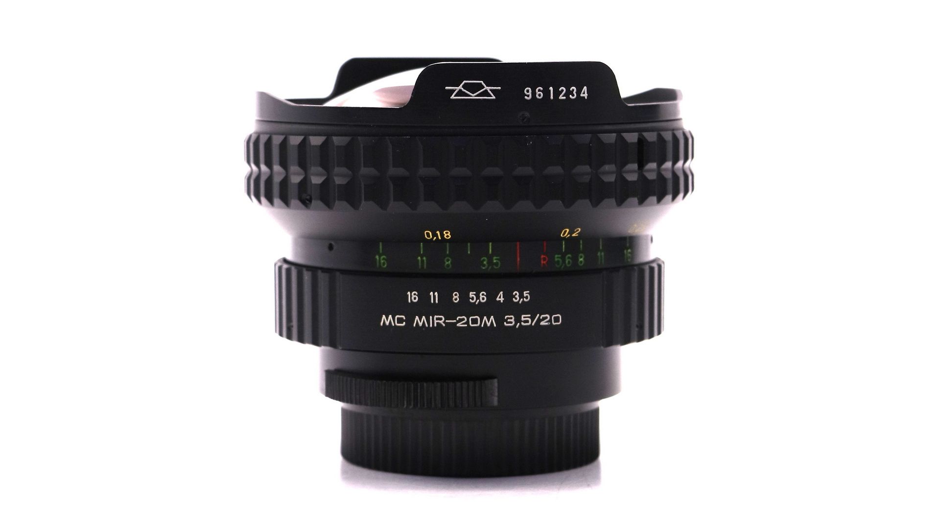 У кольца туговатый и мягкий большой ход — почти 270 градусов! Фокусироваться таким объективом — одно удовольствие! При фокусировке двигается весь линзоблок, но линзы и сама его оправа не вращаются. У данного объектива девять линз в восьми группах, ретрофокусный несимметричный анастигмат типа «Флектогон». В отличие от многих современных объективов, этот — снабжен полноценной шкалой ГРИП, что очень хорошо. На шкале есть все значения стопов диафрагмы. Сама диафрагма у объектива состоит из шести блестящих (без чернения) скругленных лепестков. Мир-20М МС 3.5/20 - мануальный объектив с углом 96 градусов на полный кадр, с неплохой резкостью по центру, хорошим контрастом и коррекцией дисторсии, неплохой эргономикой.