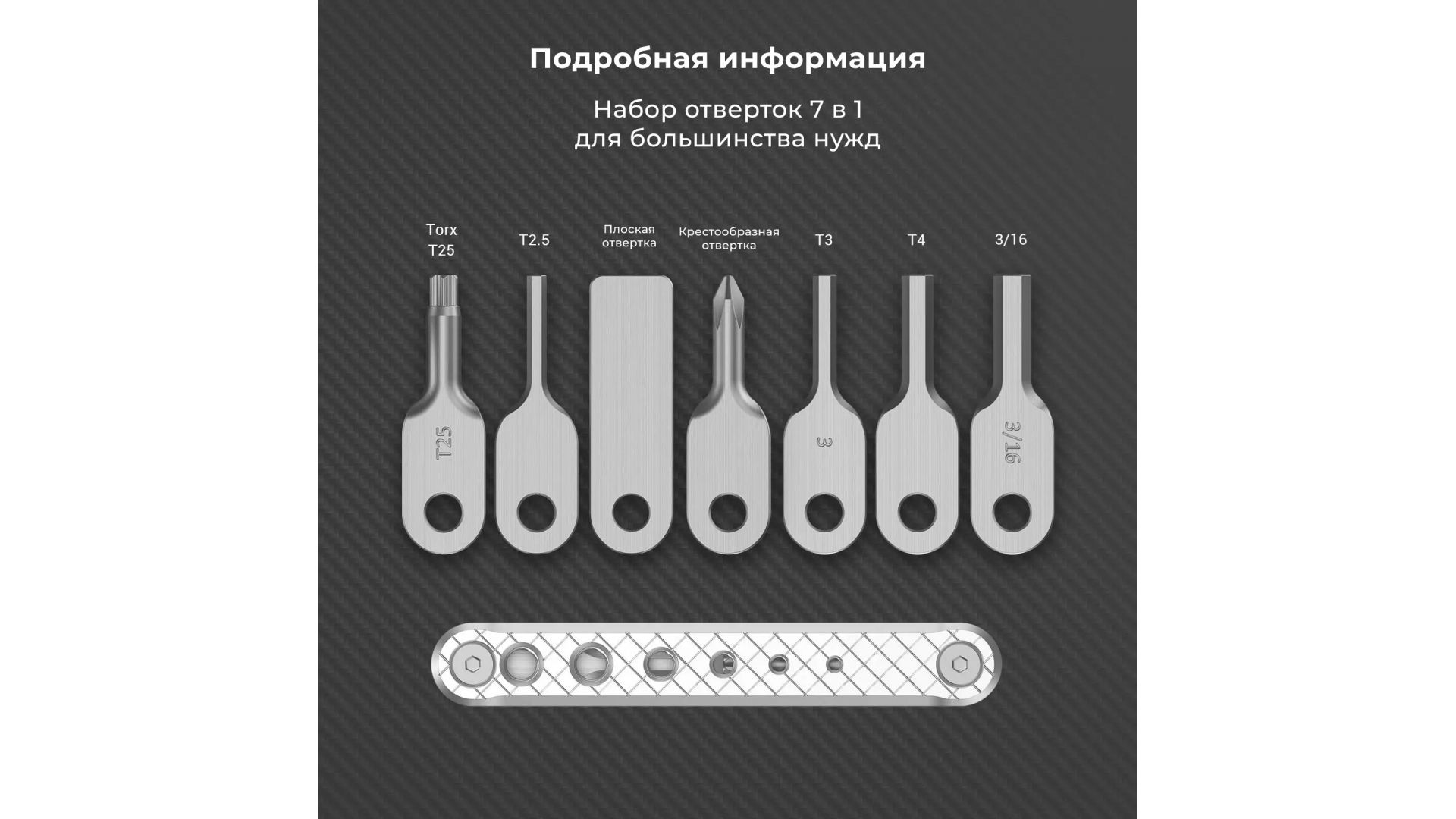 Комплектация:4 гаечных ключа (размеры: 2,5, 3, 4, 3/16), 1 плоская отвертка, 1 крестообразная отвертка (Phillips), 1 отвертка Torx T25