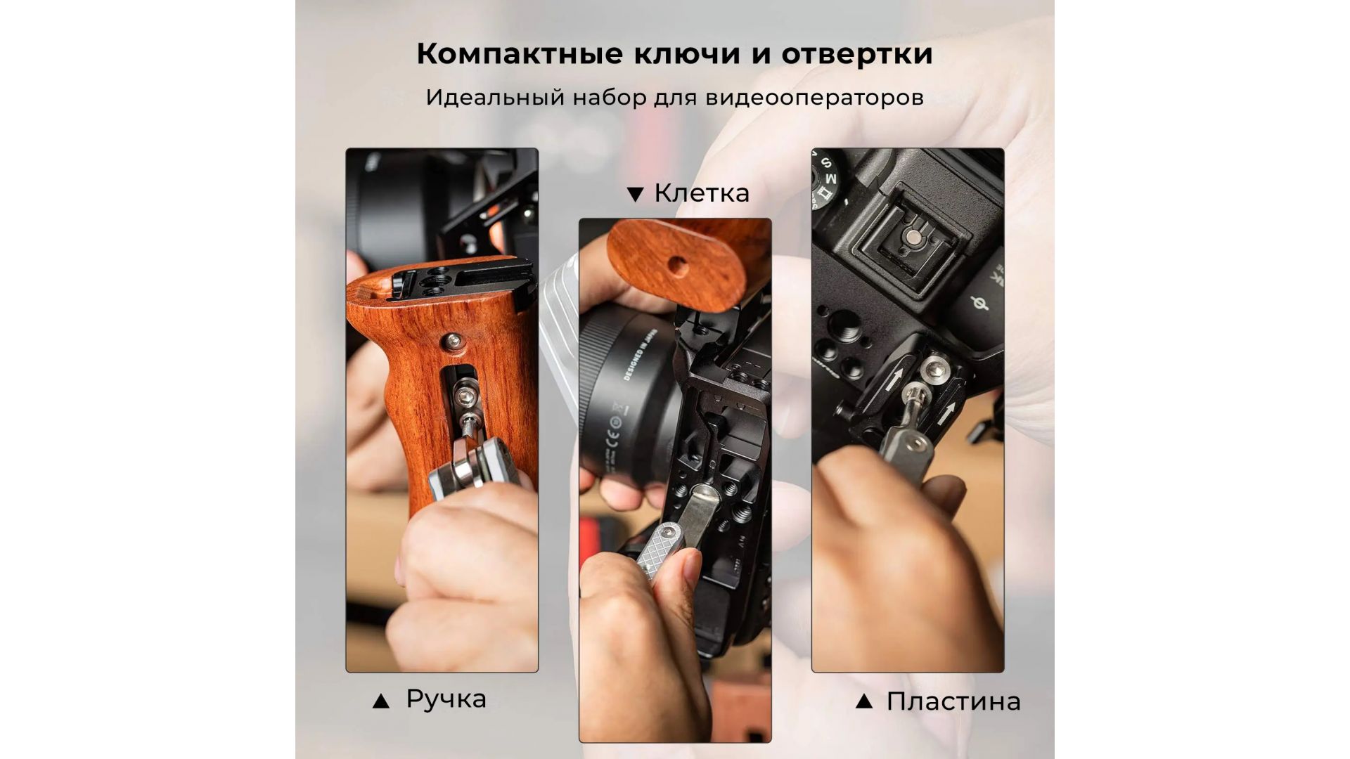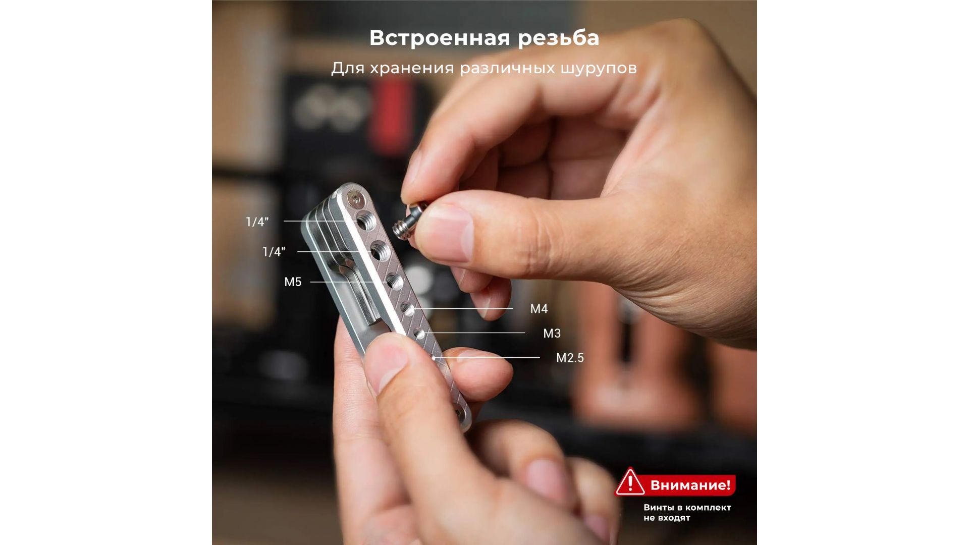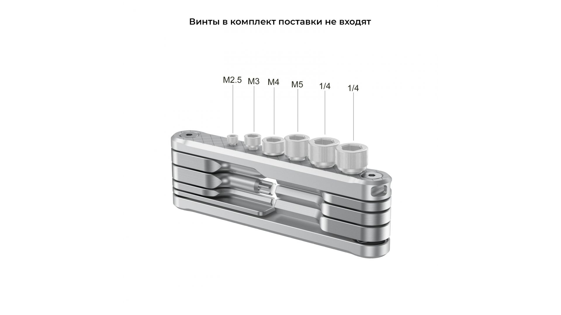 Также предусмотрены резьбовые отверстия (M2,5, M3, M4, M5, 1/4") для хранения запасных винтов. Этот набор покрывает большинство задач при съемке, оставаясь удобным и надежным инструментом.