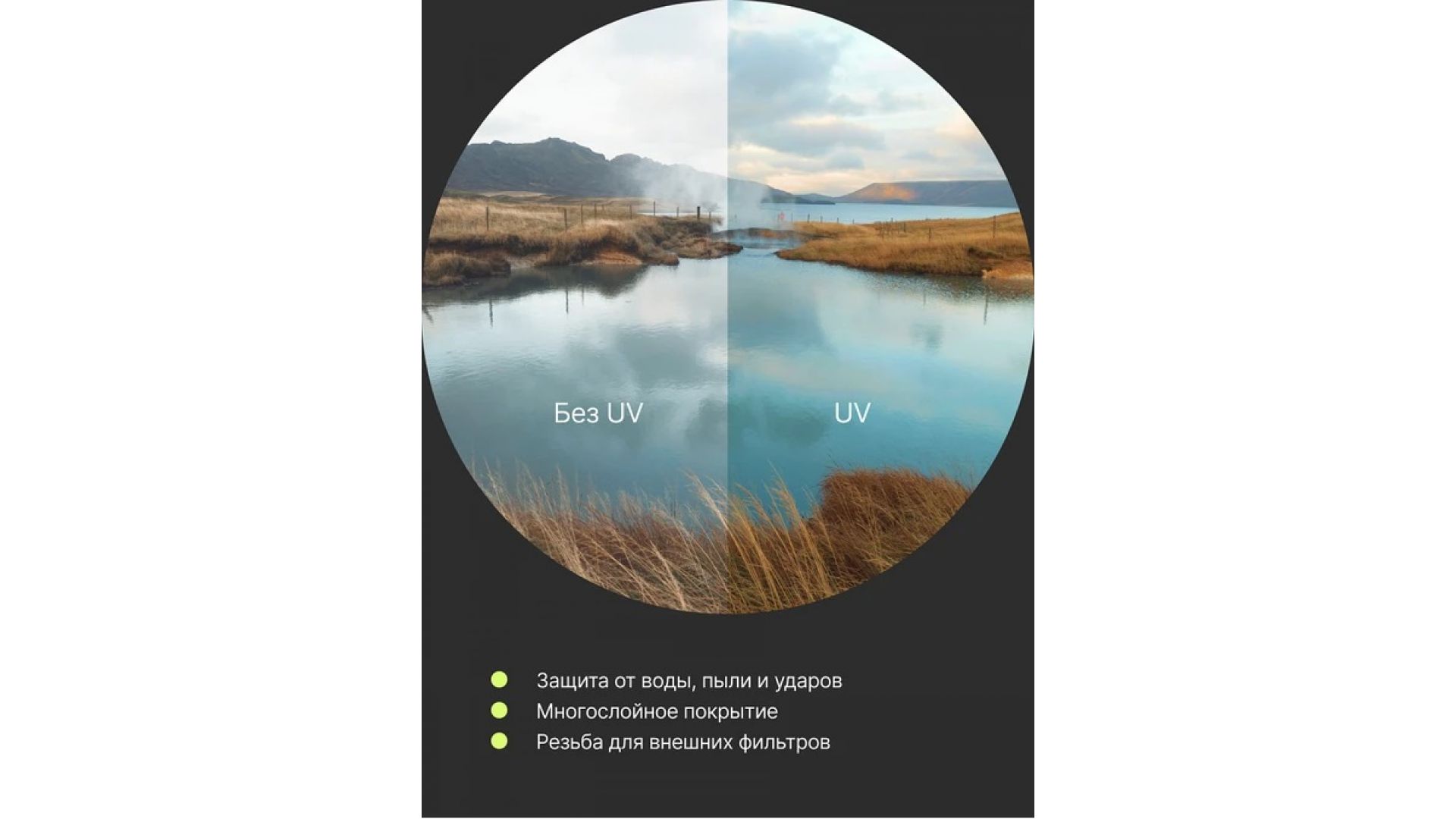 Набор из 3 фильтров RayLab состоит из трех самых необходимых для работы любого фотографа светофильтров: Ультрафиолетовый защитный фильтр (UV). Защитный ультрафиолетовый фильтр для постоянного использования. Устраняет воздействие невидимого ультрафиолетового излучения (отсекает лучи с длиной волны короче 410 нм). Изготовлен из высококачественного полированного стекла, что обеспечивает оптическую прозрачность, точность цветопередачи и высокую степень светопропускания. UV-фильтр поглощает ультрафиолетовое излучение и снижает голубоватый оттенок дневного света. Благодаря высокой степени светопропускания и отсутствию искажения при цветопередаче данный фильтр в качестве защитного можно использовать, не снимая, и устанавливать с ним другие фильтры. Фильтр защитит переднюю линзу объектива от попадания пылии влаги. Поляризационный фильтр (CPL). Циркулярный поляризационный светофильтр позволяет удалять при съемке нежелательные отражения и блики от неметаллических поверхностей, таких как вода, стекло.