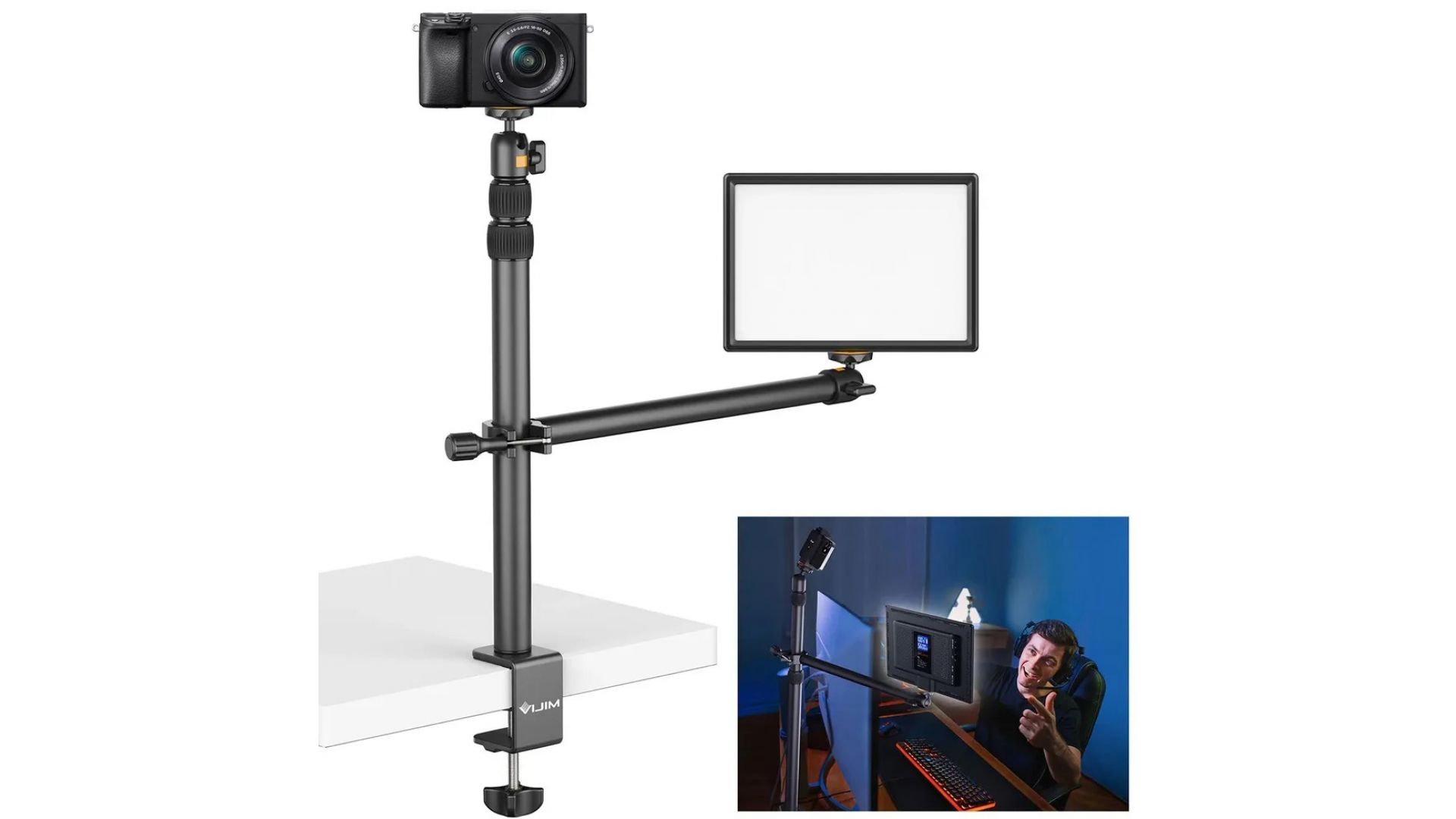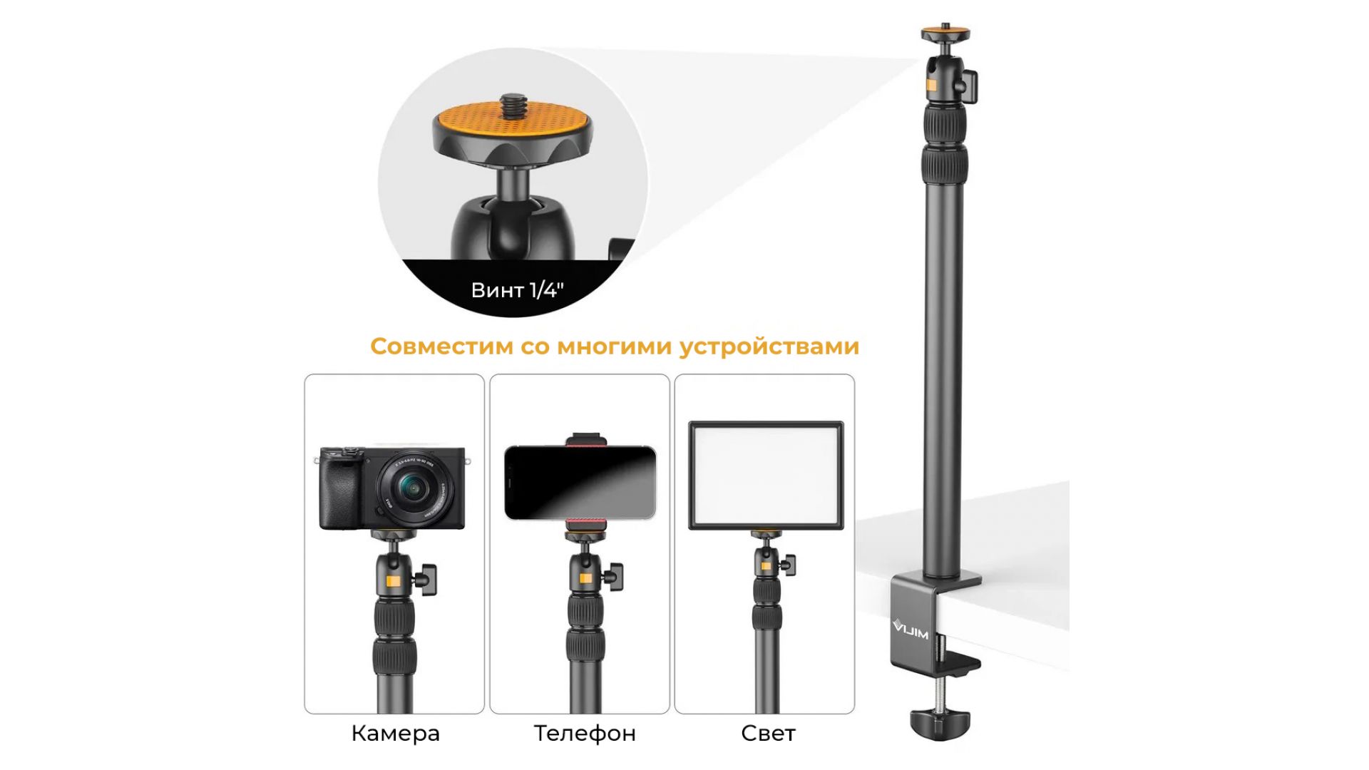 Подставка для настольного крепления и вспомогательный кронштейн оснащены стандартными винтами 1/4, которые можно установить на большинство камер и светильников.