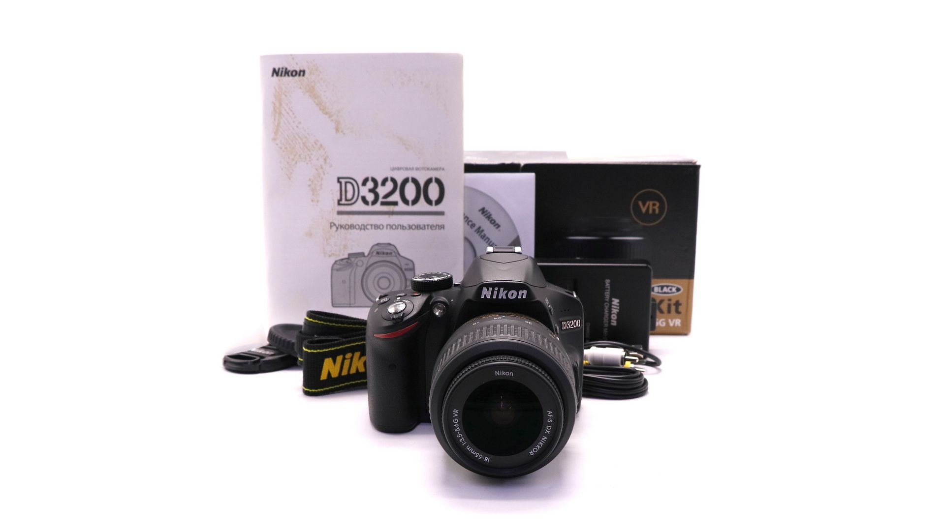 Комплектация:Коробка, объектив Nikon AF-S DX 18-55mm f/3.5-5.6G VR DX, аккумулятор, зарядное устройство, ремень, документы, крышки, чехол.