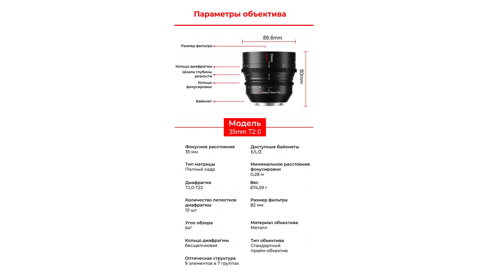 Конструкция с регулируемой диафрагмой обеспечивает плавную экспозицию видео. Диафрагма T2.0 позволяет получать изображение высокого качества даже в условиях низкой освещенности.