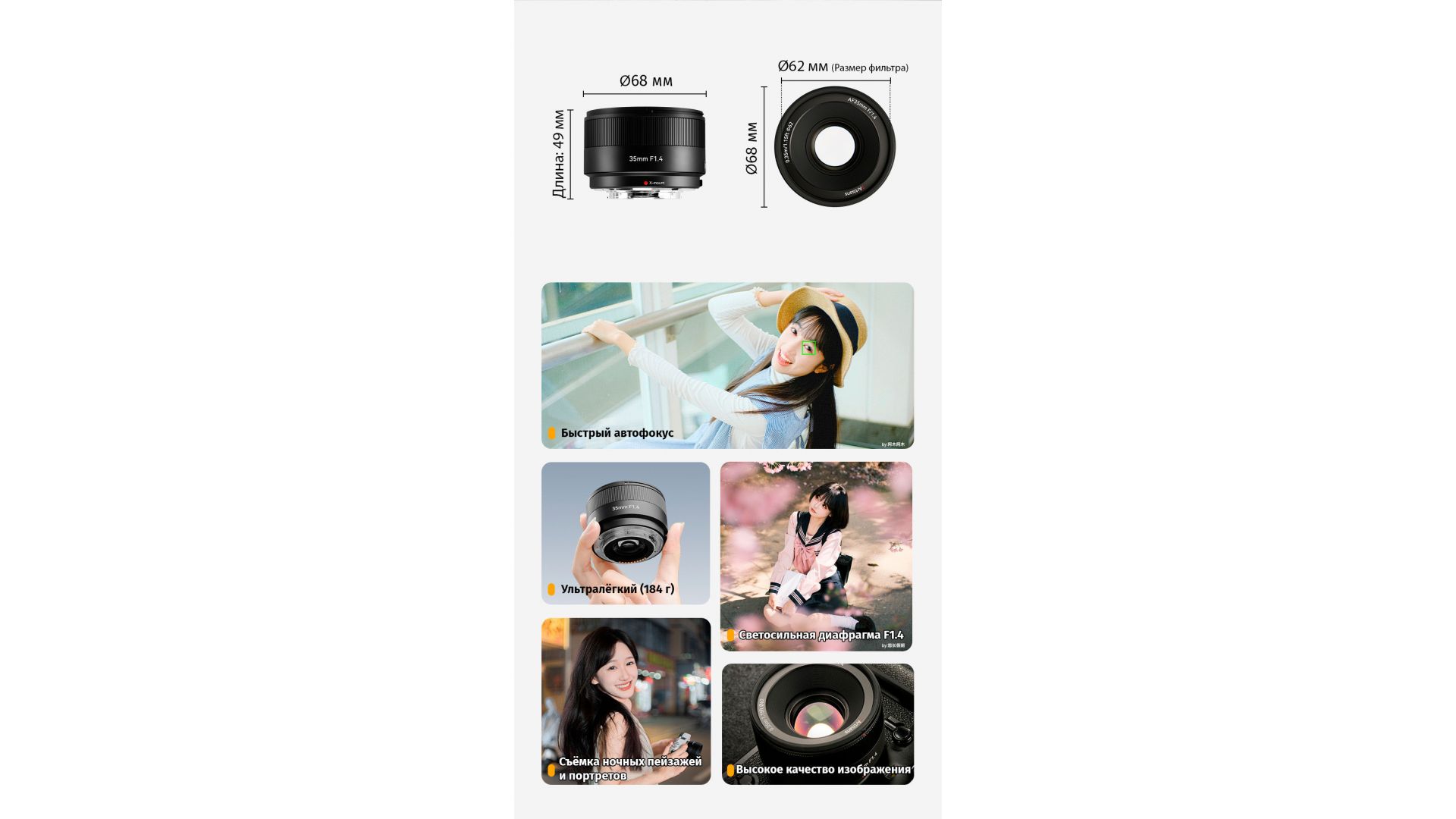 Несмотря на простую оптическую схему из 8 элементов в 5 группах, объектив включает сверхнизкодисперсный элемент для подавления хроматических аберраций. 7-лепестковая диафрагма создает приятное боке. Современный автофокус и минимальная дистанция фокусировки 0.35 м делают его практичным для большинства сценариев съемки. Компактные размеры (Ø68x49 мм) и легкий вес (184 г) отлично дополняют беззеркальные камеры Fujifilm.