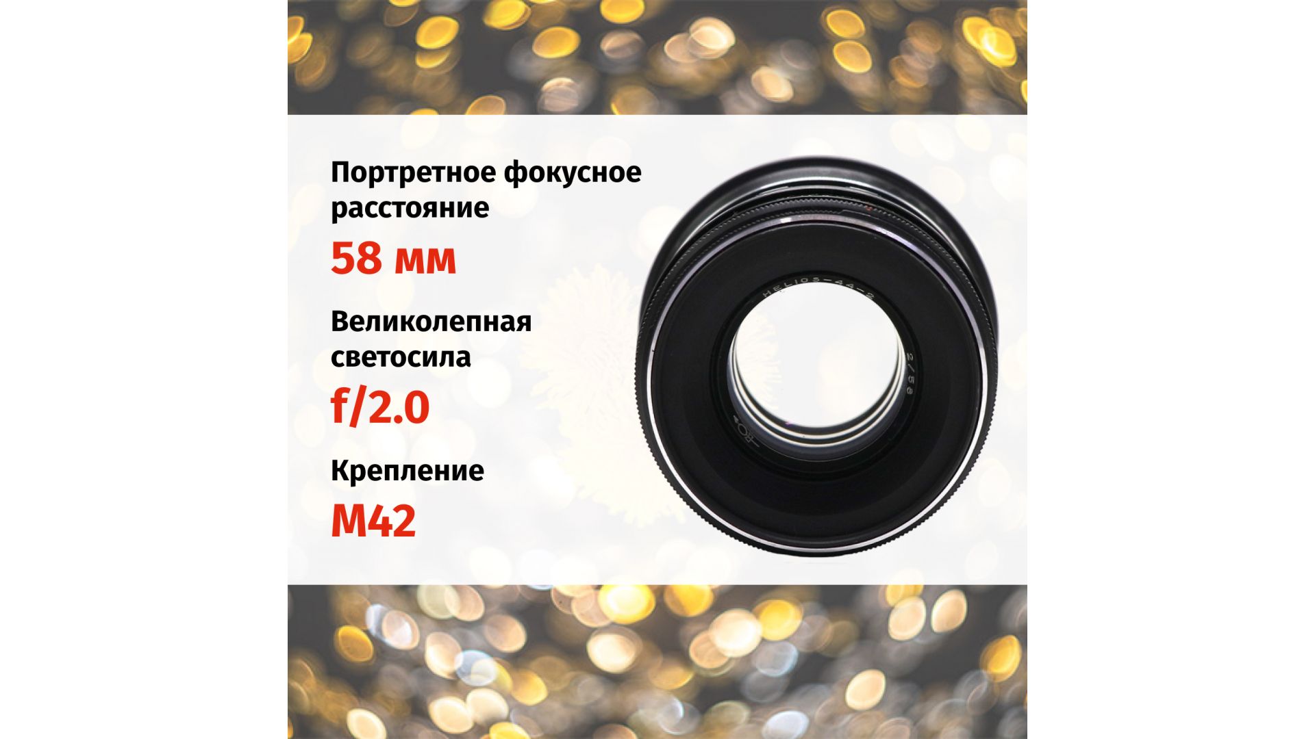 - Фокусное расстояние: 58 мм (идеальный портретный угол)