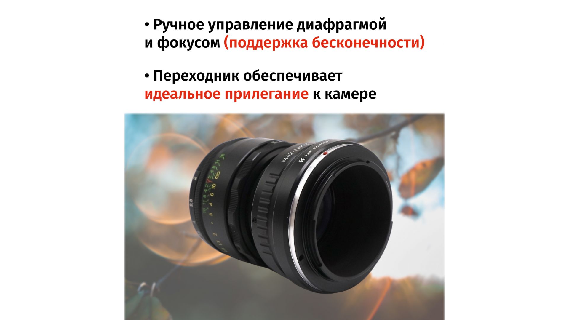 - Адаптер M42 → Nikon Z от K&F Concept (обеспечивает идеальное прилегание и сохранение резкости)