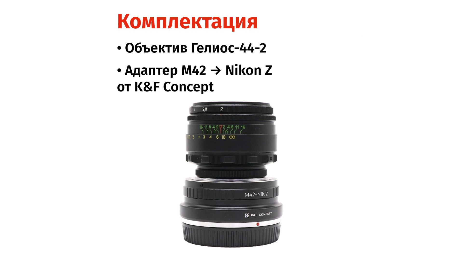 Комплектация:Объектив Гелиос-44-2 (М42), переходник M42 - Nikon Z от бренда K&F Concept, крышки.
