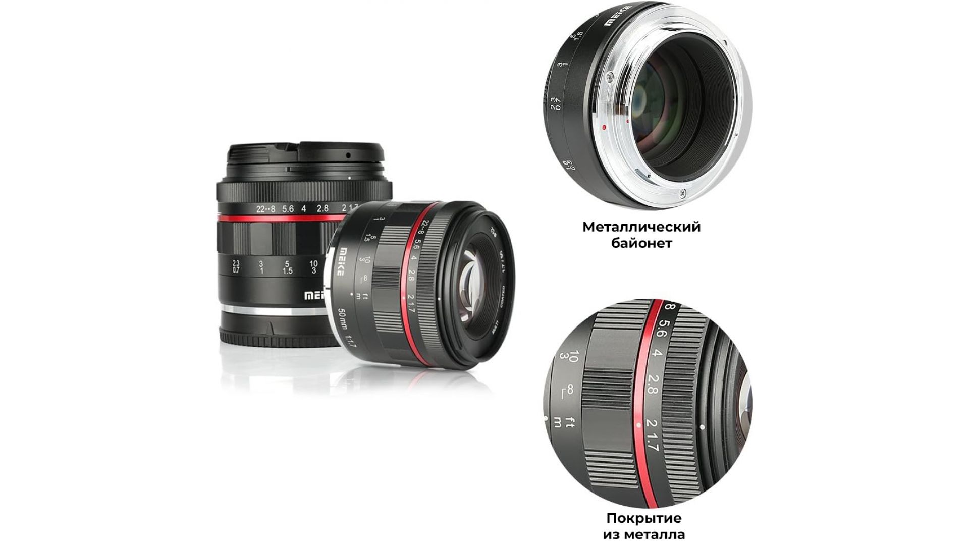 Объектив Meike 50mm f/1.7 Full Frame - стандартный универсальный объектив, подходит для съемки широкого спектра объектов - от портретов до пейзажей. Максимальная диафрагма f/1.7 позволяет работать в сложных условиях освещения, а также обеспечивает повышенный контроль над глубиной резкости.