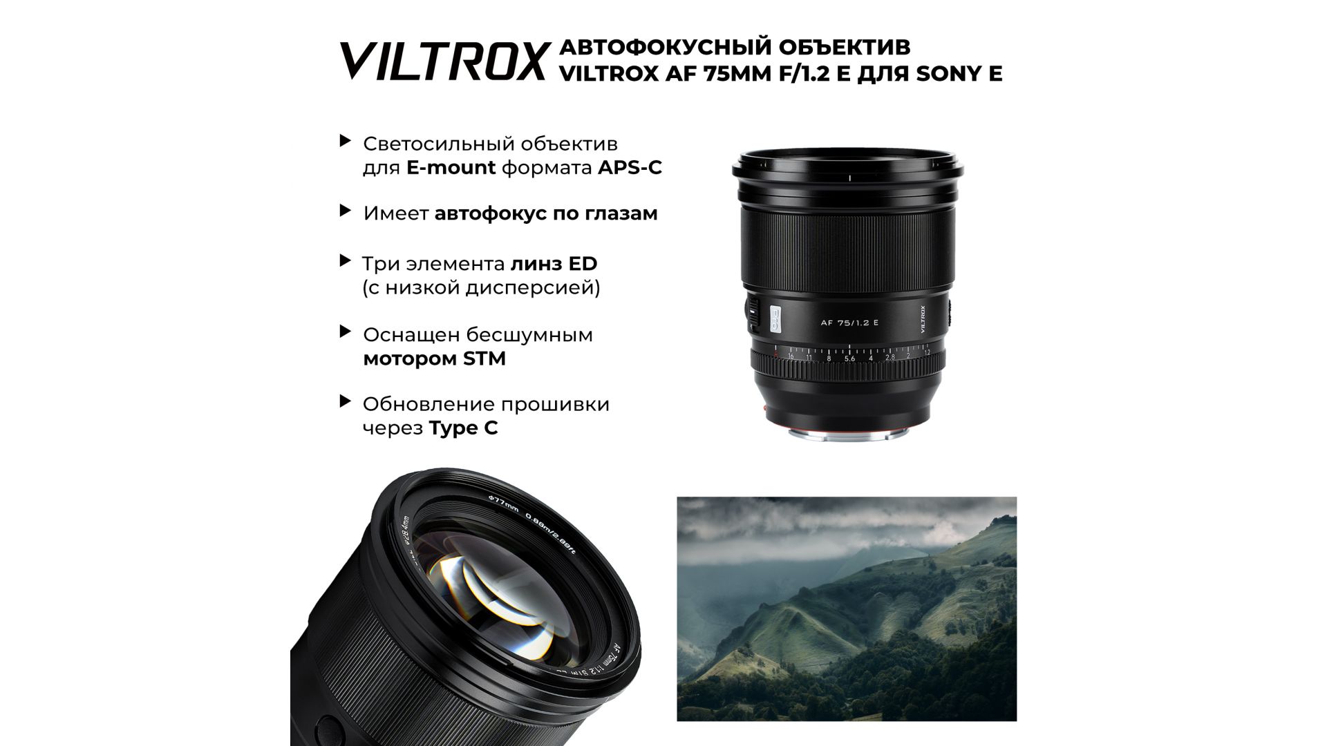 Объектив Viltrox AF 75mm f/1.2 E предназначен для беззеркальных камер Sony с байонетом E-mount формата APS-C. Высококачественное стекло, оптическая схема 16 элементов в 11 группах. Три элемента линз ED (с низкой дисперсией) уменьшают хроматические аберрации, что обеспечивает большую четкость и точность цветопередачи независимо от выбранной диафрагмы. Светосила f/1.2 обеспечивает комфортную работу даже в условиях с низкой освещенностью.