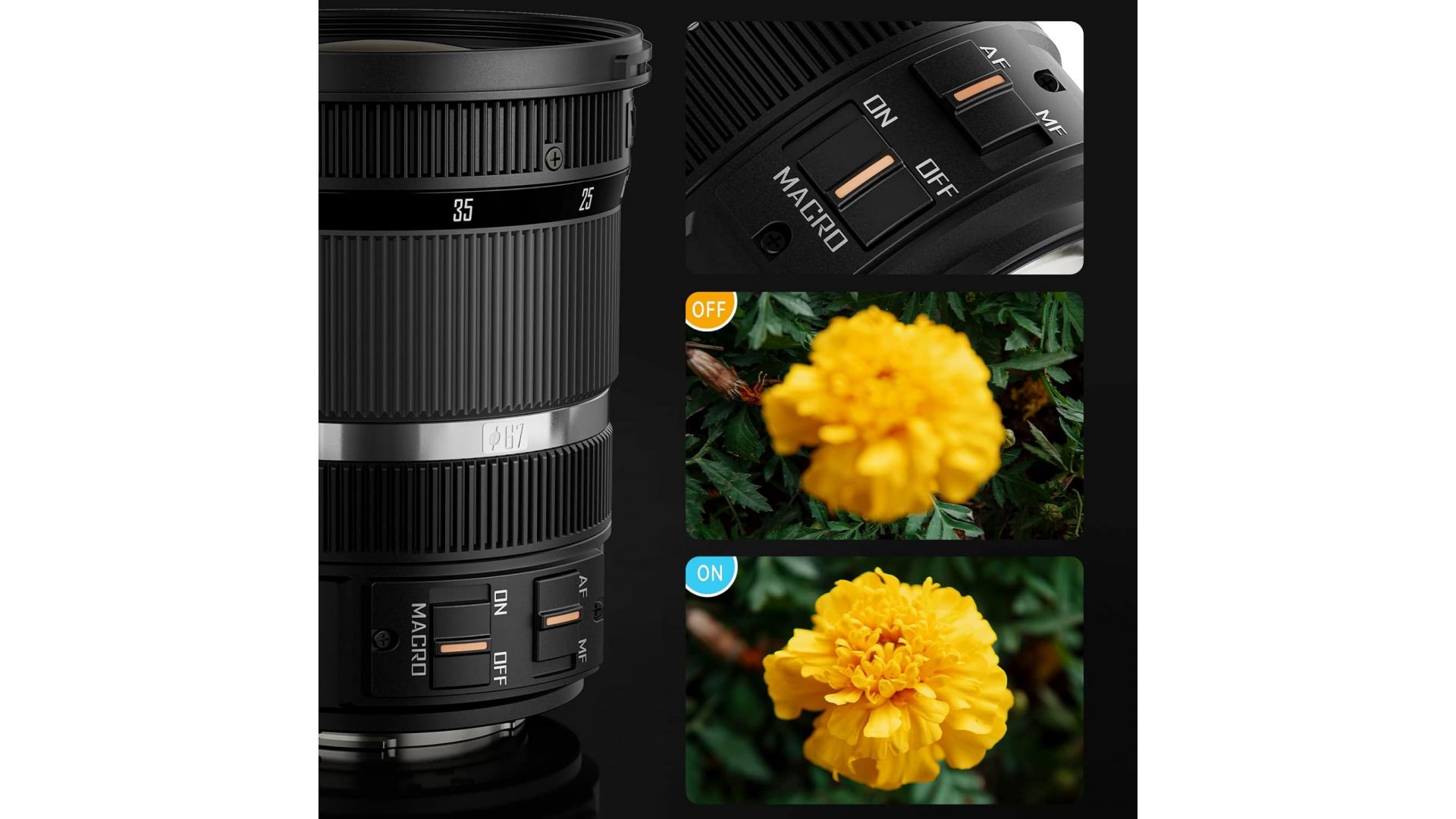 Автофокусный зум-объектив для Micro 4/3 с фокусным расстоянием 24-70 мм (для кроп матрицы). Модель отлично подходит для портретной и пейзажной съемки, а также для макросъемки, ведь переключив тумблер Macro вы получите минимальную дистанцию фокусировки в 0 см. Благодаря диафрагме f/2.8 в широкоугольном режиме вы можете с комфортом снимать в условиях низкой освещенности, например, ночные сцены и звездное небо.