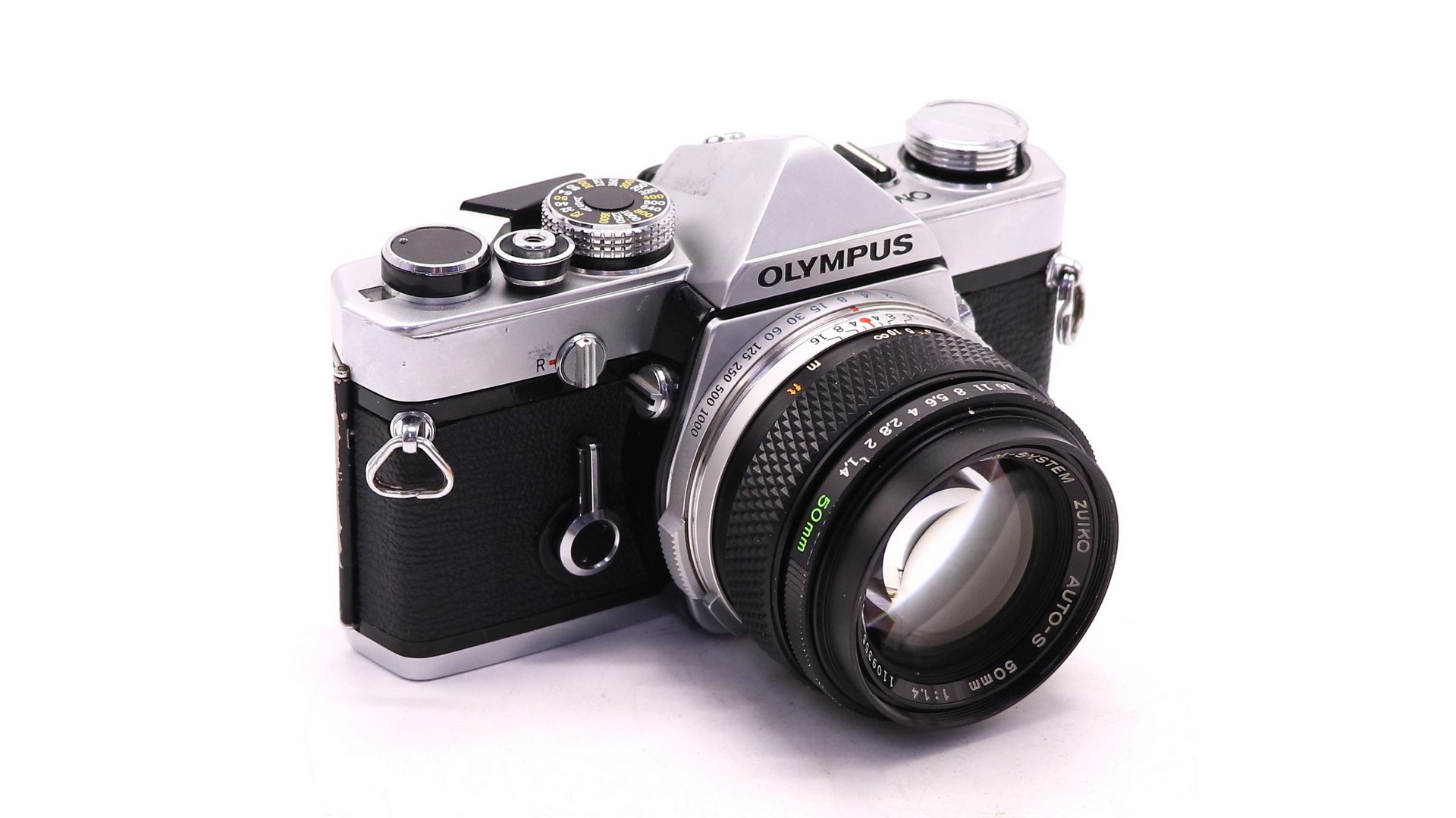 Первая профессиональная модель системы Olympus OM. Очень легкий и компактный, оснащен системой воздушного демпфера зеркала, что значительно снижает вибрации. Корпус — металлический, с открывающейся задней стенкой, скрытый замок. Курковый взвод затвора и перемотки плёнки. Затвор — механический, шторно-щелевой с горизонтальным движением матерчатых шторок. Выдержки затвора — от 1 до 1/1000 сек и «В». Выдержка синхронизации с электронной фотовспышкой — от 1/60 сек. Видоискатель — зеркальный, с несъёмной пентапризмой, сменные фокусировочные экраны. Фотоматериал плёнка типа 135, размер кадра 24 × 36 мм.
