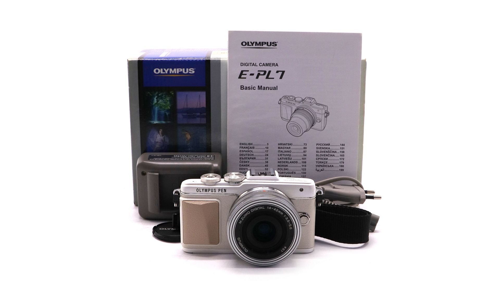 Комплектация:Коробка, аккумулятор (2шт.), документы, зарядное устройство, USB-кабель, крышка байонета, фотовспышка Olympus 4FS1, объектив Olympus M.Zuiko Digital 14-42mm f/3.5-5.6, крышки объектива.