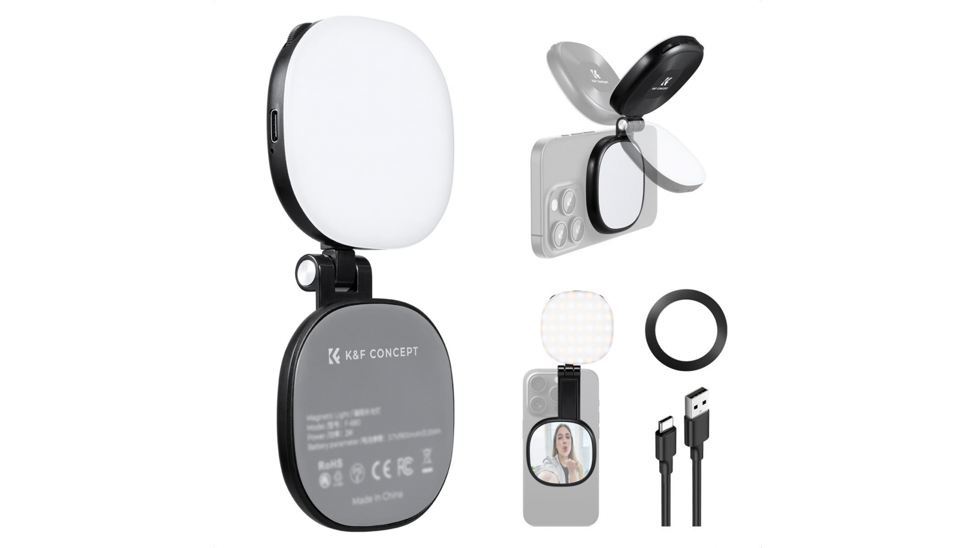 Дизайн 2-в-1: Осветитель складной и сверхлегкий (всего 93 г). В сложенном виде напоминает косметичку (6,4x7,5x2,3 см), а внутри имеет встроенное зеркало — идеально для селфи и поправки макияжа на ходу.