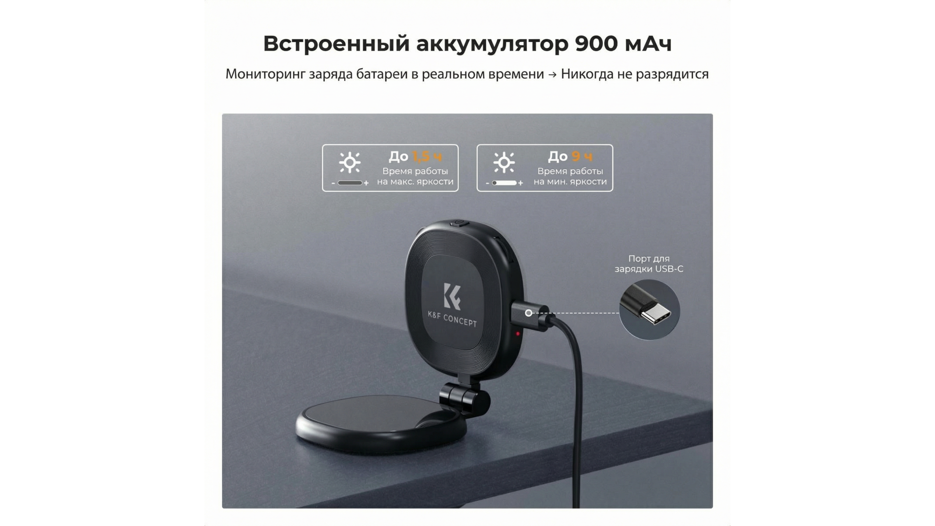 Автономность: Аккумулятора 900 мАч хватает до 9 часов работы. Зарядка через современный порт Type-C.