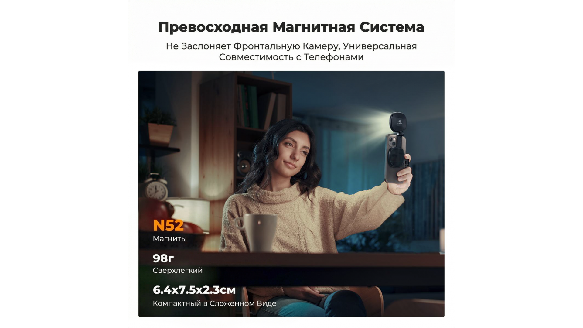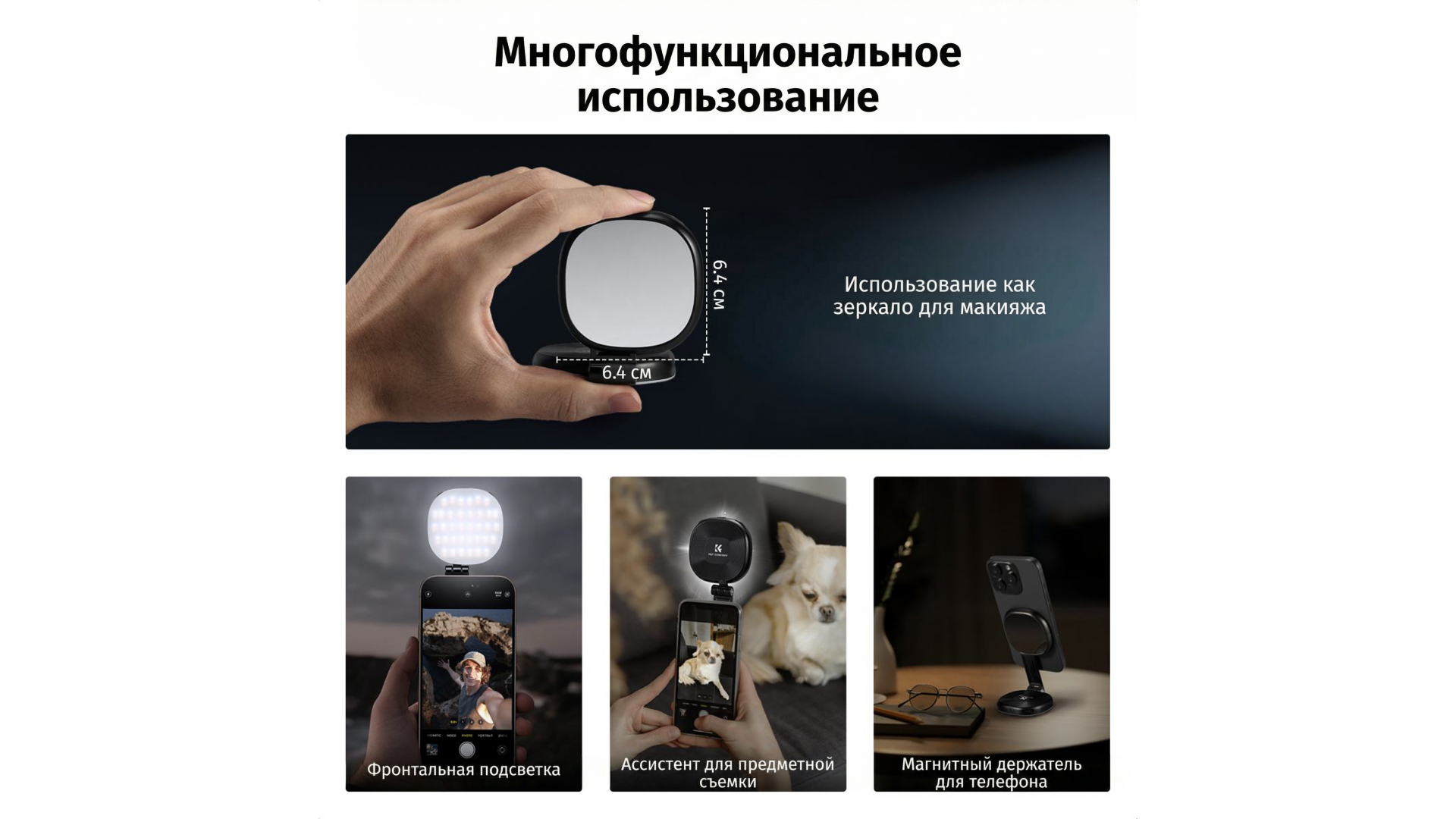Этот LED-осветитель мощностью 2 Вт создан для тех, кто ценит качество кадра. Главная фишка — мгновенное магнитное крепление (MagSafe) для iPhone 12-16 и других смартфонов с металлическим кольцом в комплекте.