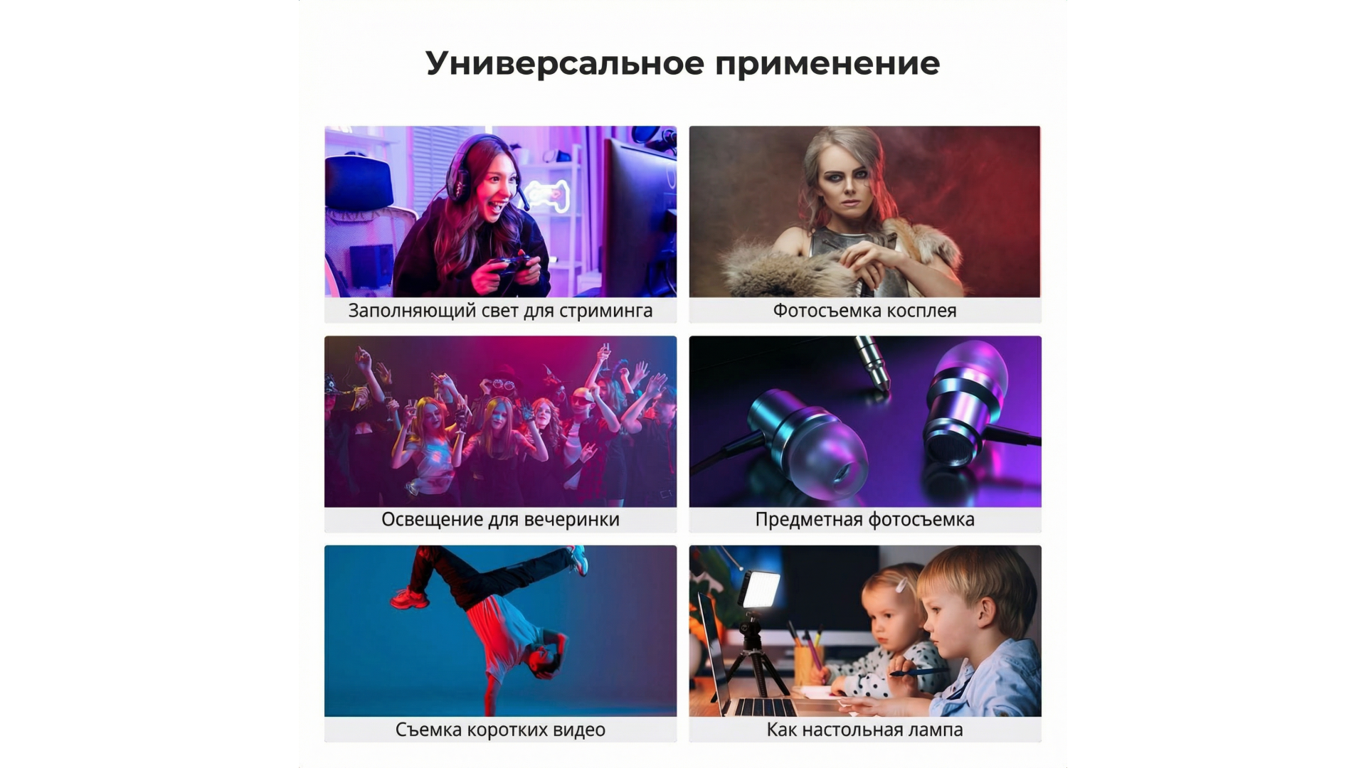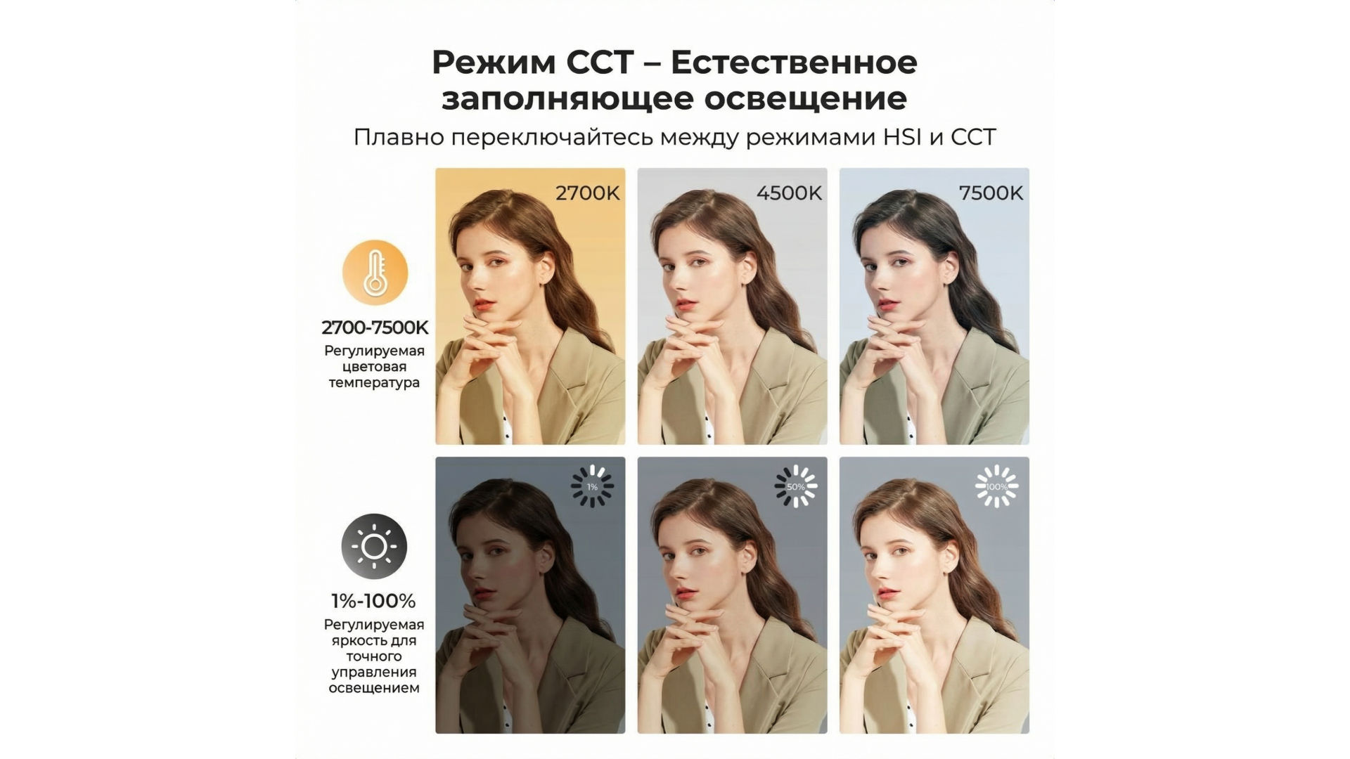 Мощный 10-ваттный осветитель с полноцветным RGB-спектром и 13 креативными сценариями (полиция, пожар, SOS). Обеспечивает точную настройку цвета (0–360°), насыщенности, цветовой температуры (2700K–7500K) и яркости (0–100%). Индекс цветопередачи CRI ≥95 гарантирует естественные оттенки даже при съемке крупным планом.