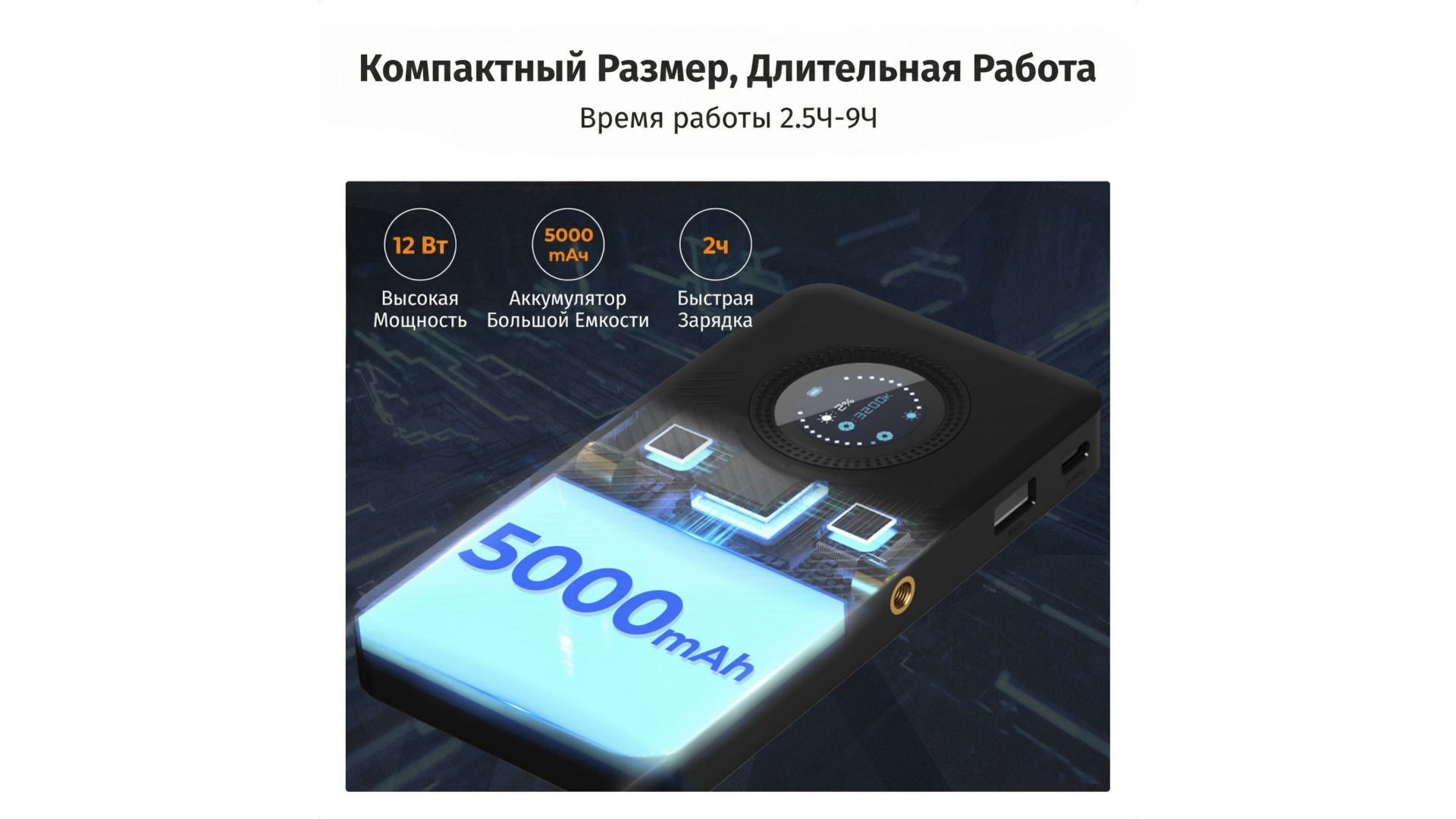 Ультрапортативный корпус (15x8x1,8 см, вес 193 г) легко помещается в кармане. Встроенный аккумулятор на 5000 мАч обеспечивает до 2,5 часов работы на максимальной яркости, а порт USB-A позволяет заряжать смартфон в дороге.
