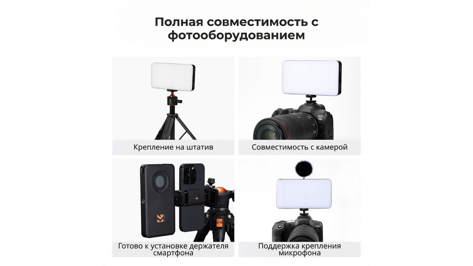 Управление интуитивное благодаря ЖК-дисплею. Два крепления 1/4" дают возможность установки на камеру, штатив или стенд. Идеальный выбор для видеоблогеров, предметной и мобильной съемки.