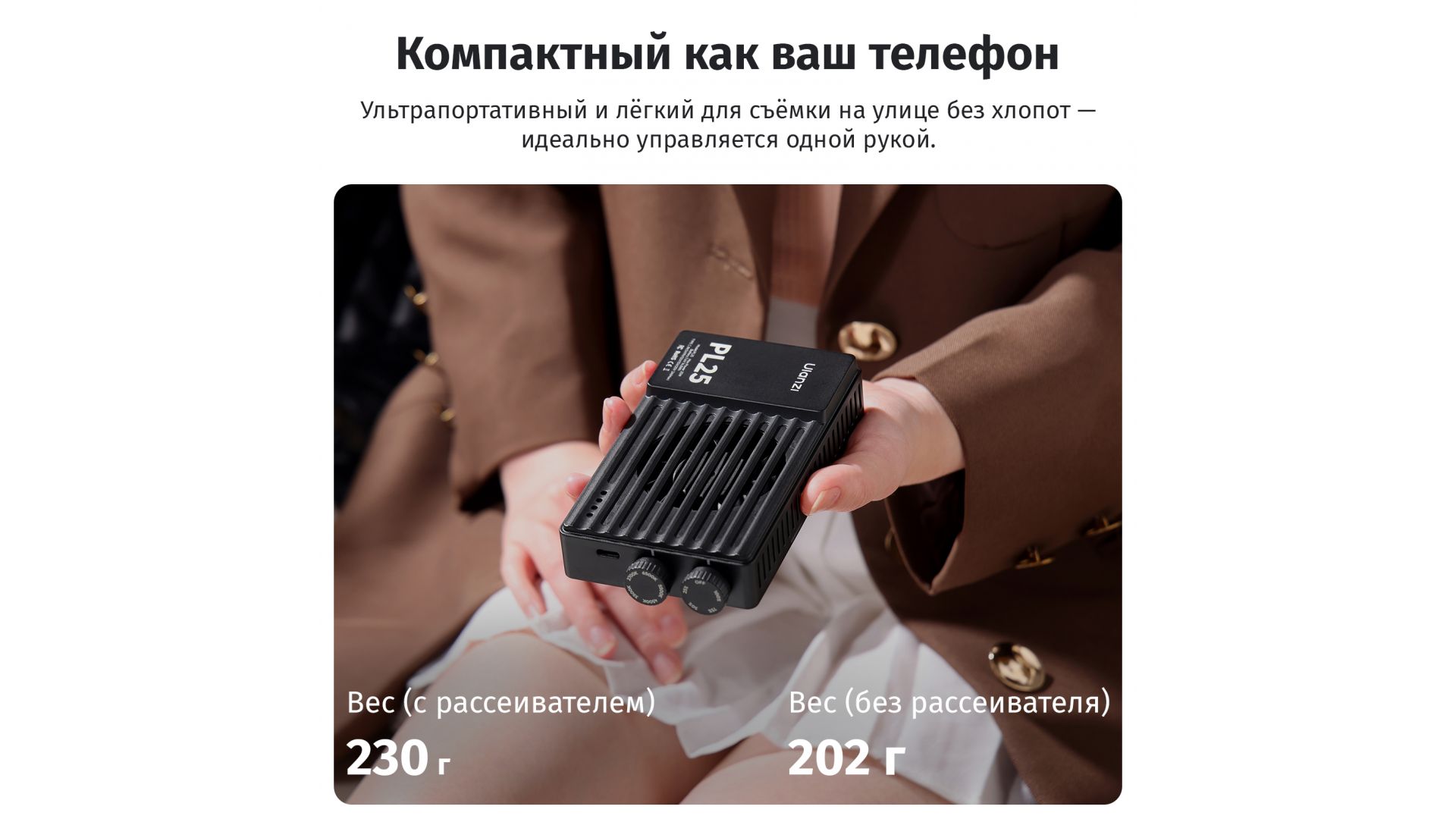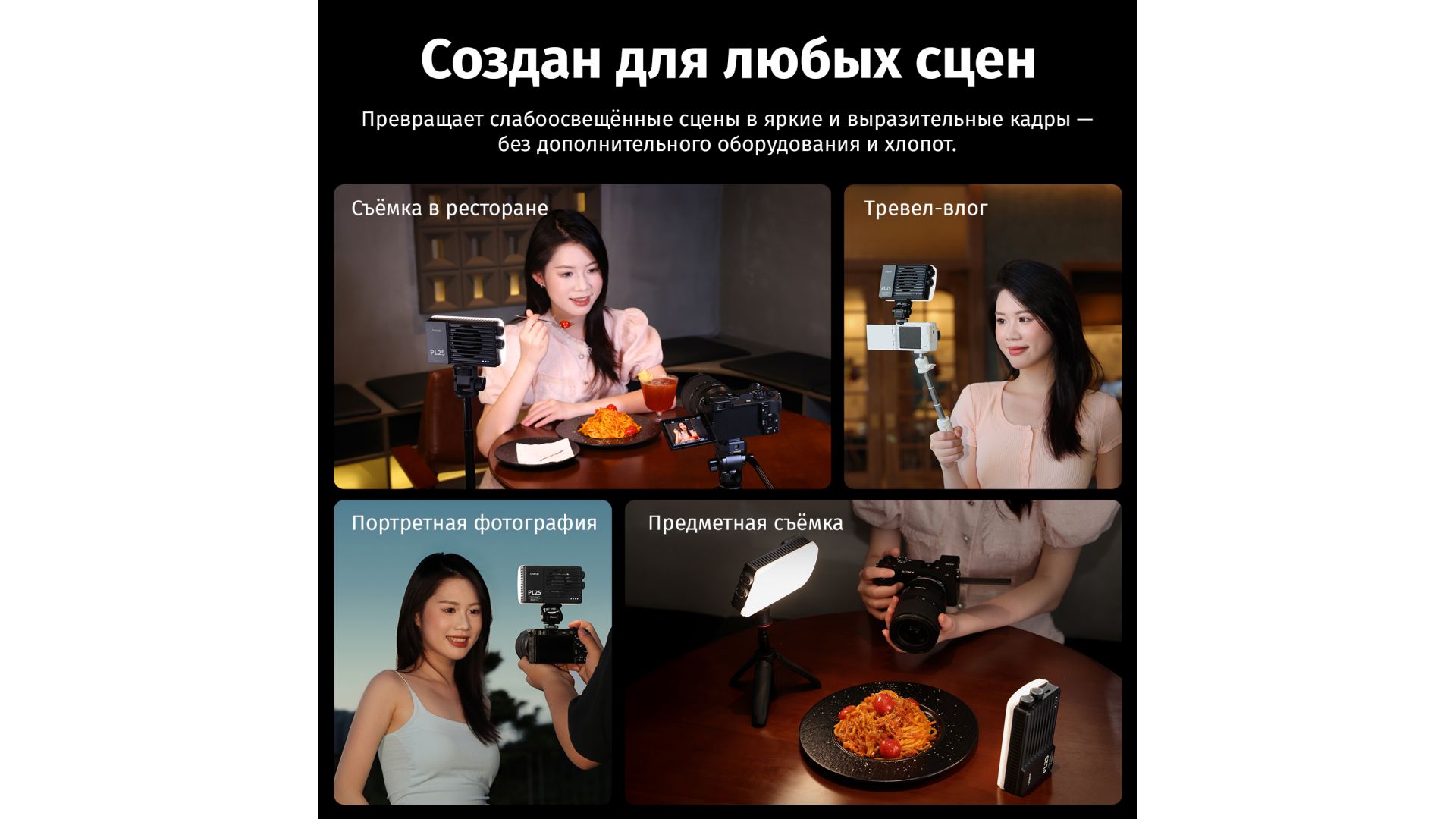 PL25 обеспечивает мощность 25 Вт и яркость 3200 люкс (0.5 м, 6500K), идеально подходя для съемки в условиях слабого освещения: ресторанных репортажей, тревел-влогов, предметной фотосъемки. Бицветный диапазон (2700K–6500K) с CRI/TLCI ≥96+ гарантирует точную цветопередачу. Вес всего 202 г и удобная форма позволяют легко управлять светом одной рукой.