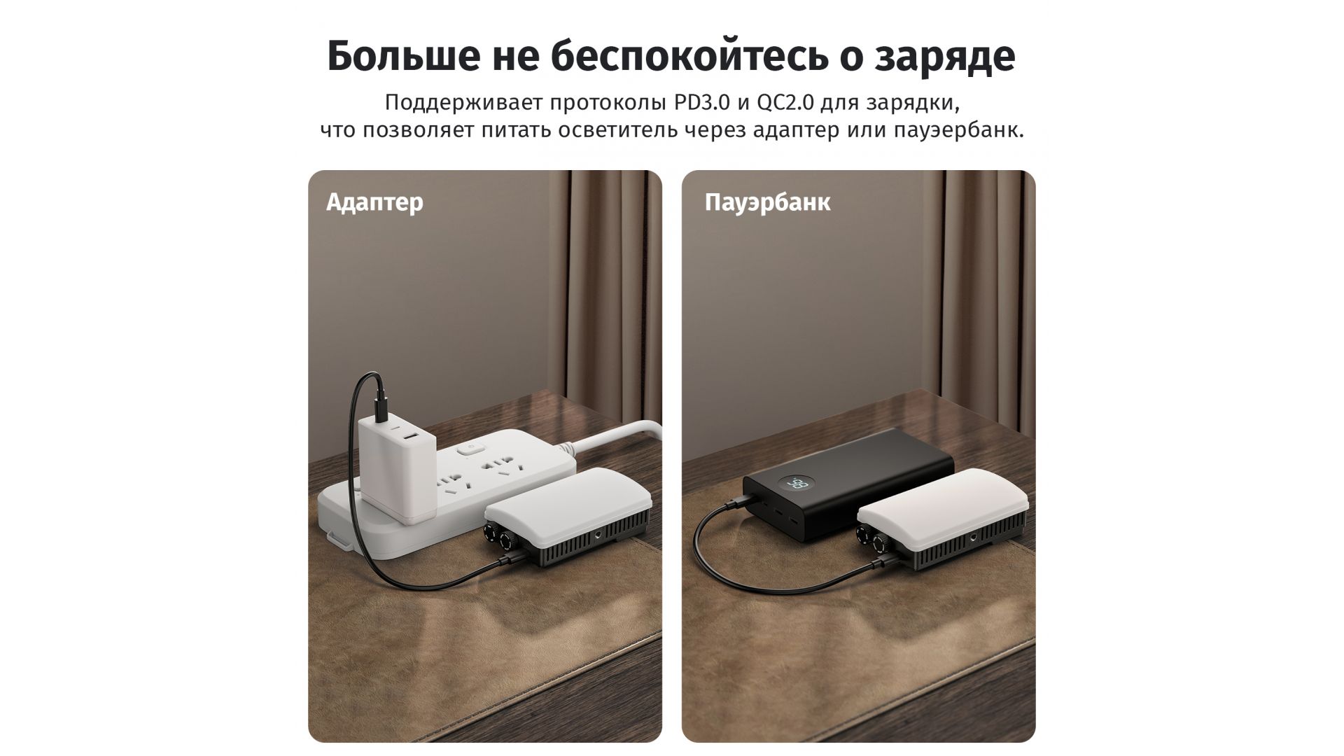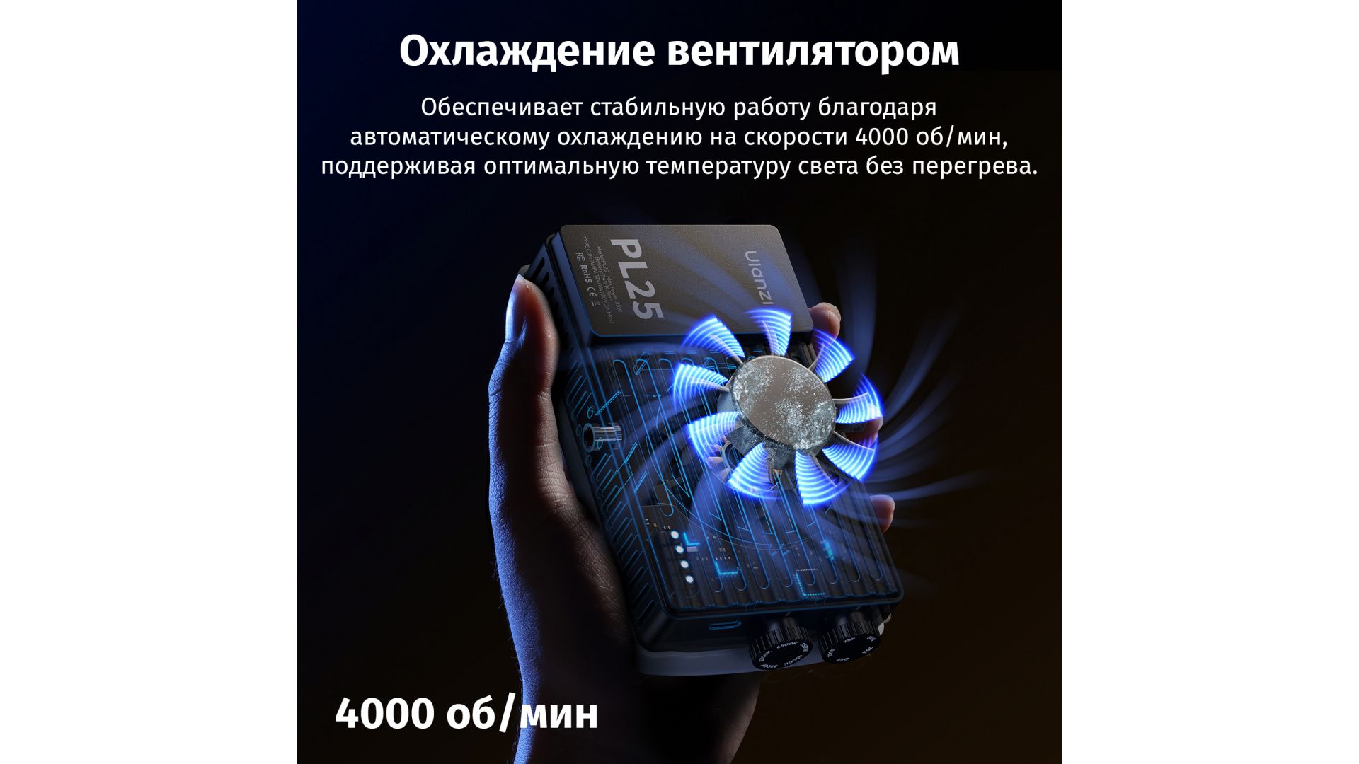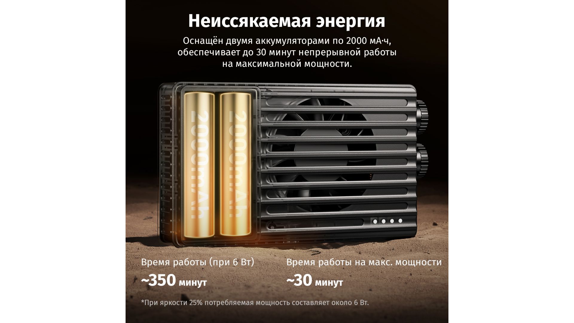 Встроенный аккумулятор 14.8 Втч обеспечивает до 30 минут работы на максимуме, а вентилятор (4000 об/мин) предотвращает перегрев. Поддержка быстрой зарядки PD3.0/QC2.0 (Type-C) совместима с Power Delivery-адаптерами и повербанками. Управление – через удобные диммеры на корпусе.