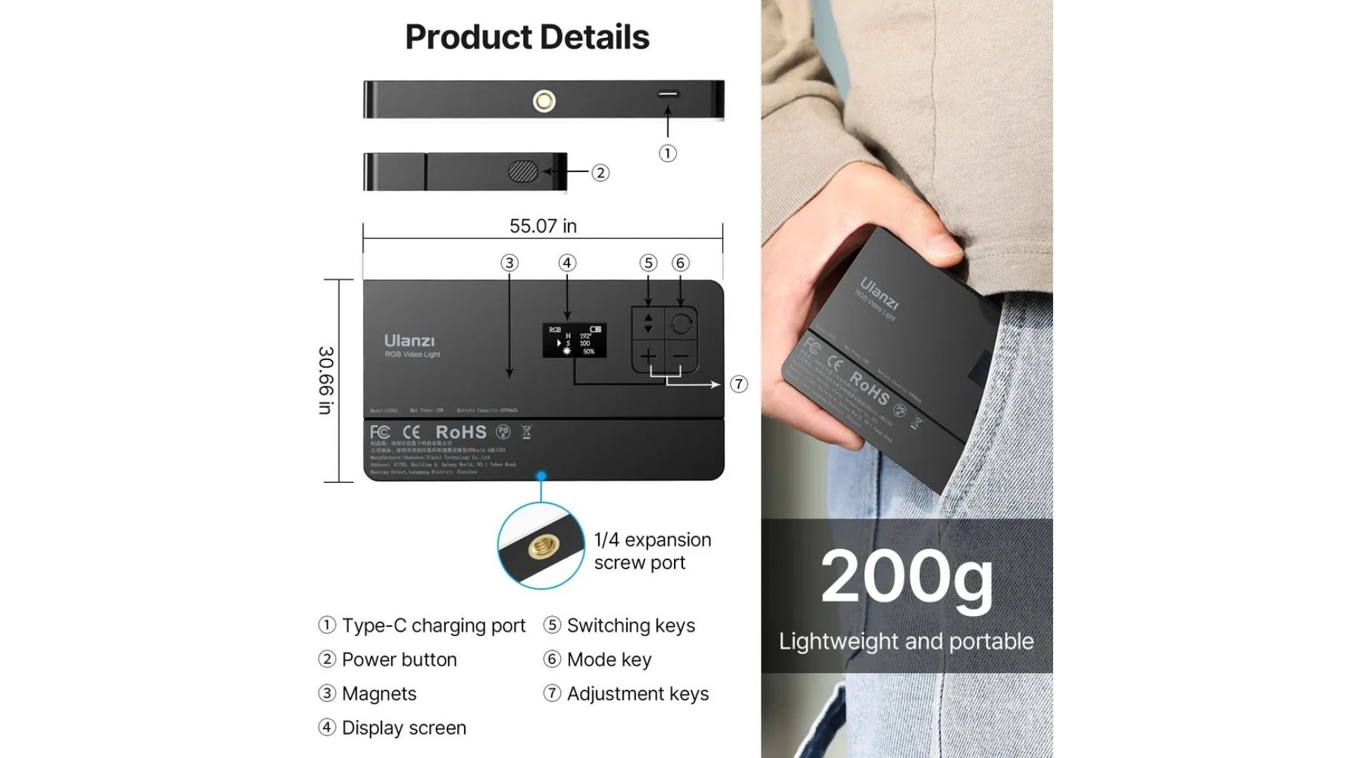 Светодиодная панель LT002 с RGB режимом и диагональю в 7". Он весит всего 200 грамм и легко помещается в кармане. Устройство крайне удобно брать с собой в поездки или использовать вне студий. Благодаря встроенному аккумулятору большой емкости емкостью 4000 мАч видеосвет может работать автономно до 90 минут при максимальной яркости, а также поддерживает функцию зарядки во время использования.