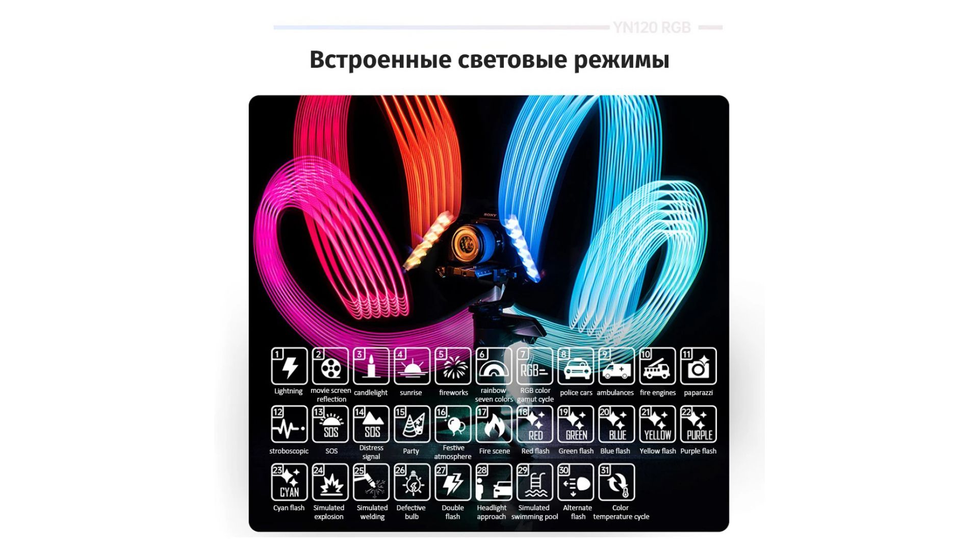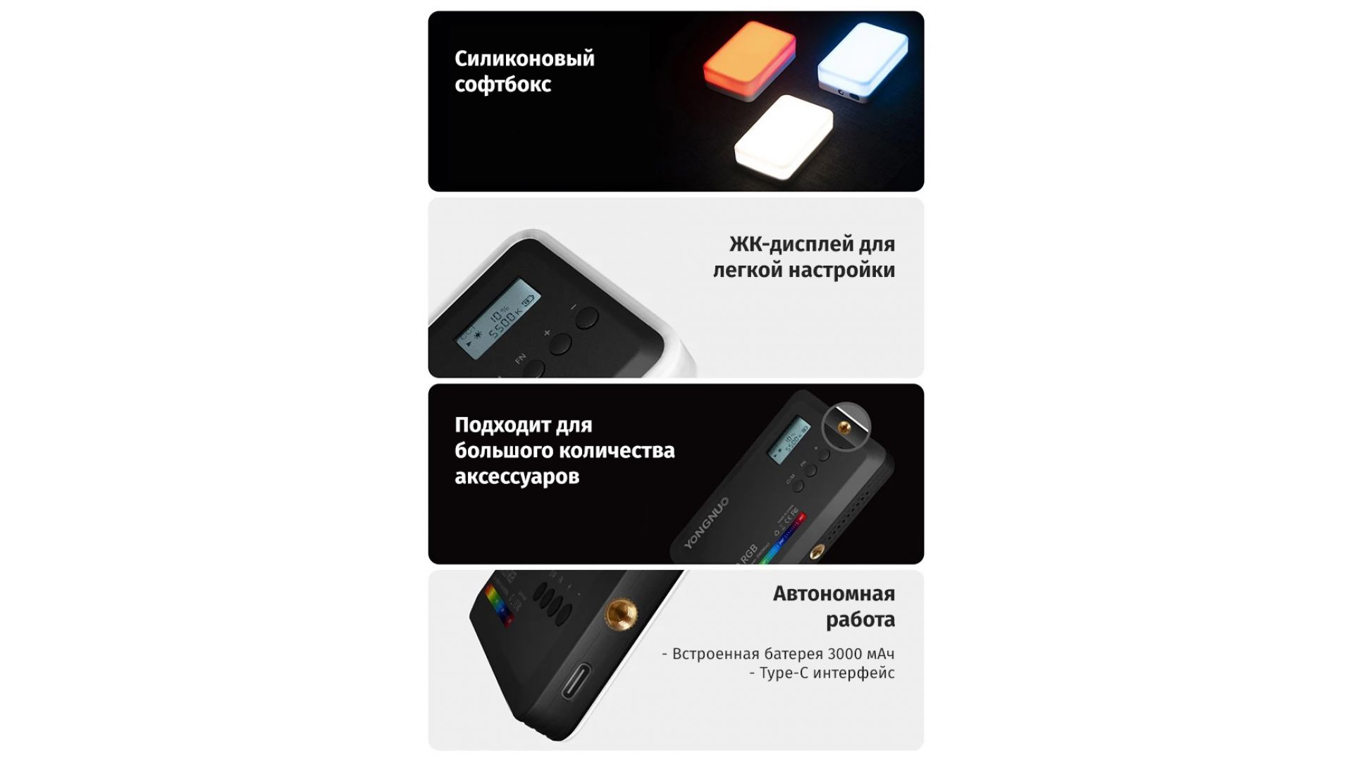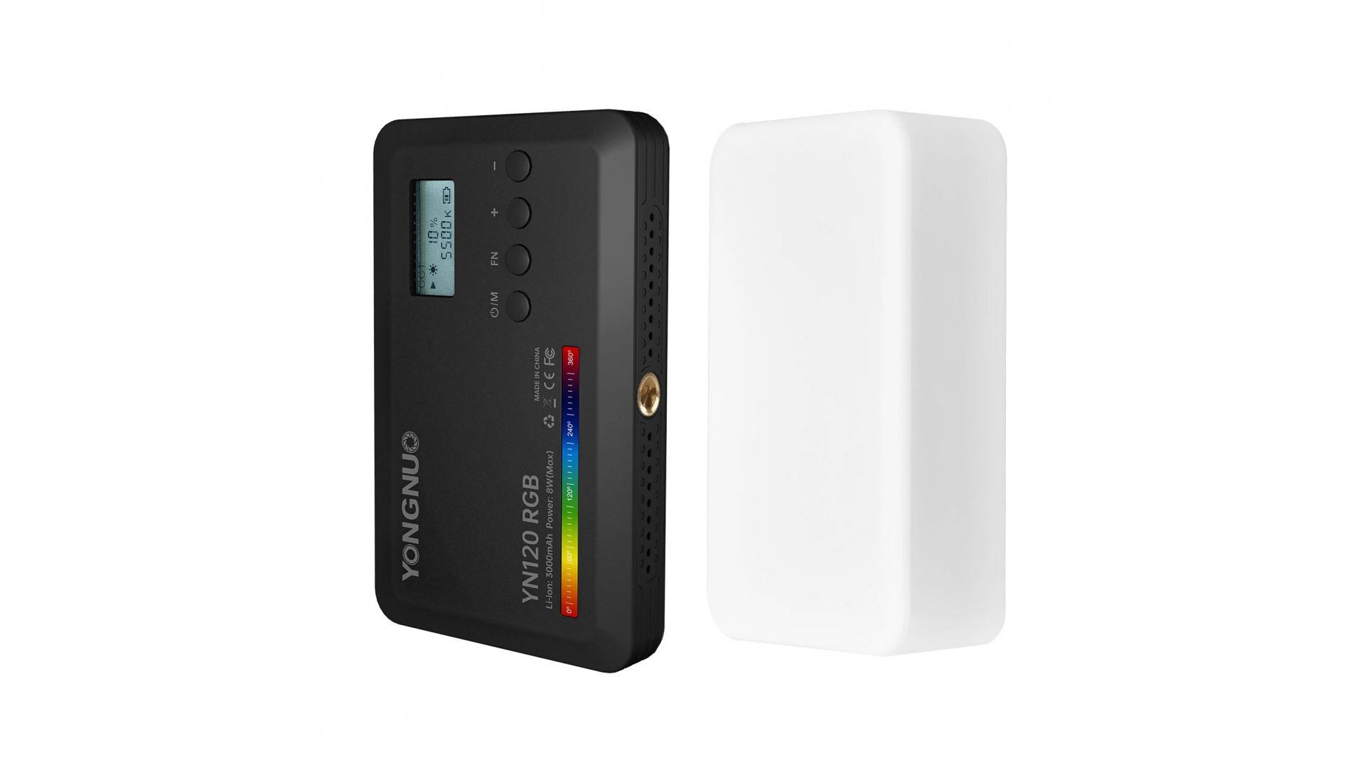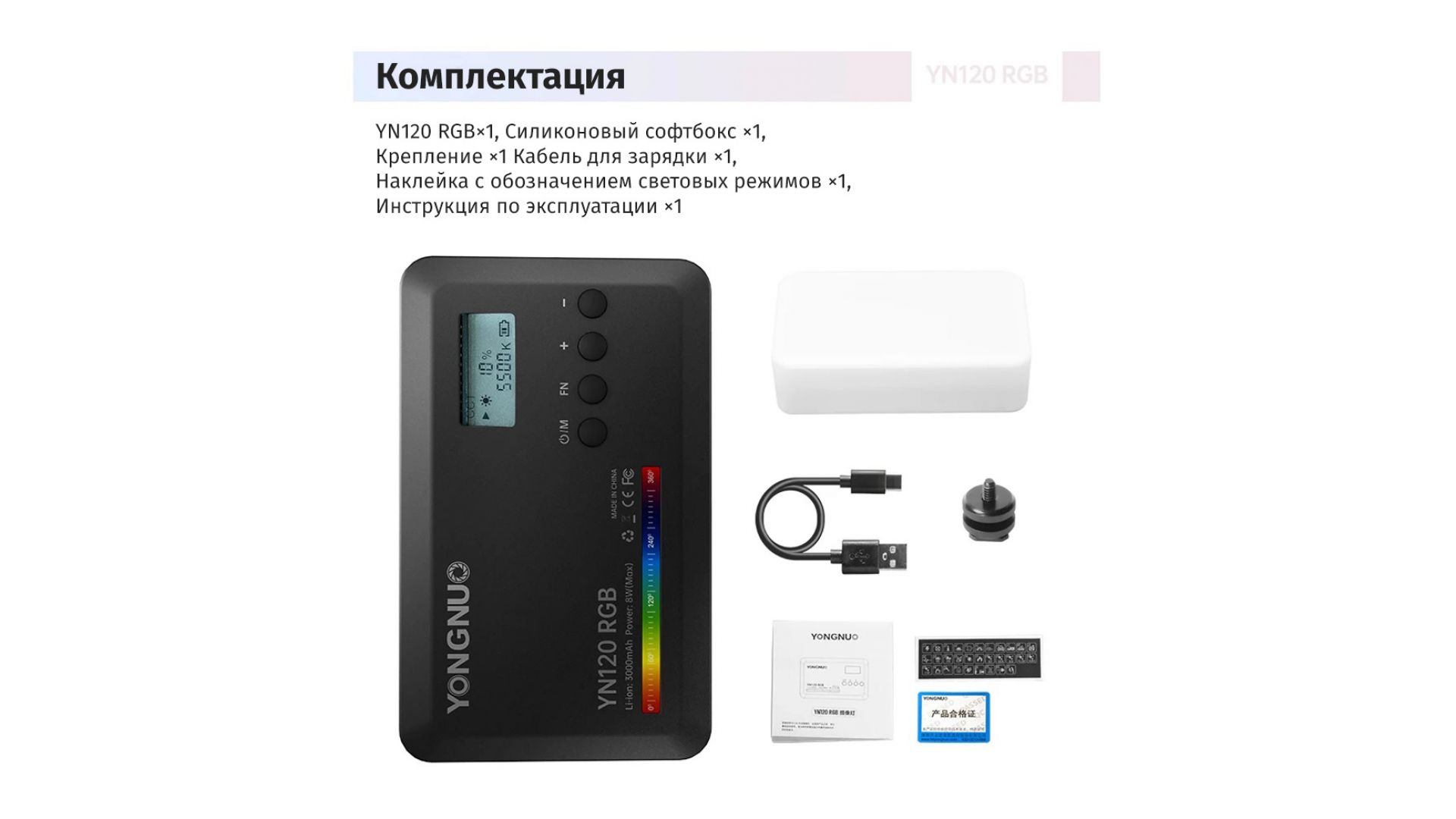 До 10 часов работы: В YN120 RGB встроен аккумулятор на 3000 мАч для автономной работы. Его запаса хватает на работу до 10 часов на средних настройках и до 1.5 часа на максимуме. Зарядить батарею можно посредством Type-C порта Комплектация: осветитель рассеиватель крепление на холодный башмак зарядный кабель.