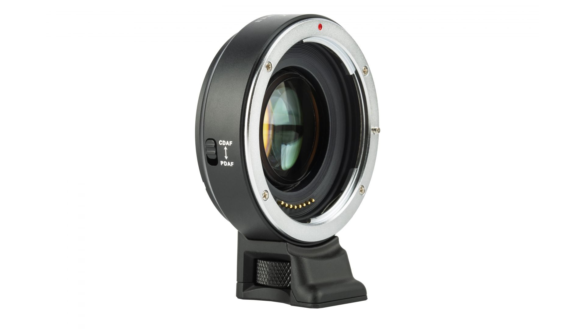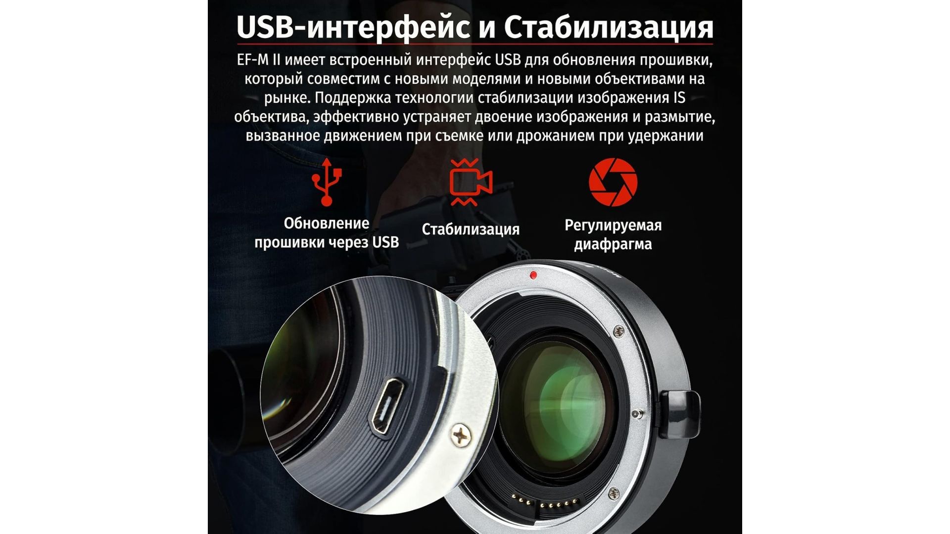 Кольцо не влияет на полноту захвата кадра, не вызывает искажений, бликов и перекосов. Корпус изготовлен из прочного алюминия, а контакты покрыты золотом для лучшей передачи сигнала. Также имеется USB-порт для обновления прошивки адаптера. Штативный адаптер оснащен гнездом под винт 1/4".