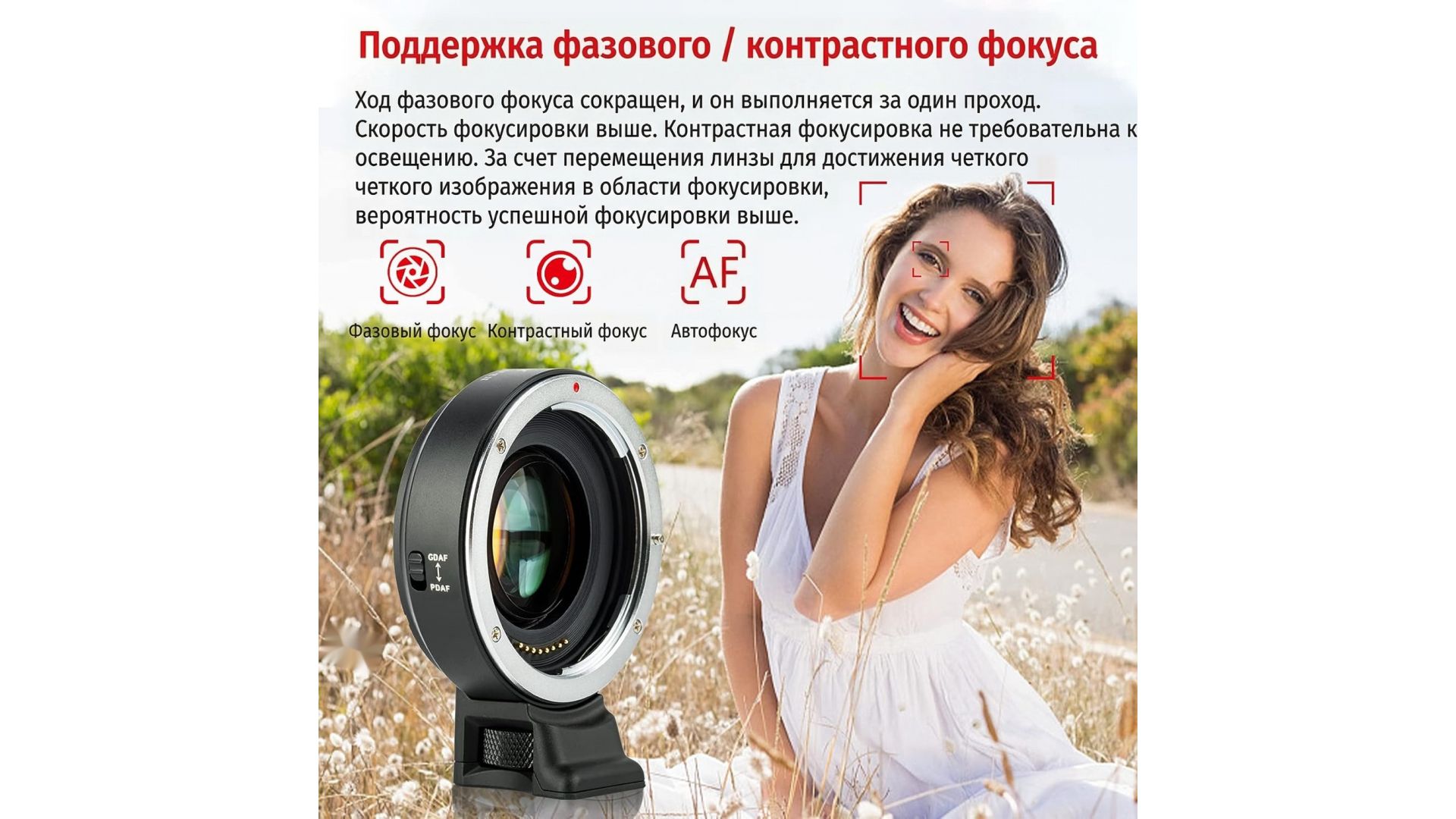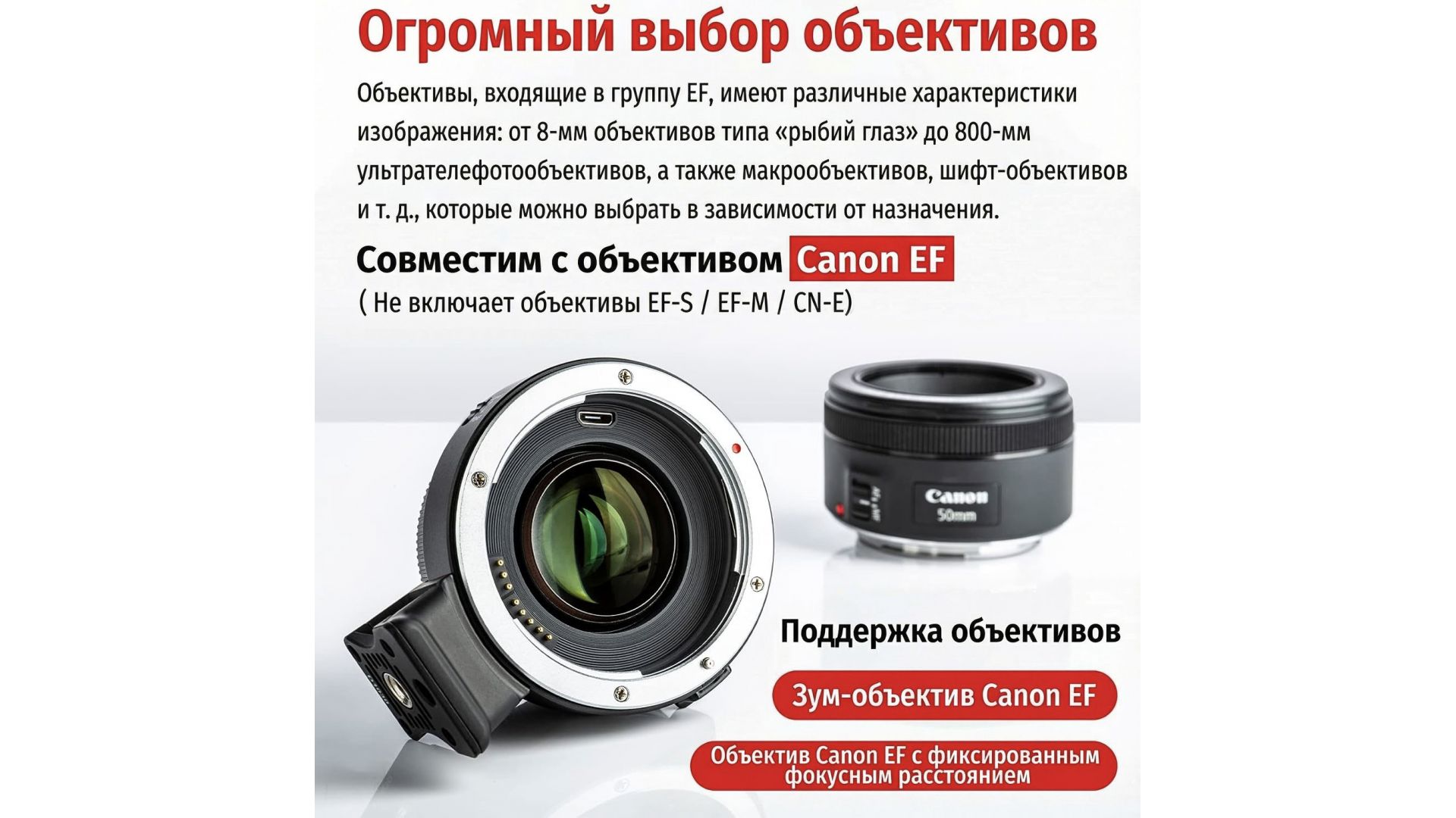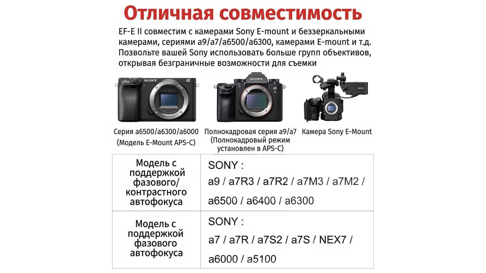 Совместим с камерами Sony A9 / A7 / A7R / A7S / A6XXX / NEX и видеокамерами VG. Поддерживает только объективы с креплением Canon EF. НЕ работает с объективом EF-S.