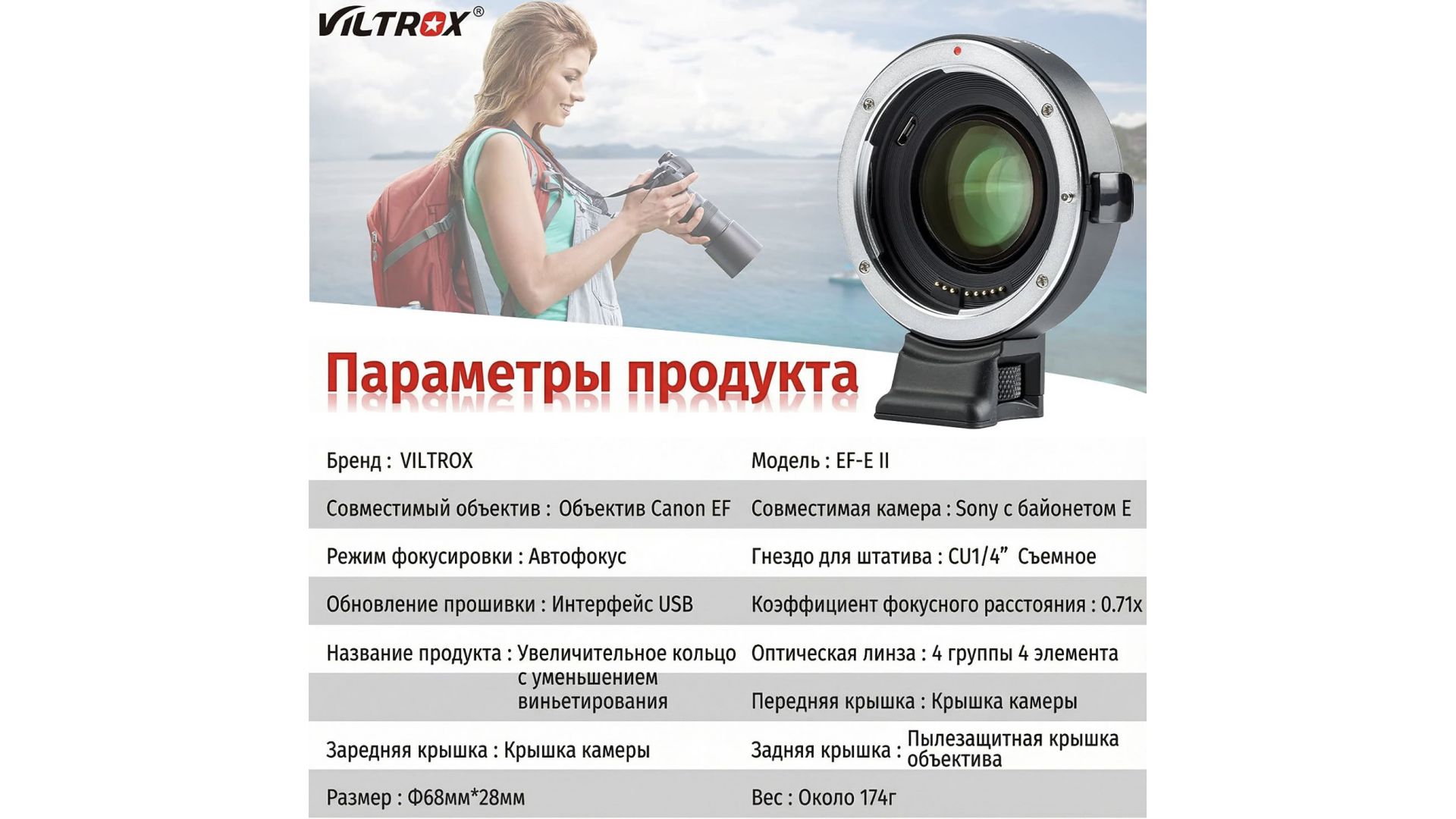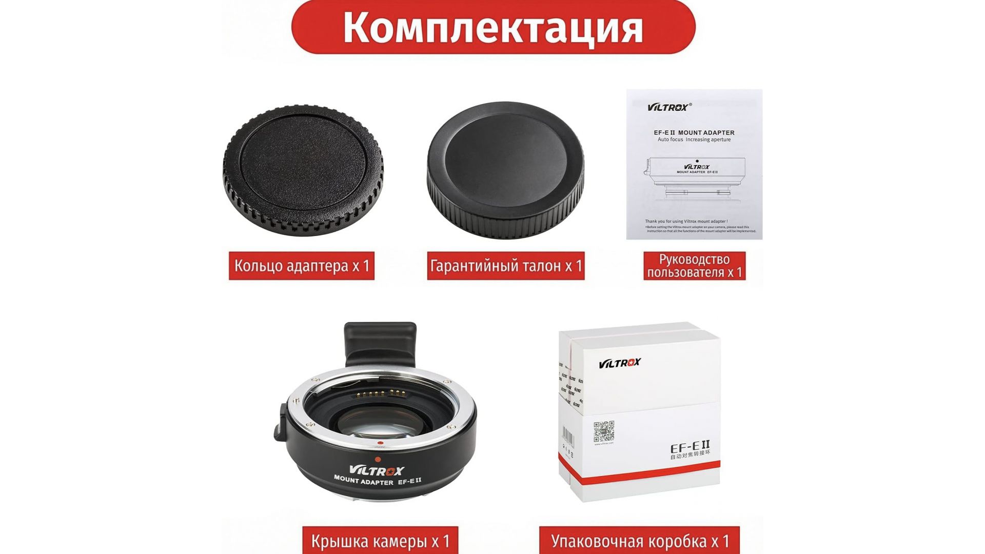 Комплектация:Адаптер объектива EF-E II, передняя крышка, задняя крышка, руководство пользователя