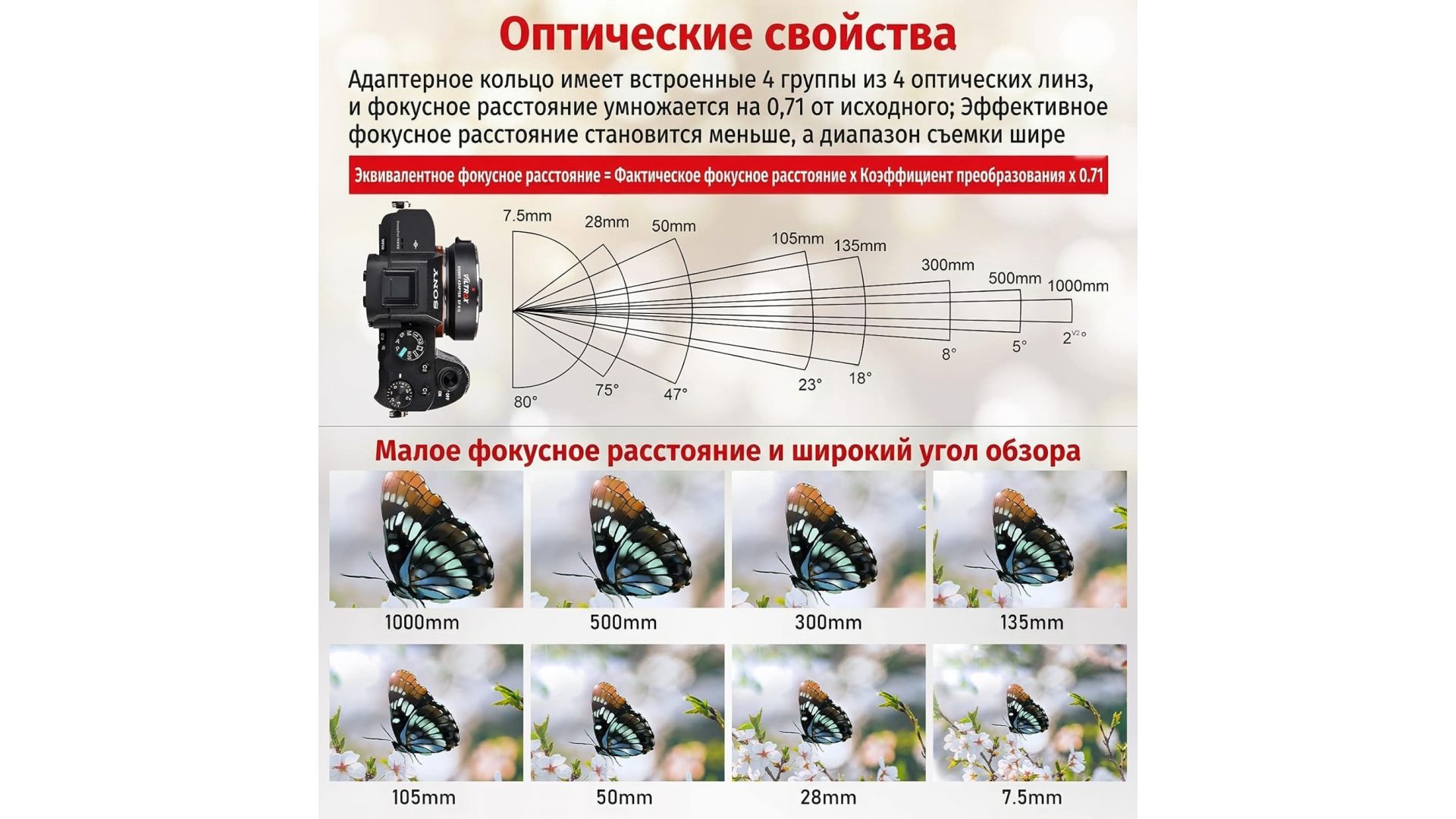 Компенсация кроп-фактора камеры (0,71х) происходит благодаря встроенной высококачественной линзе (4 элемента/4 группы) с антибликовым покрытием. Увеличение диафрагмы на 3 ступени. Передача сигнала EXIF.