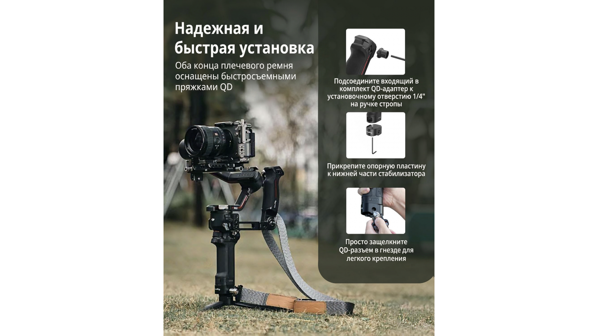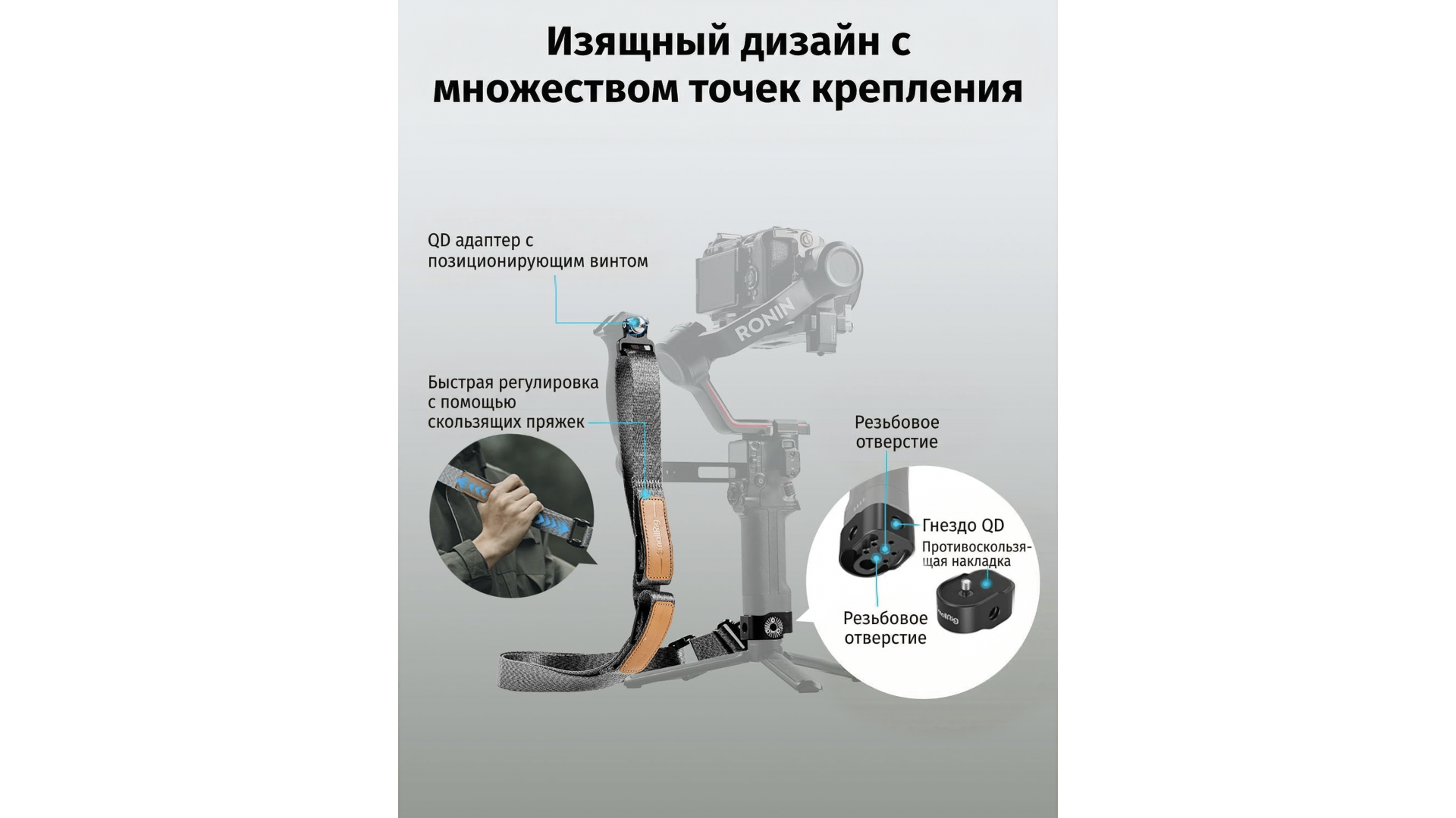 - Быстросъемный шарнир: два быстросъемных шарнира QD для быстрого крепления и снятия в различных режимах съемки.