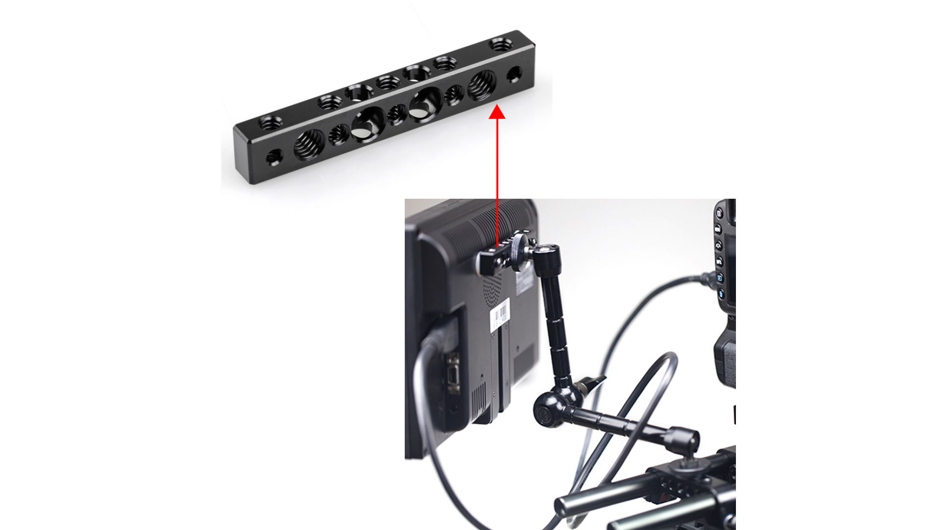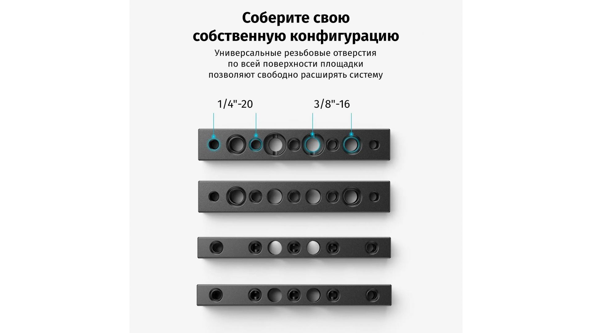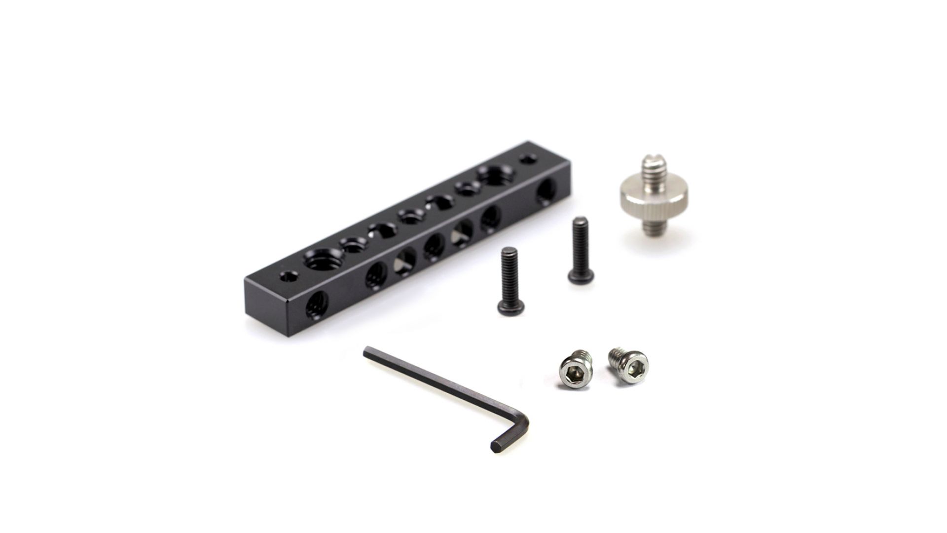 Площадка имеет форму прямоугольного бруска с резьбовыми сотами стандартов ¼" и 3/8", что позволяет легко устанавливать дополнительные аксессуары. В комплект входят: