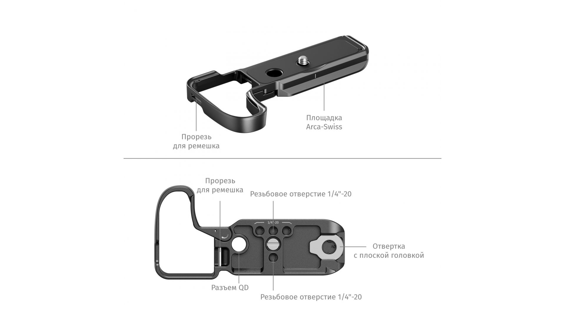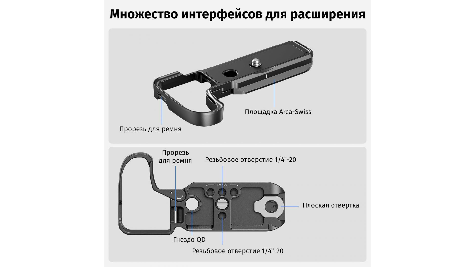 Оснащена резьбой 1/4" для крепления аксессуаров и быстросъемной площадкой Arca-Swiss для совместимости со штативами и стабилизаторами DJI (RS2, RSC 2, RS3/Pro, RS4/Pro). Порт QD позволяет крепить плечевые ремни, а отверстие подходит для запястного ремня (ID 4881).