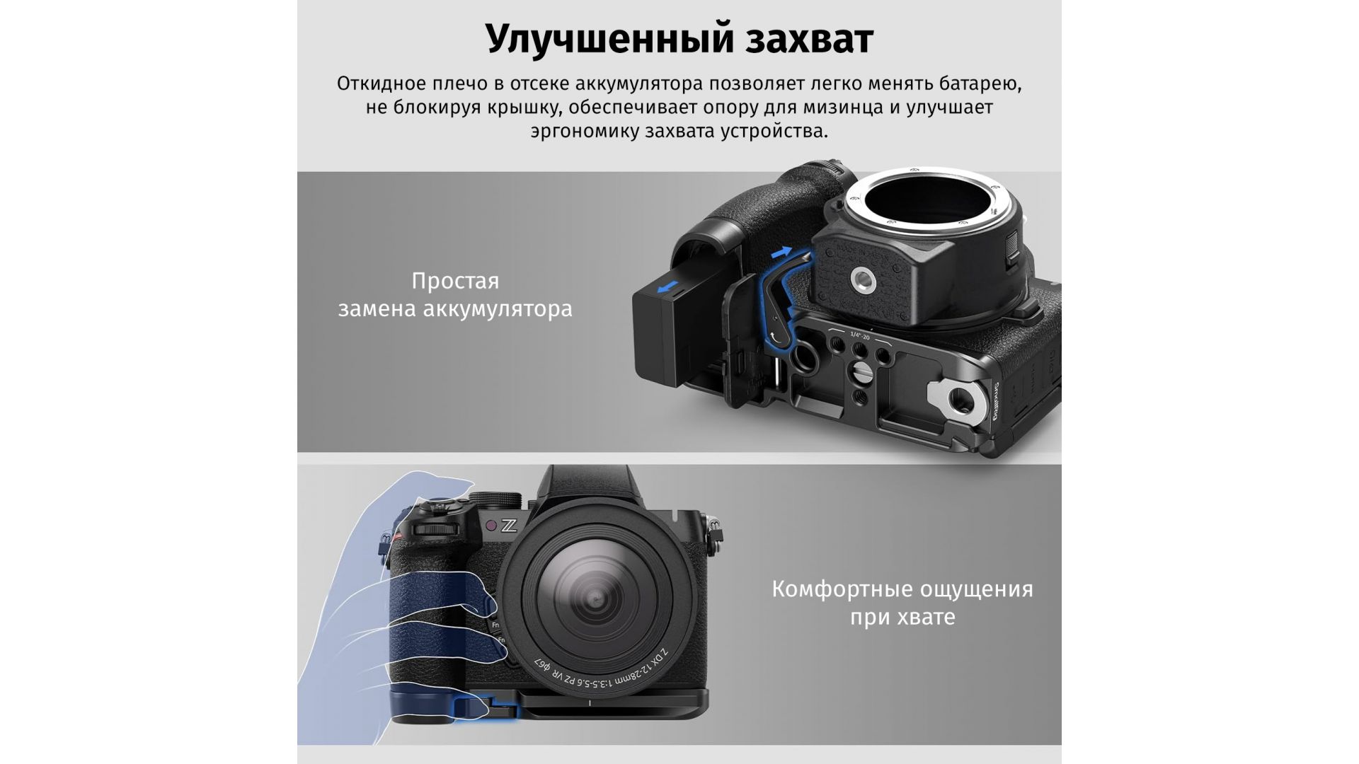Площадка SmallRig 4981 для Nikon Z50 II повышает эргономику камеры, обеспечивая защиту основания и удобный хват. Крепится винтом 1/4" с защитной прокладкой, предотвращающей царапины. Откидная дверца батарейного отсека поддерживает мизинец, улучшая захват.