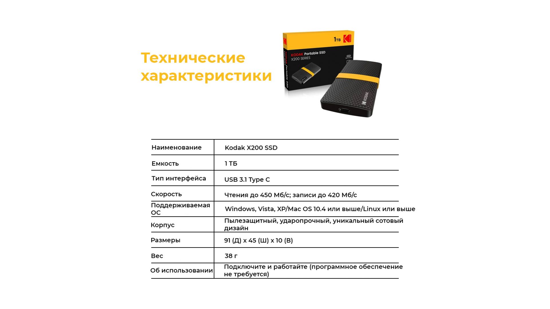 Портативный SSD-накопитель Kodak X200 1 ТБ — компактное и надёжное решение для хранения и переноса больших объёмов данных. Фактический объём памяти около 930 ГБ, что позволяет сохранять тысячи файлов, фото и видео.