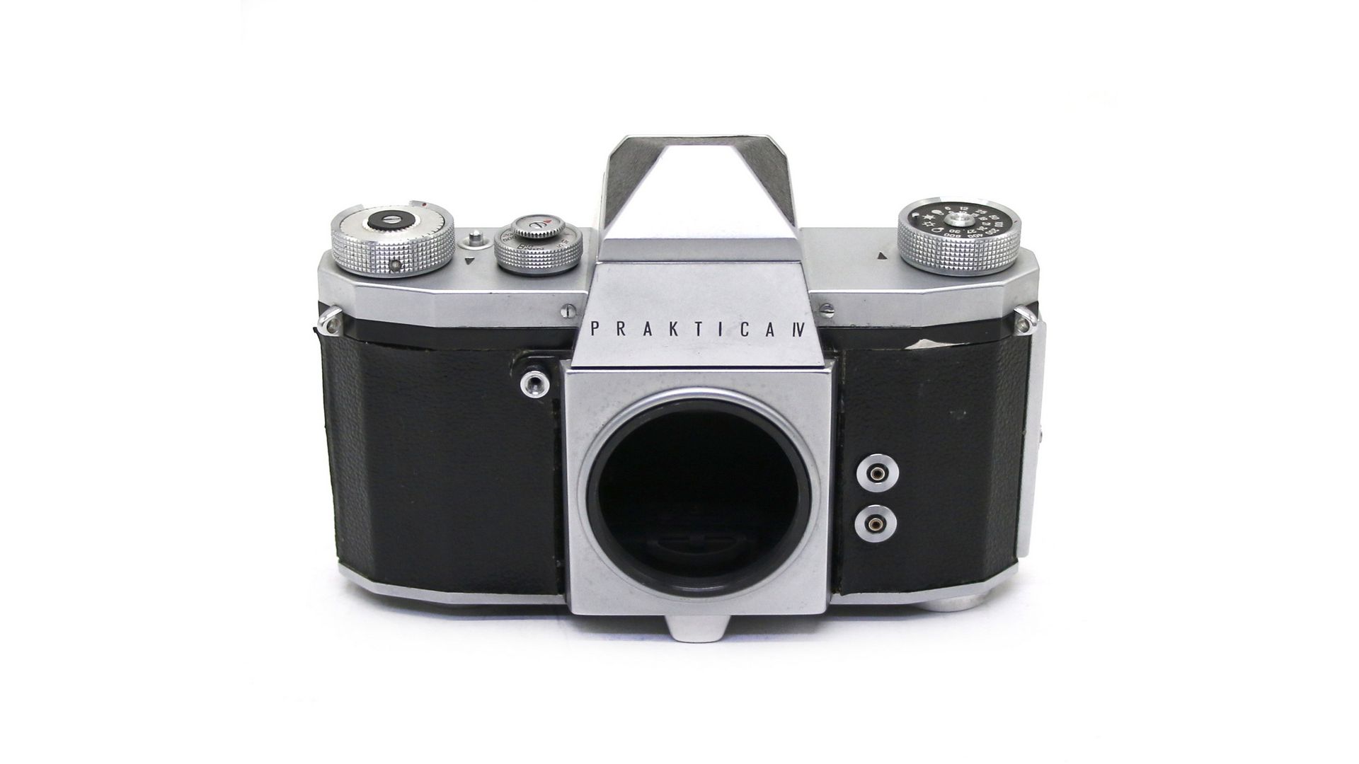 Пленочная фотокамера Praktica IV. Производитель Kamera Werkstätten Guthe & Thorsch, Германия, 1959 год. Praktica IV был основан на базе Praktica FX, и был фактически первым фотоаппаратом Praktica, имеющим фиксированную пентапризму.