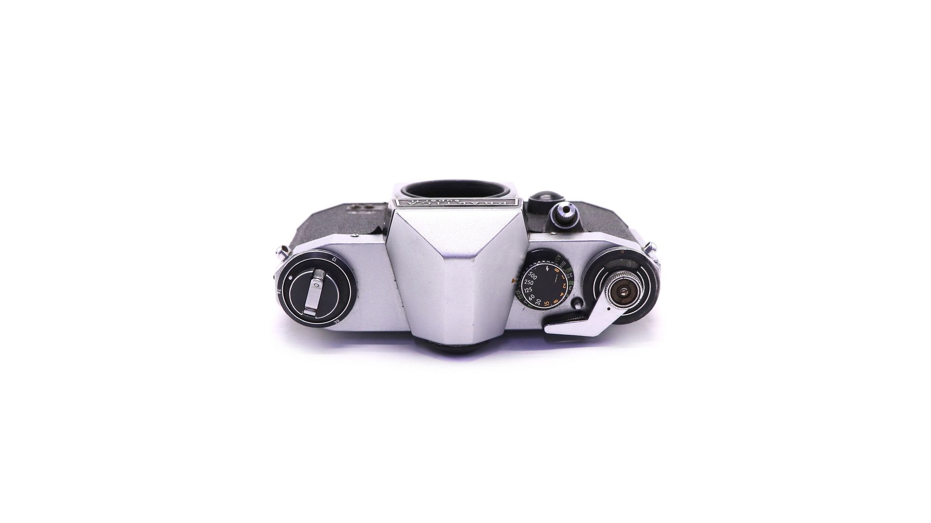Затвор фотоаппарата имеет диапазон от 1 до 1/500 сек. и выставляется поворотом головки на верхней панели рядом с взводной головкой. Поворотом этой же головки, если её приподнять вверх, выставляется чувствительность плёнки в стандарте DIN или ASA. В левой части панели расположена головка обратной перемотки плёнки и памятный диск, на котором можно выставить количество кадров используемой плёнки — 12, 20 или 36 кадров. Рядом со взводной головкой кнопка расцепки плёнки для обратной перемотки. Спусковая кнопка удобно расположена в верхней части передней панели и имеет резьбу для тросика мягкого спуска. Внизу левой части панели — два гнезда синхроконтакта вспышки "F" и "X".