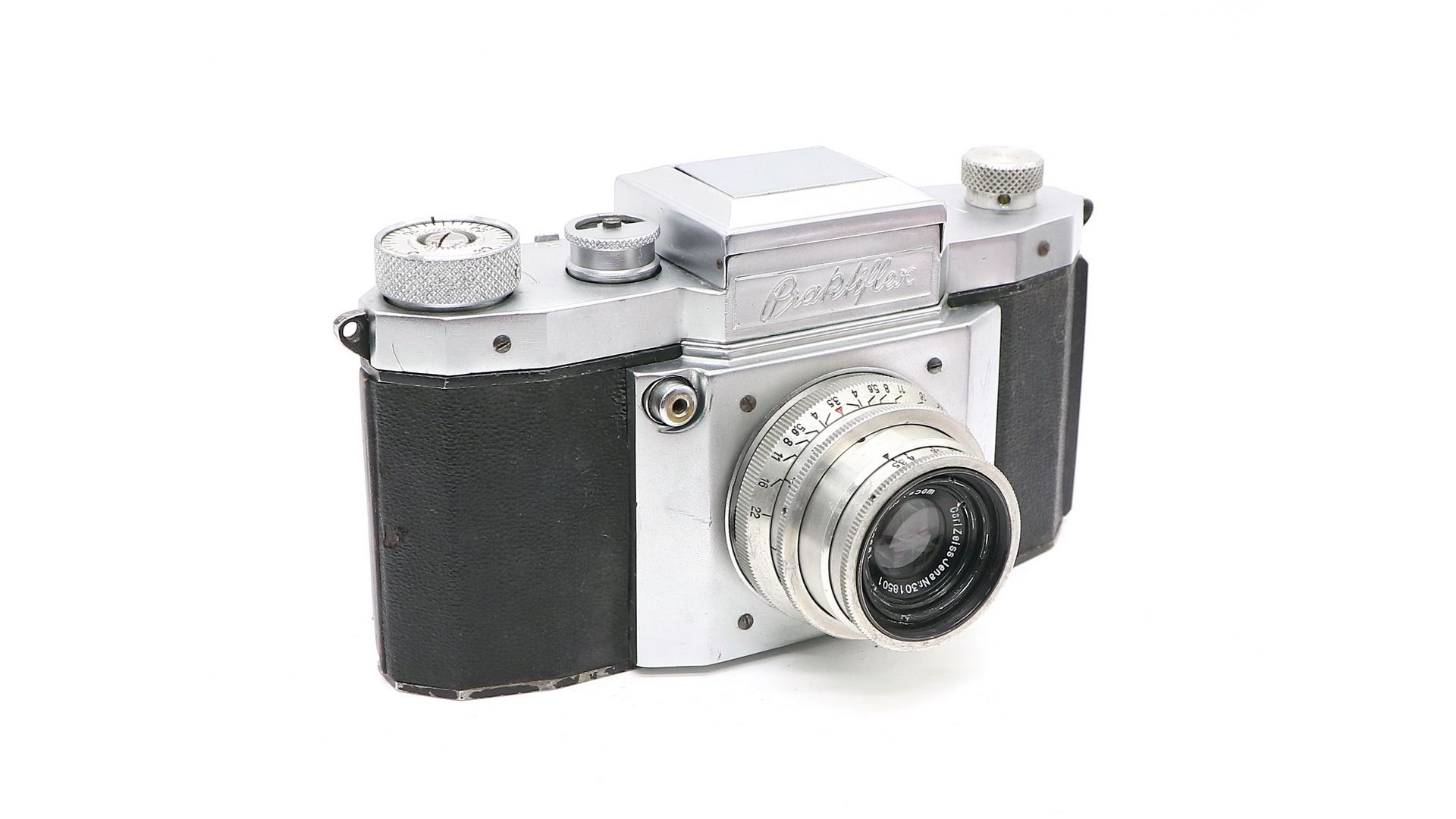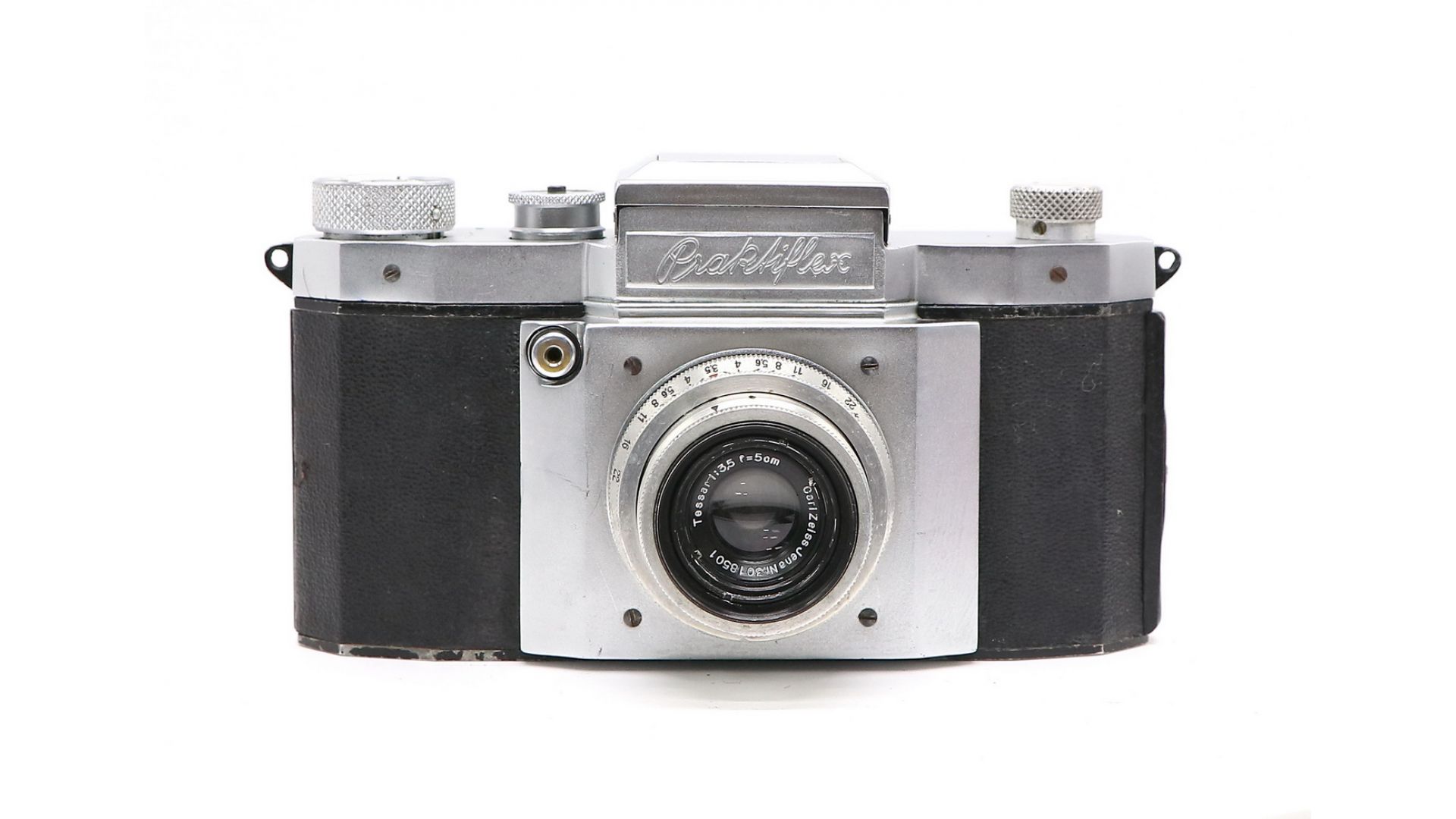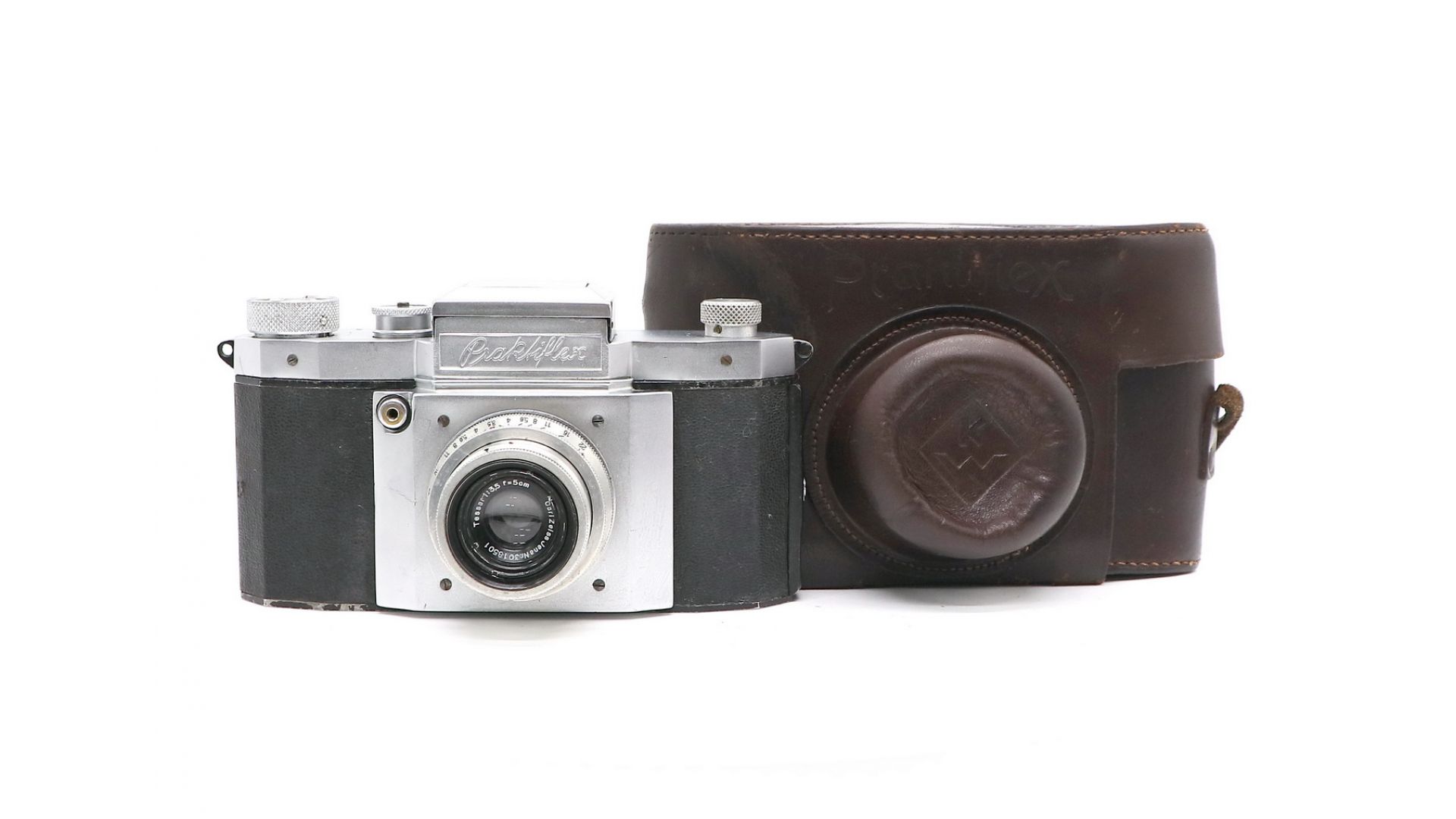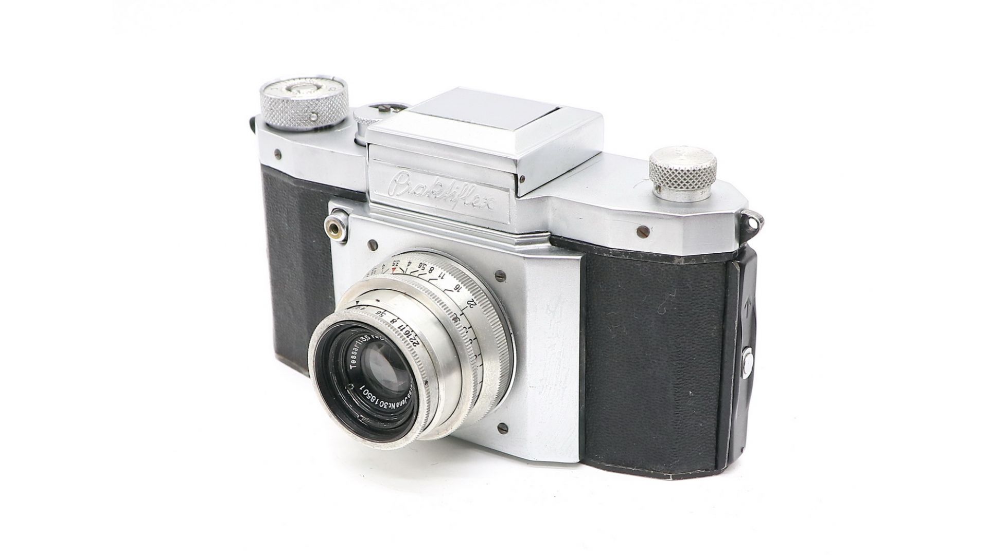 Зеркальный фотоаппарат Praktiflex + Tessar 50mm f/3.5. Произведен компанией Kamera Werkstätten Guthe & Thorsch в 1946 году. Всего было выпущено 33900 камер этой модели.
