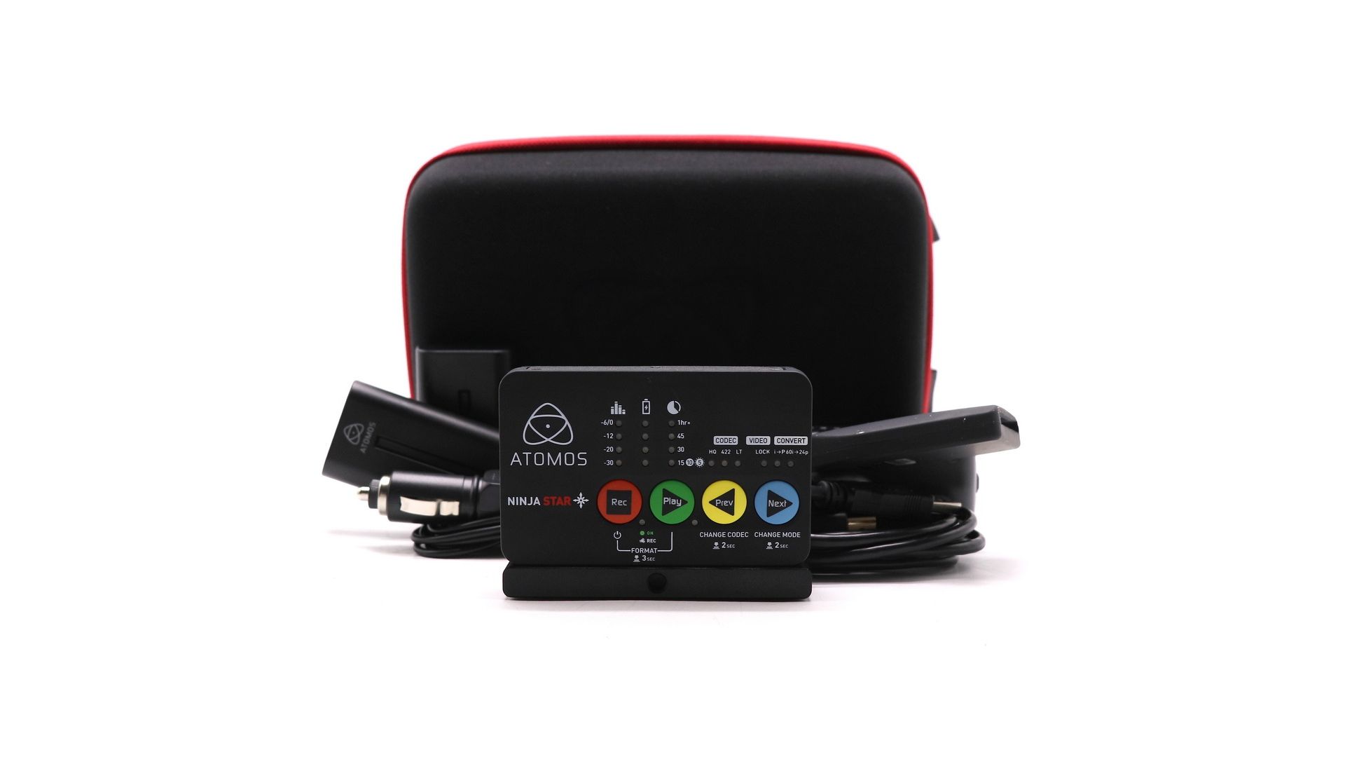 Комплектация:Кейс, аккумулятор, адаптер питания от сети, картридер Atomos, кабель HDMI.