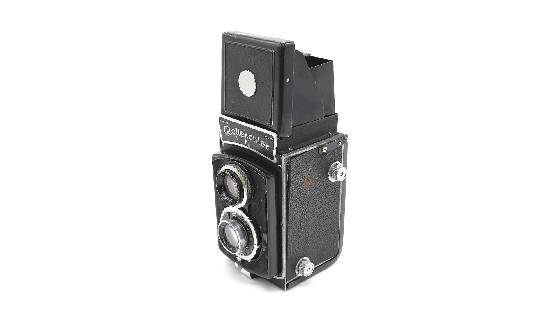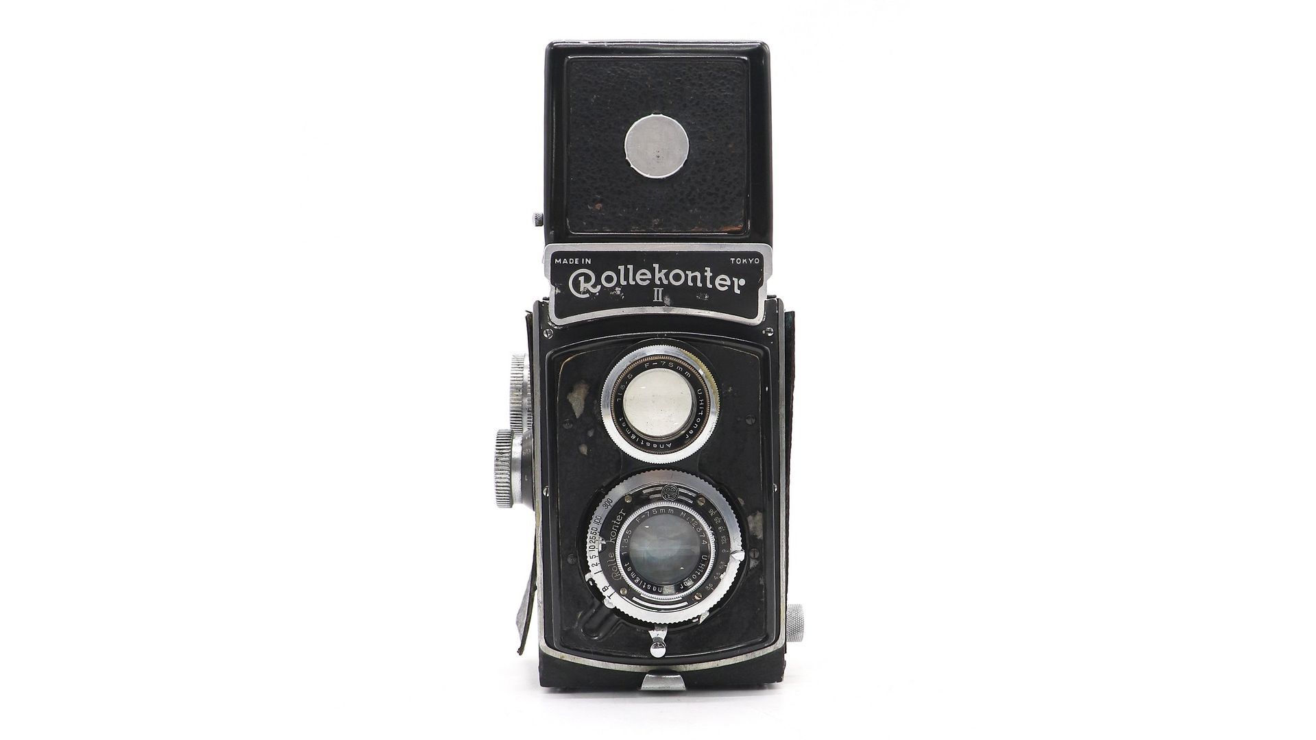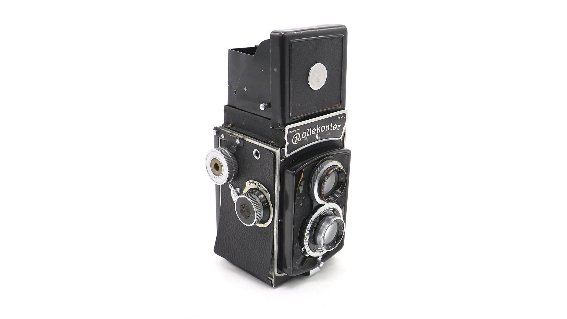 Rollekonter II в хорошем состоянии, повреждена направляющая механизма закрытия шахты. Не корректно отрабатывает выдержки 1, 1/2, 1/5, 1/10. Камера оснащена объективами U Hitonar Anastigmat 75mm f / 3.5.
