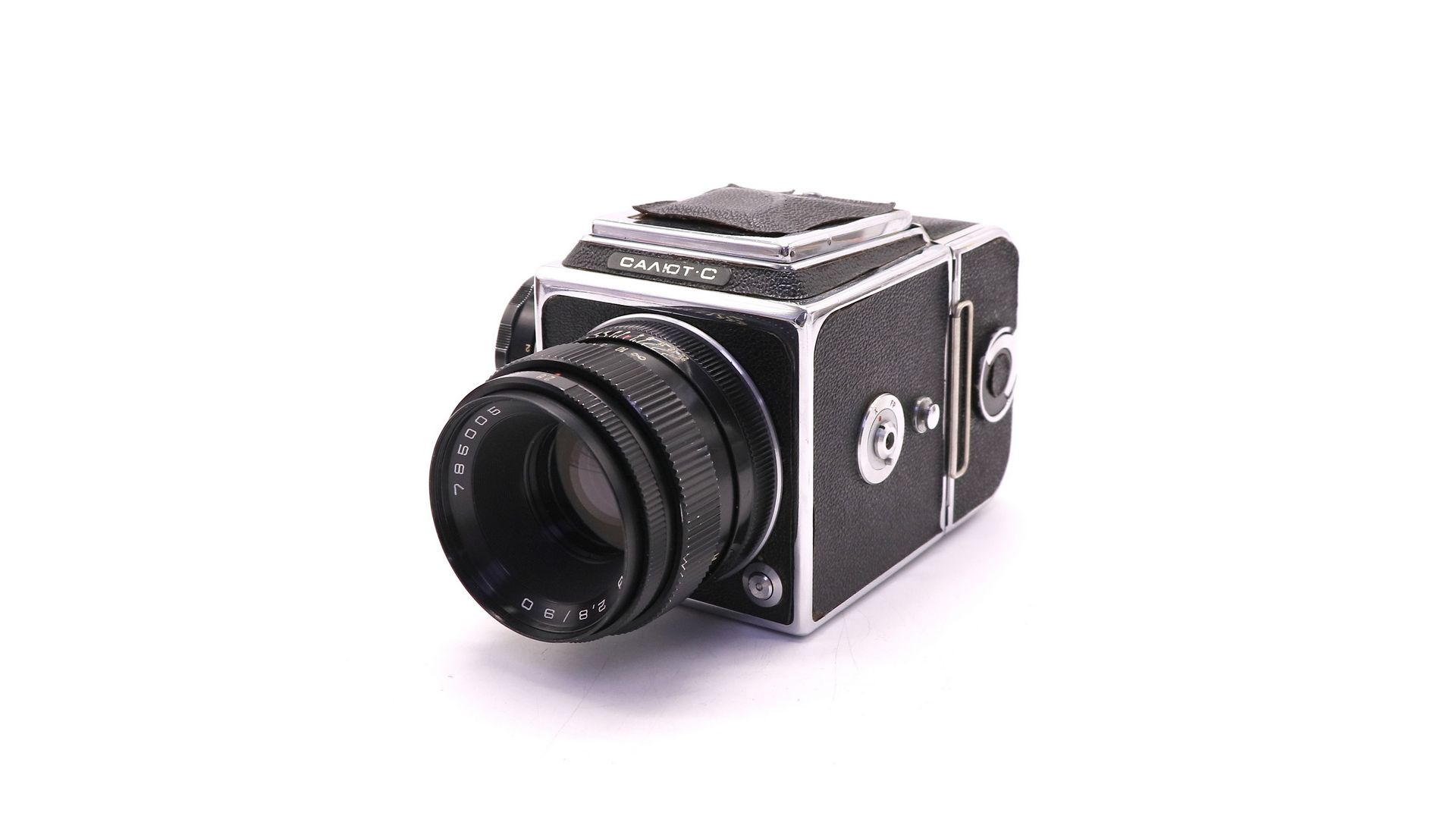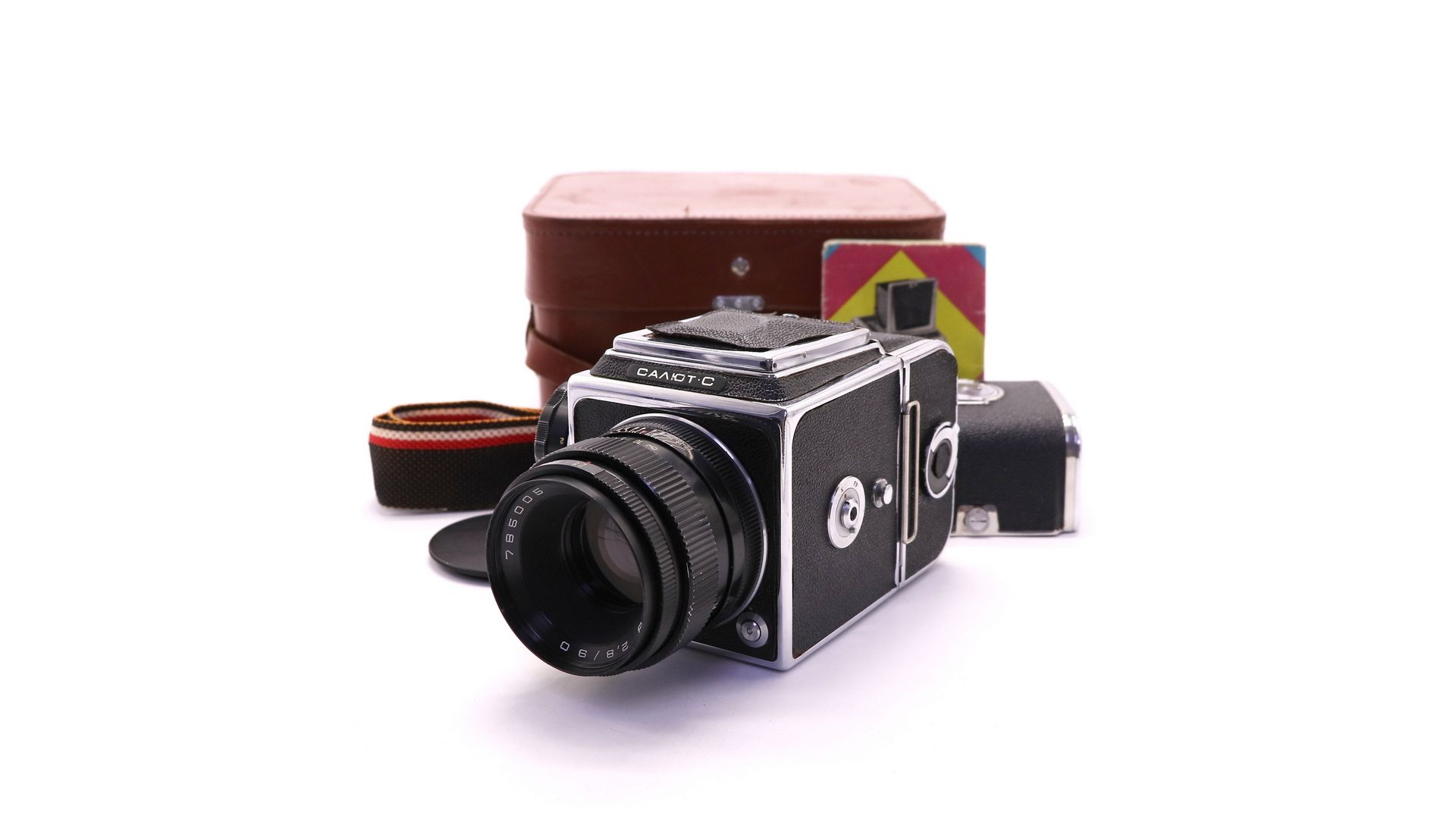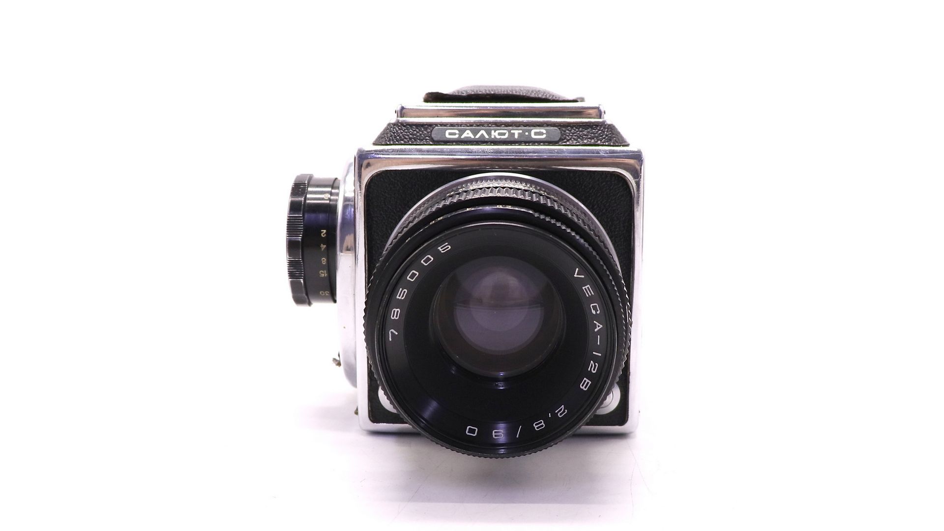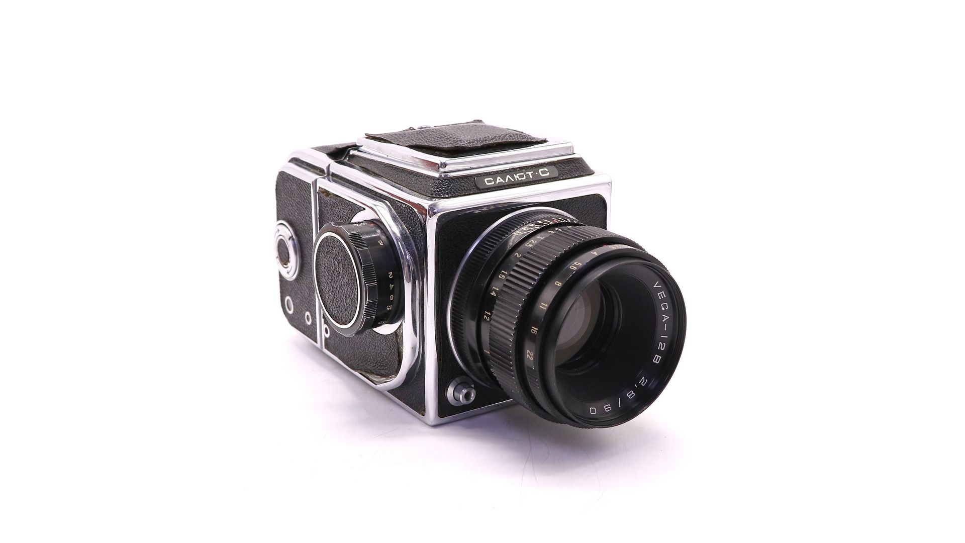 Комплектация:Объектив Вега-12В 2.8/90, передняя крышка, кассета, шахта, кофр, документы, ремень.