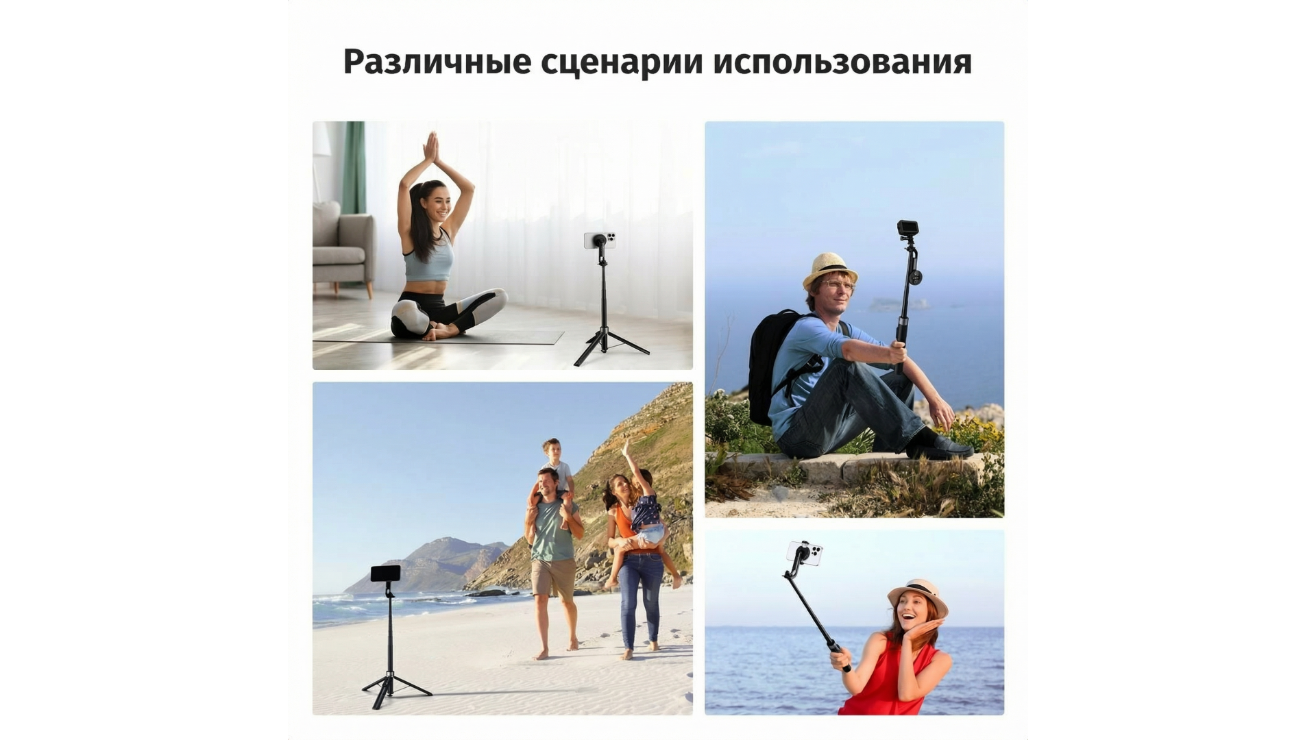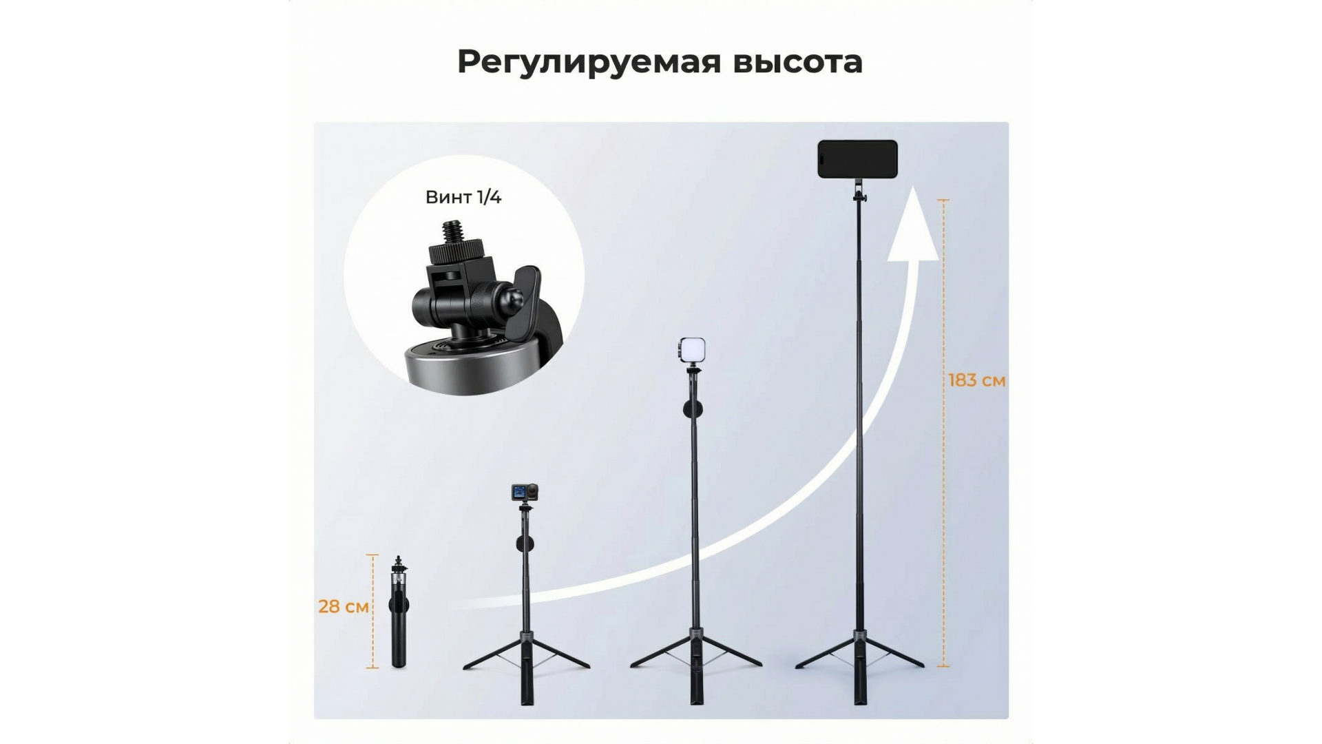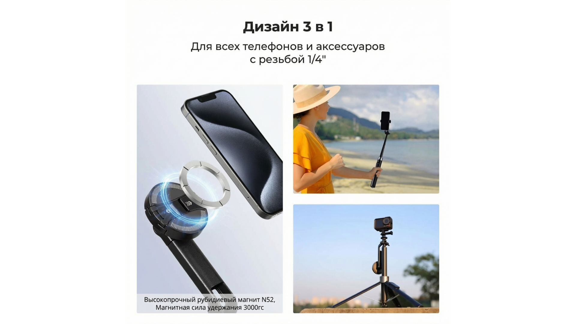 Модель совместима с любыми смартфонами, экшн-камерами и дополнительным оборудованием (микрофоны, подсветка) весом до 400 г. Идеальный выбор для путешествий, влогов и стримов.